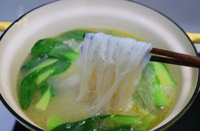 7、把锅里的鸡肉捞出来,放入米粉和青菜,大火烫1~2分钟就可以了。尝一尝味道,如果淡了再补点盐,另外再放点白胡椒粉调味就好了。