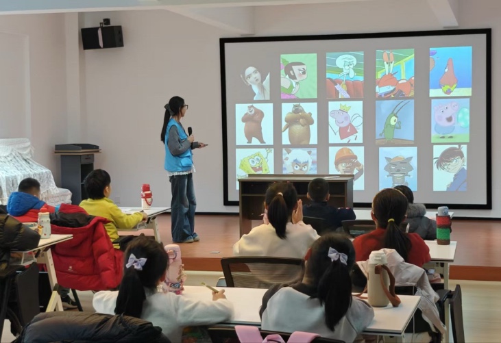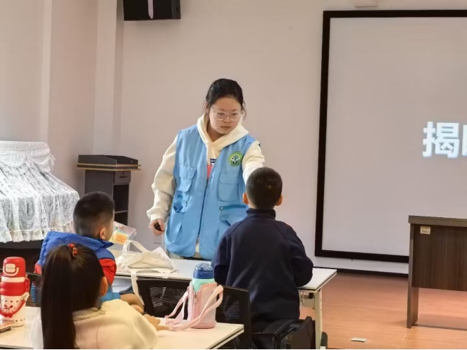 另一组团队成员则化身“小小化学家”,为社区的孩子们带来了一场生动有趣的化学实验课。课程由队员高嘉璐主讲,为了调动孩子们的积极性,课前先以“猫和老鼠”找不同游戏暖场。孩子们在趣味比拼中仔细观察、积极抢答,课堂氛围瞬间活跃起来。