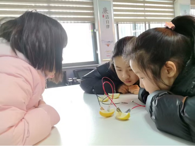游戏结束后,正式进入“水果电池”实验环节。从准备柠檬、硬币、螺丝钉等实验器材,到讲解电极正负极的连接方法,再到观察LED灯发光的奇妙现象,孩子们全程专注投入,亲手操作、认真记录,在实践中直观感受化学的魅力。当看到柠檬电池成功点亮LED灯时,孩子们的欢呼声此起彼伏,科学的种子在他们心中悄然发芽。