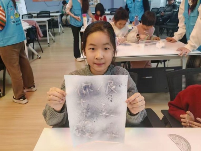 课程最后,队员们带领孩子们完成了“淀粉密信”实验。用棉签蘸取淀粉溶液在纸上写字,待字迹风干后,喷洒碘伏,原本隐形的文字便显现出蓝色。这一“魔法”般的实验,让孩子们惊叹不已,也让他们对化学原理有了更深刻的理解。