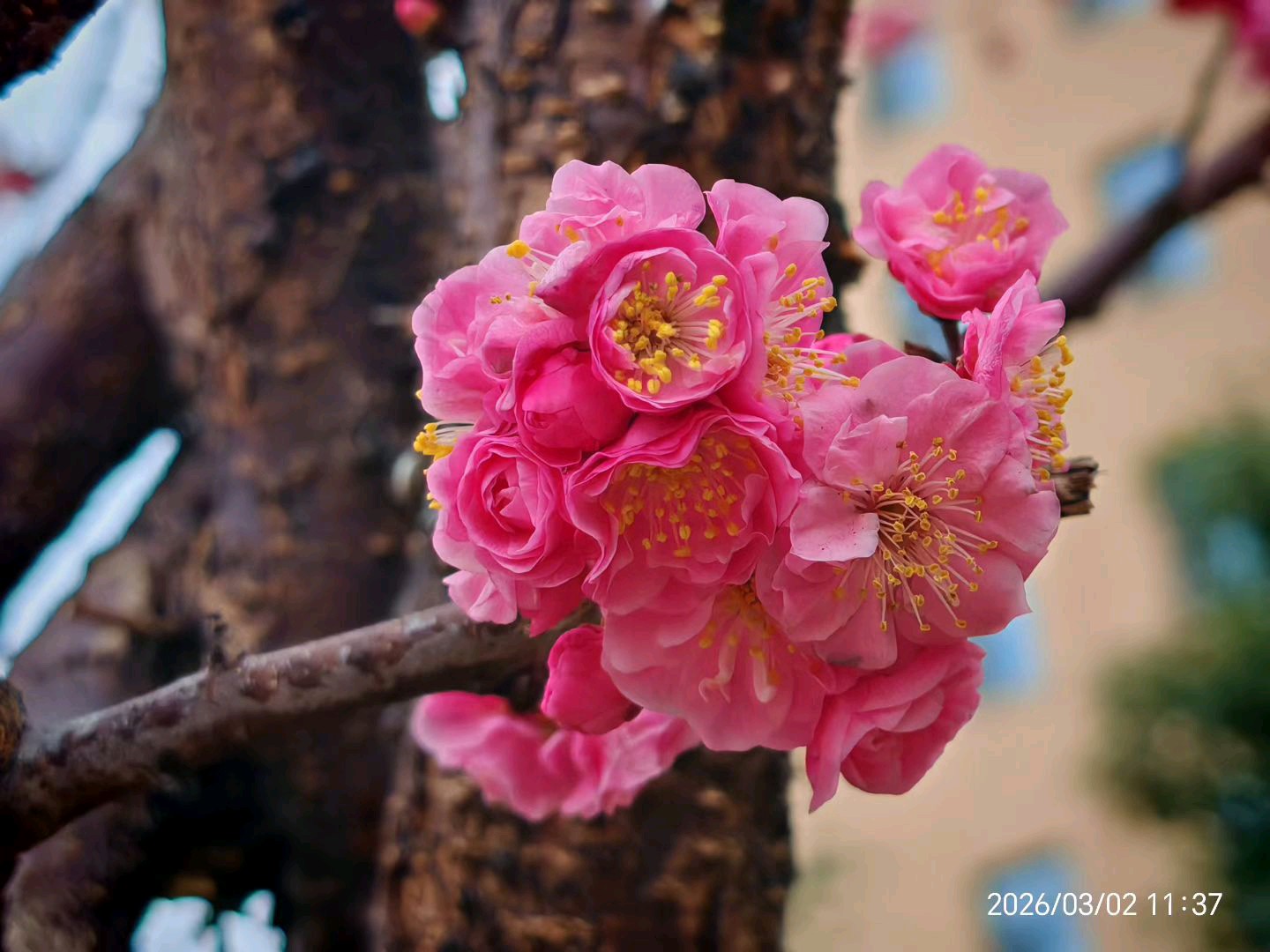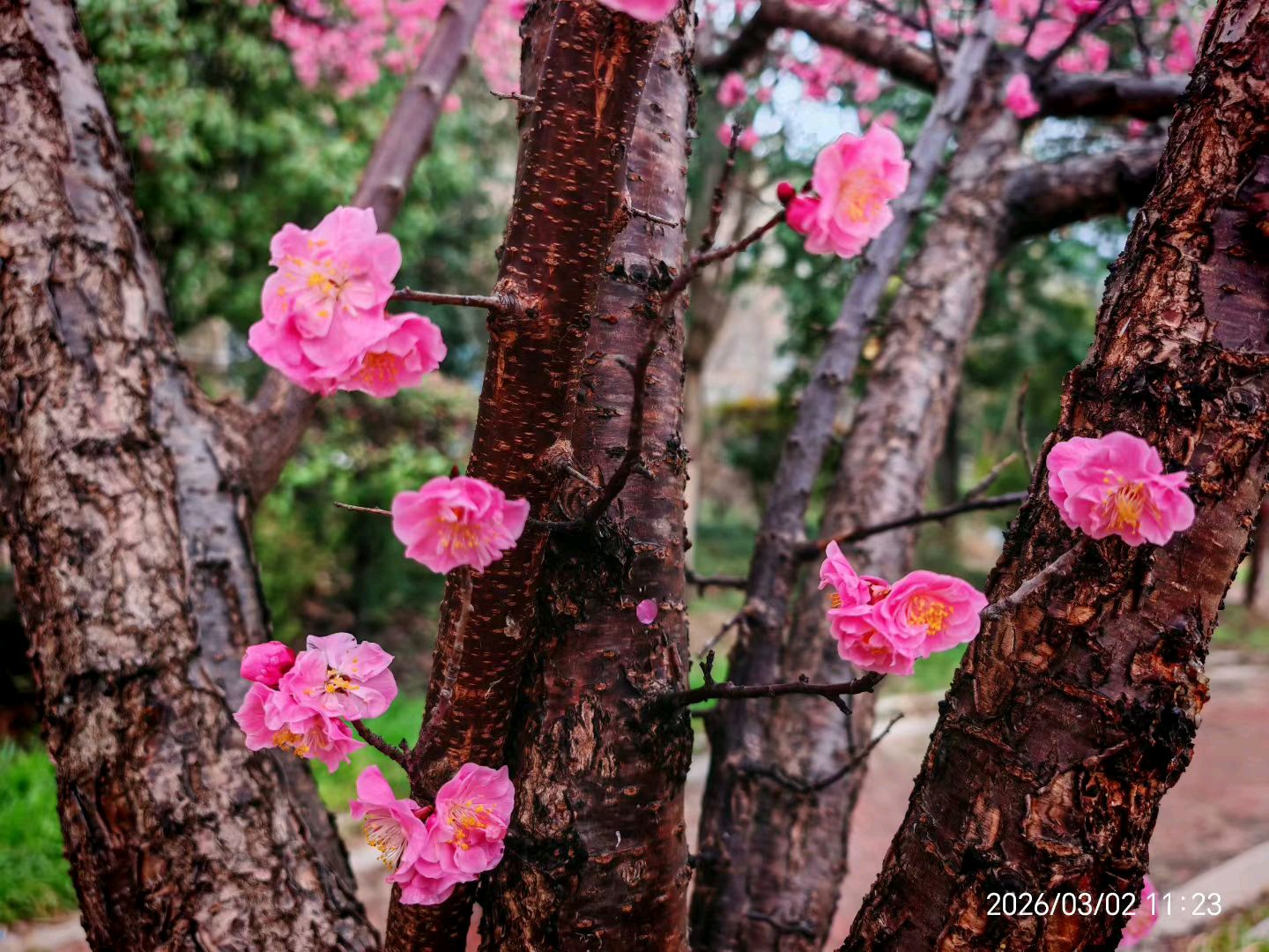 2026 年,今日上班归来,天空阴沉沉的,像是被一块巨大的灰色幕布笼罩着,没有一丝阳光透下来。路过中央花园西边时,一片粉色梅花突然闯入我的视线,瞬间点亮了这略显沉闷的阴天。