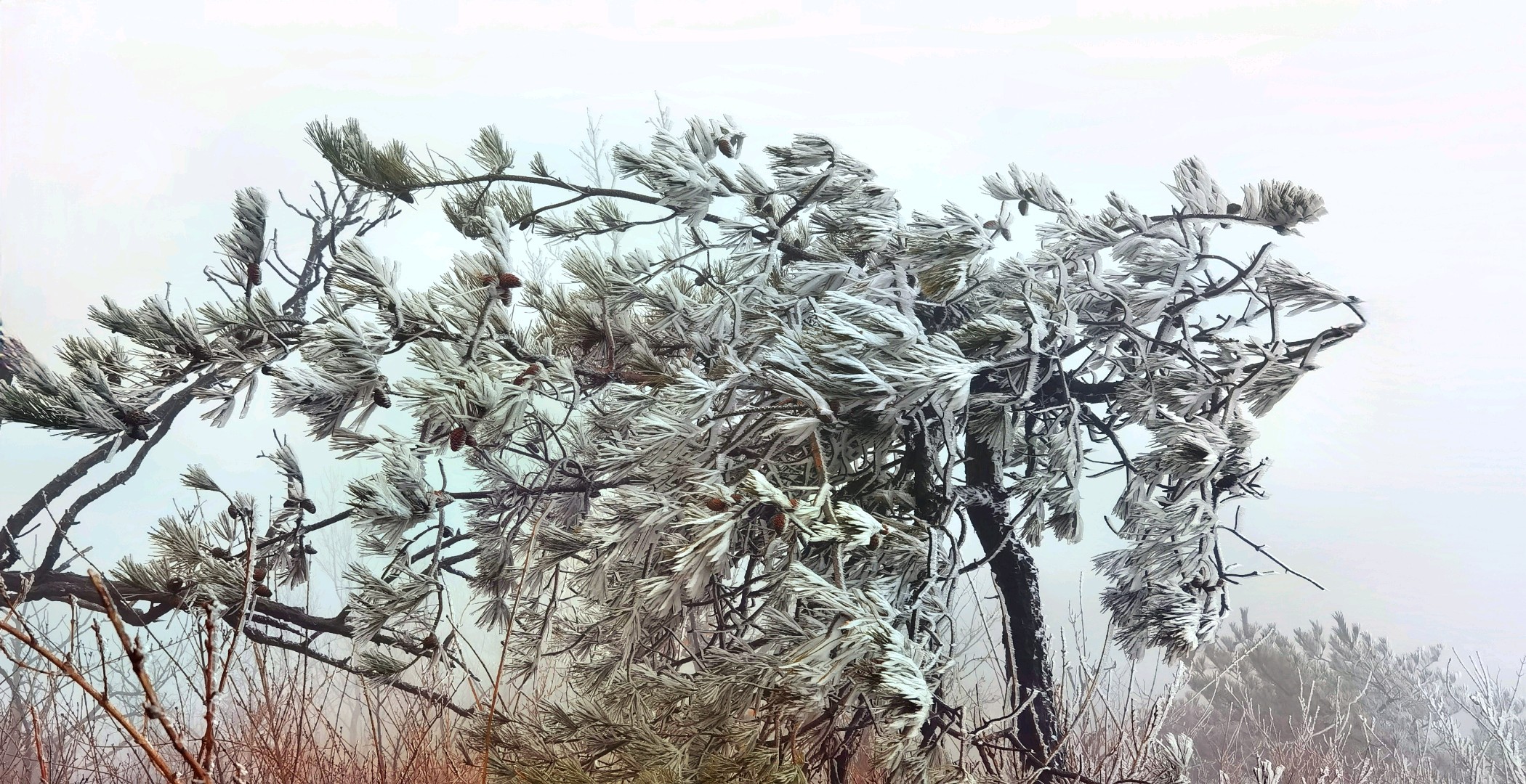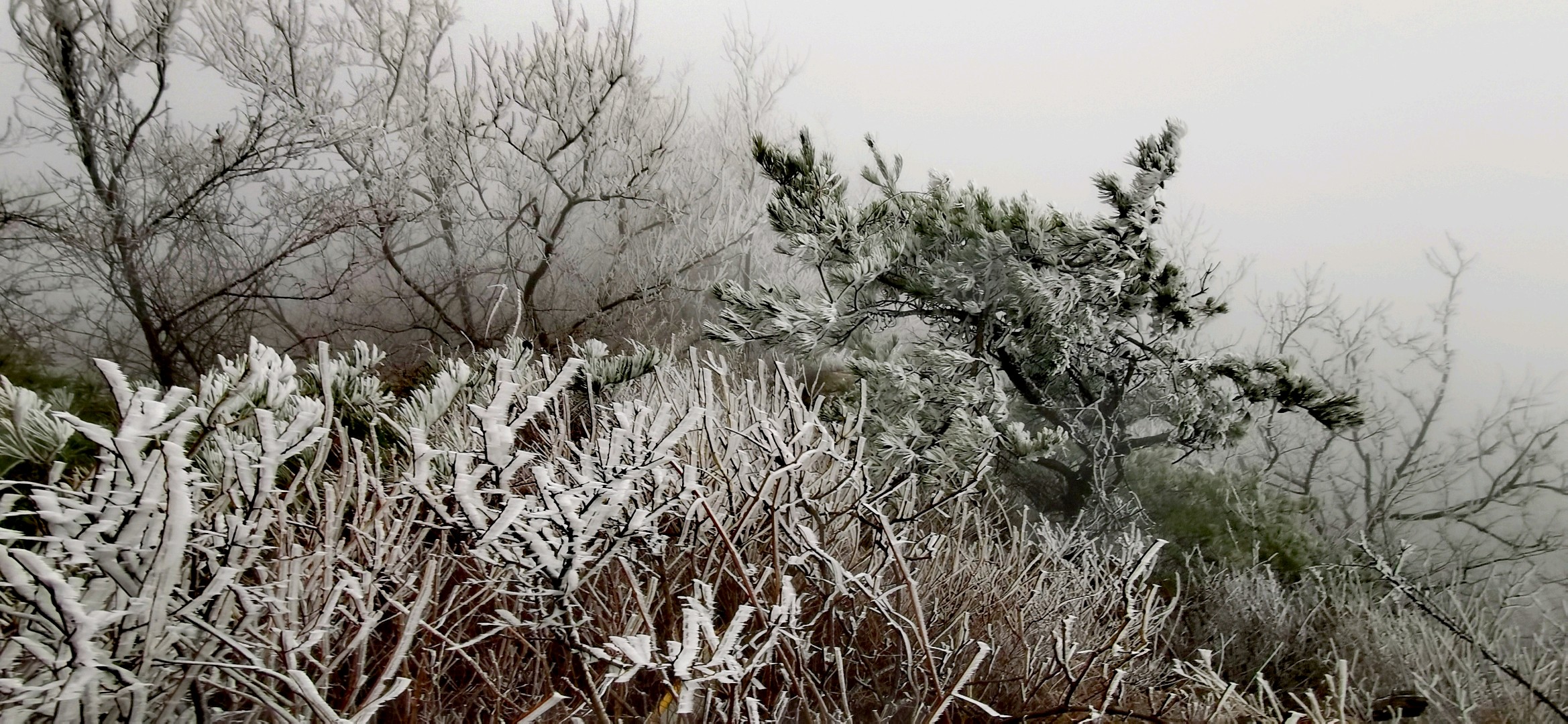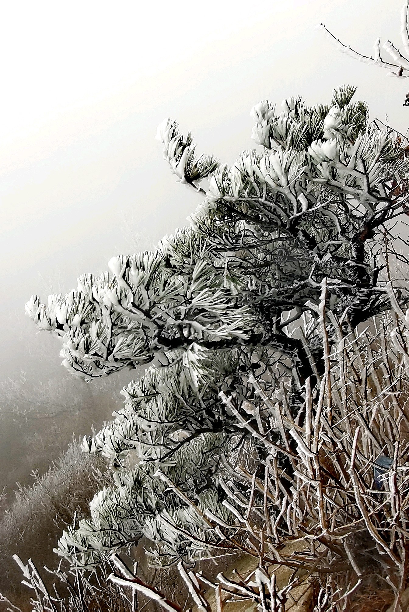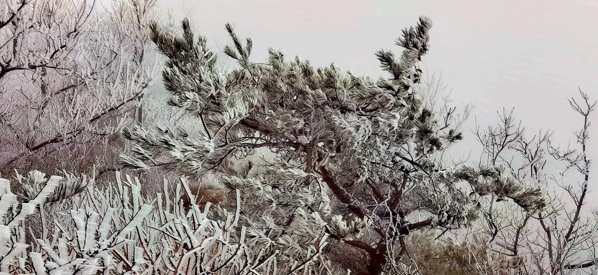 五莲大青山今日再现雾凇奇观】今日大青山云雾笼罩,仿佛是大自然的画笔,勾勒出一幅如梦似幻的冬日仙境。