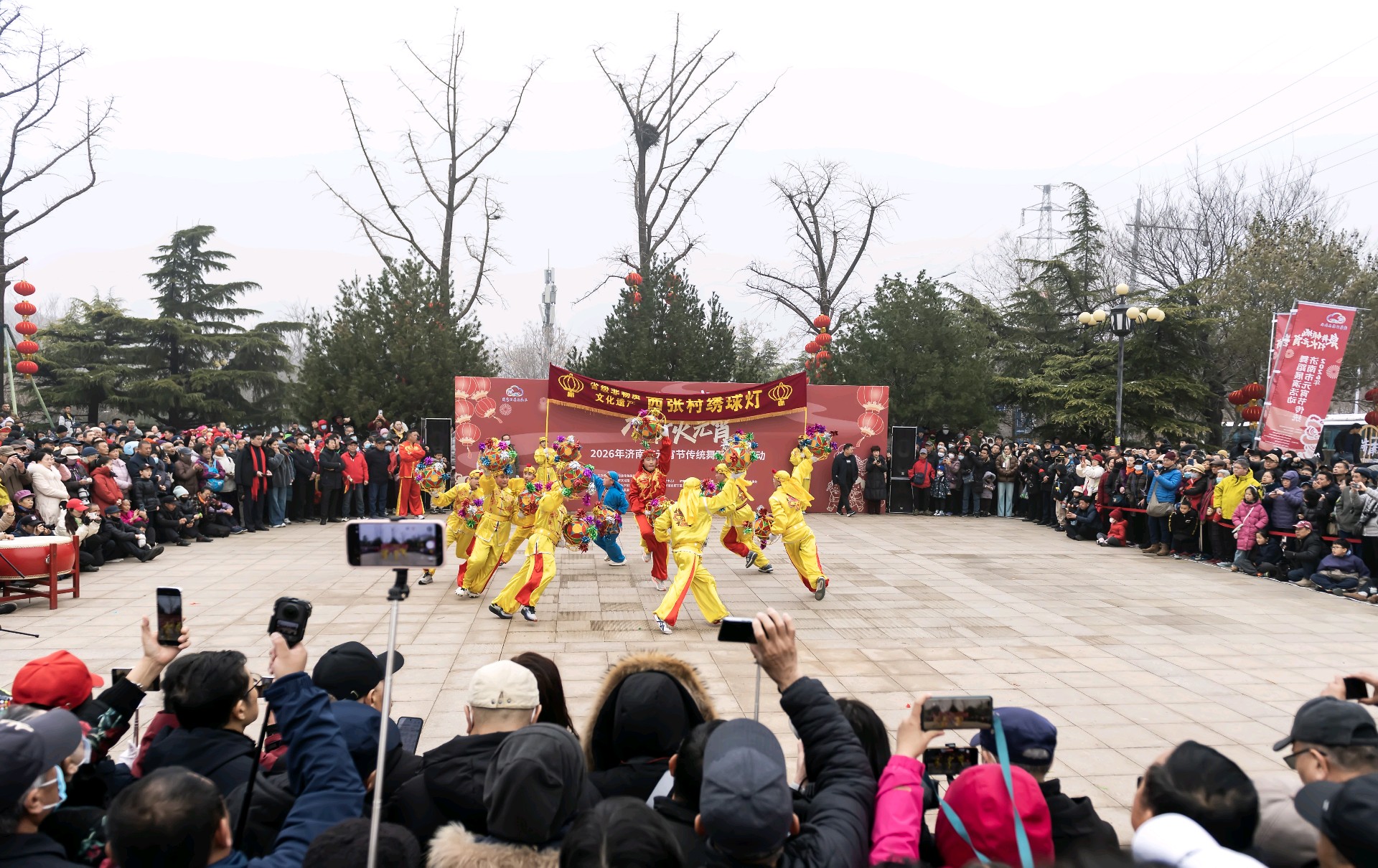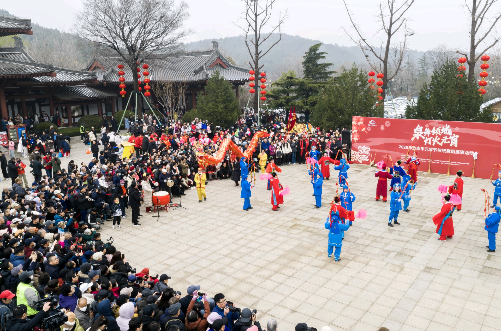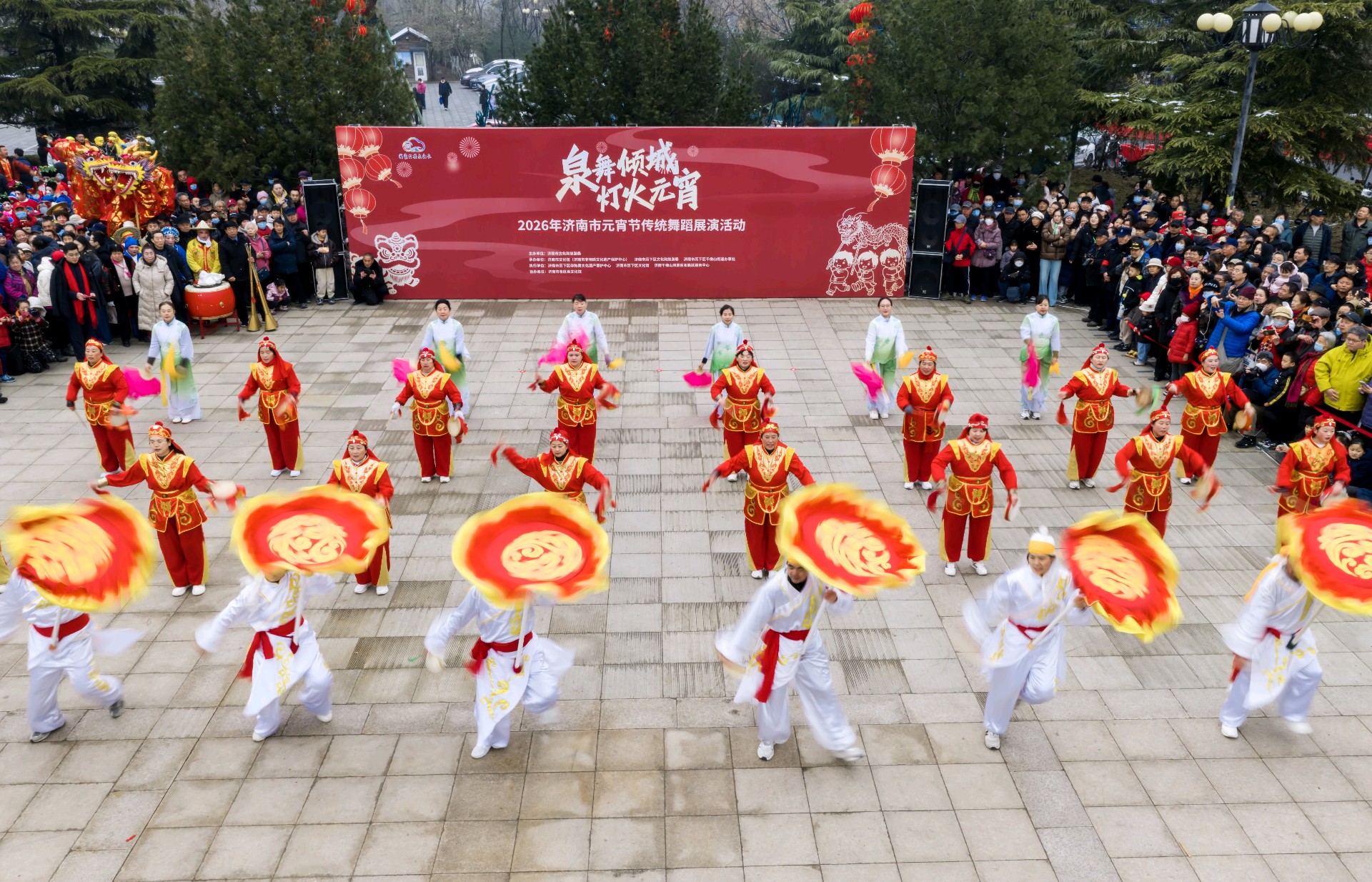 2026.3.3 正月十五上午九点半,泉城济南的千佛山风景区门前,锣鼓喧天,人头攒动,由济南市文旅局、历下区政府以及济南市文化馆、非遗保护中心共同主办的"泉舞倾城,灯火元宵"非遗舞蹈展演活动隆重开演。由兴隆舞龙队、济阳和商河的鼓子秧歌以及西张绣球灯等节目轮翻上演,精彩纷呈,现场吸引了众多的市民前来观看,共同喜庆元宵佳节,济南市的新闻媒体和济南市摄影家协会的众多摄影师进行了现场拍摄报导。