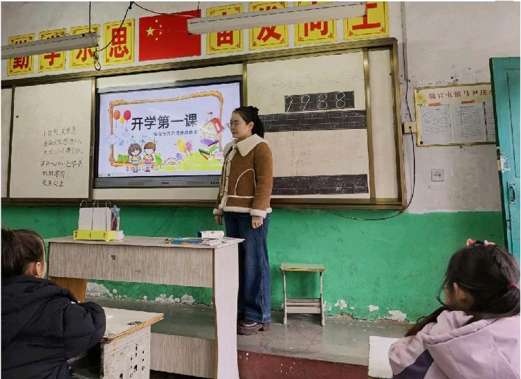 授课过程中,老师始终保持与学生的积极互动,通过提问、讲解、示范相结合的方式,引导学生主动思考安全问题,牢记安全准则。台下的学生们坐姿端正、认真聆听,不时点头回应,将安全知识深深印在脑海中。黑板上“开开心心上学去,好好学习,天天向上”的寄语,与课堂上的安全主题相得益彰,既传递了新学期的美好期许,也凸显了安全对于成长的重要意义。