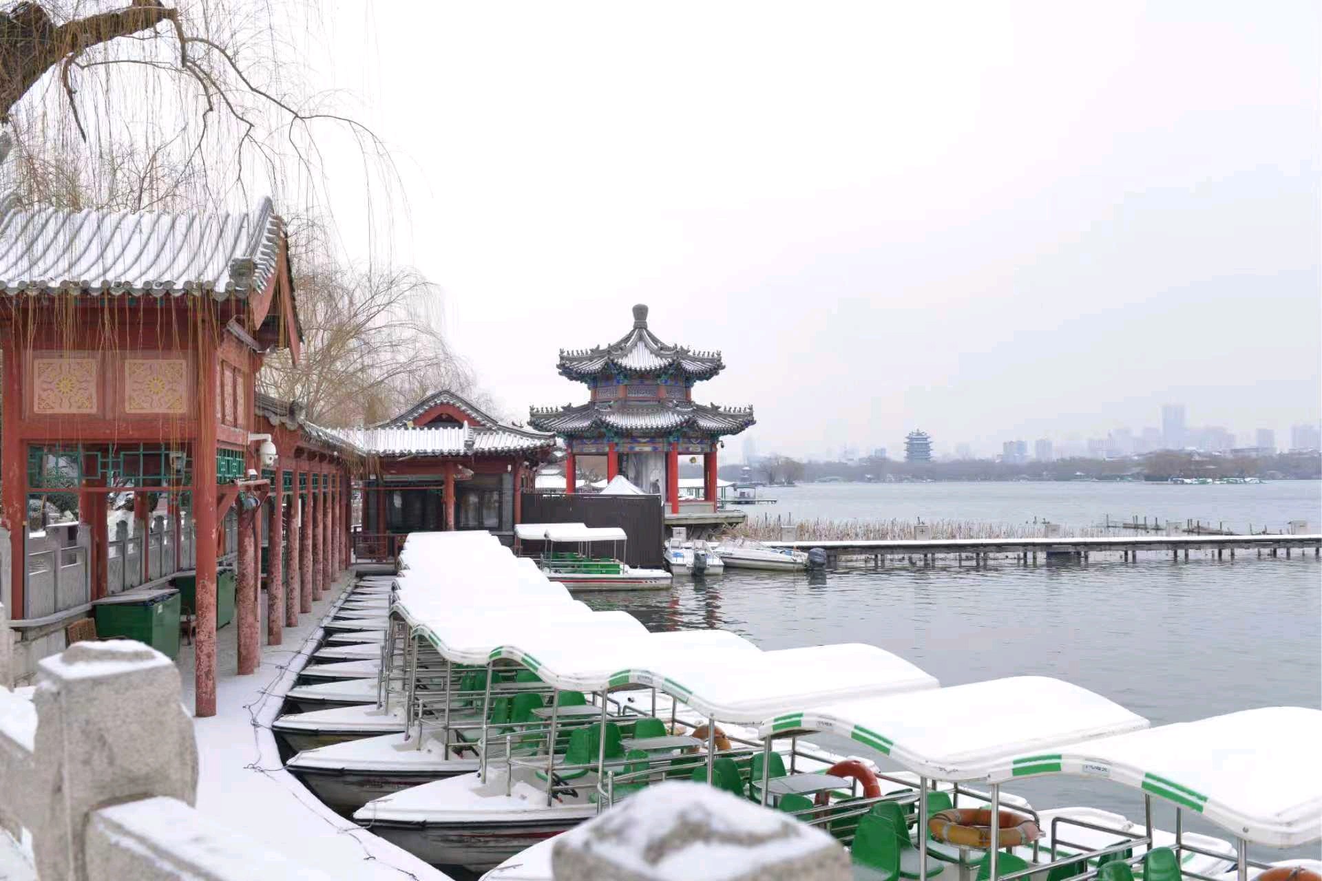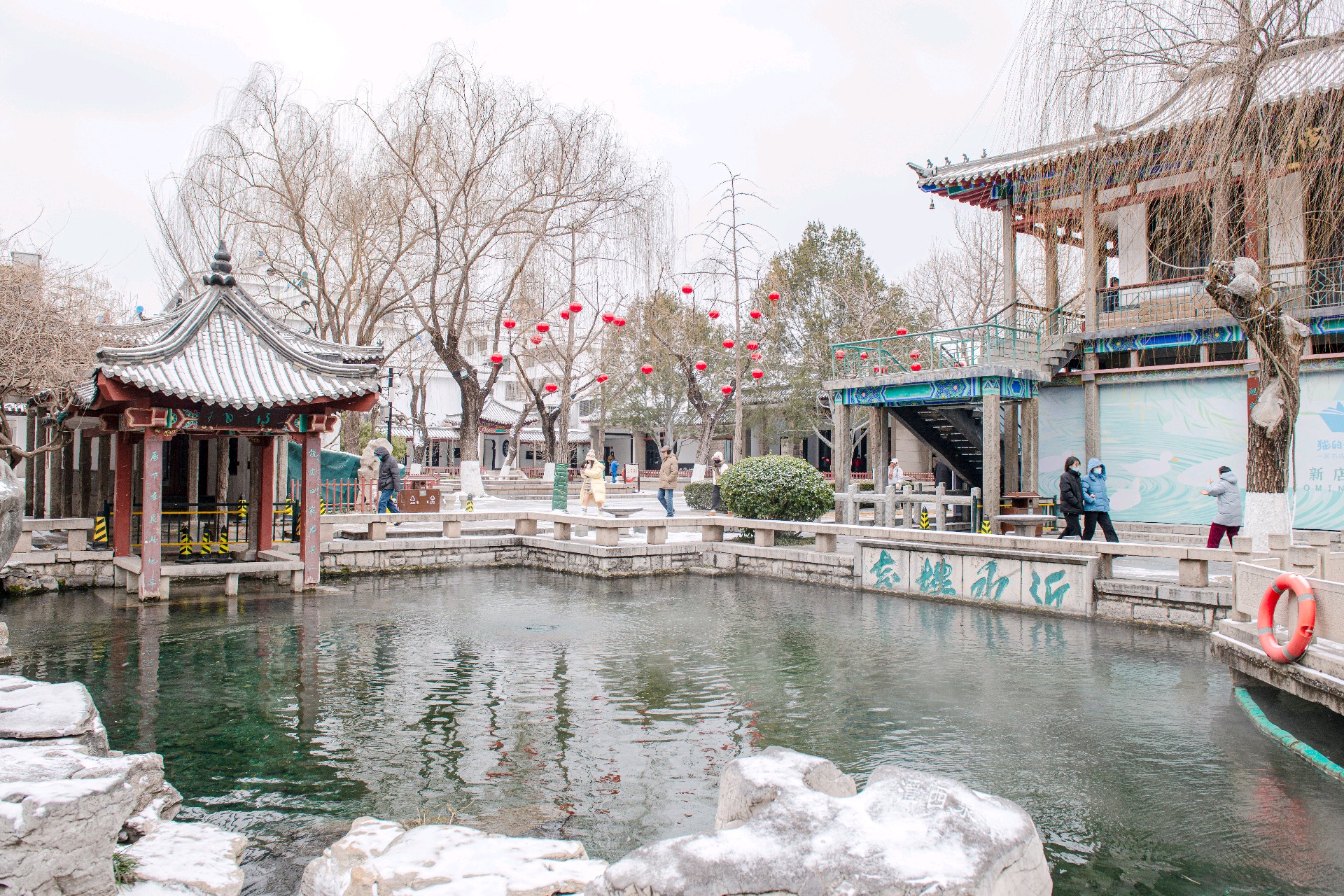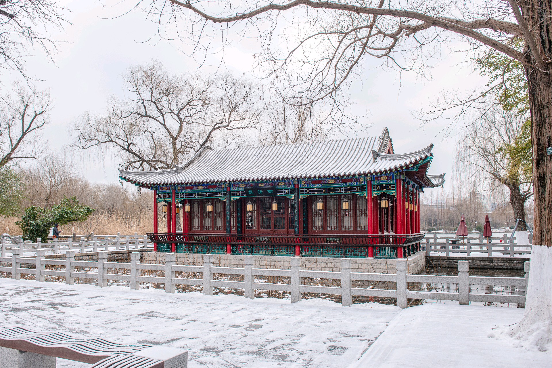冬日古园,碧波荡漾,红梅点缀,游客漫步。亭台楼阁倒影水中,仿佛置身画中。
