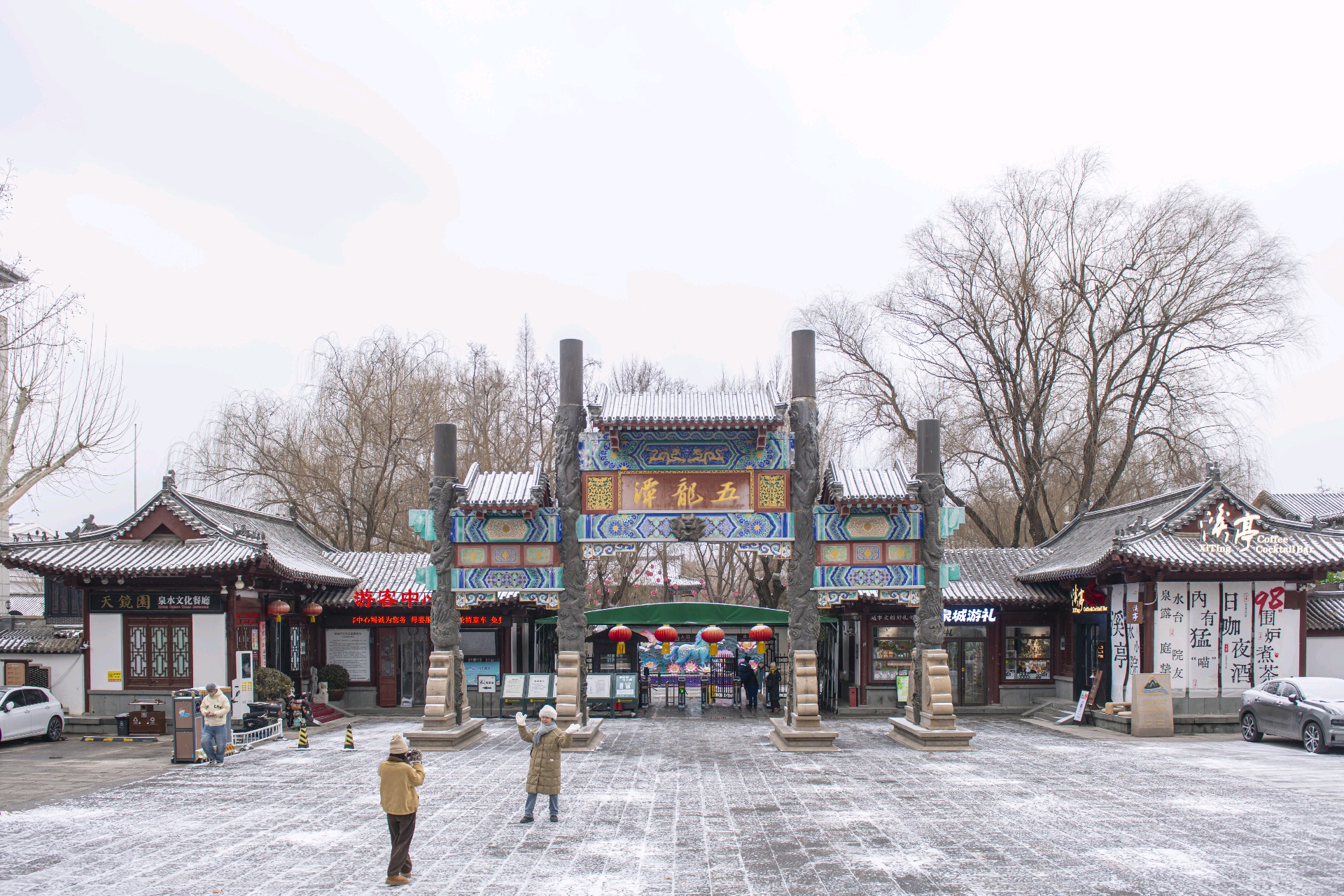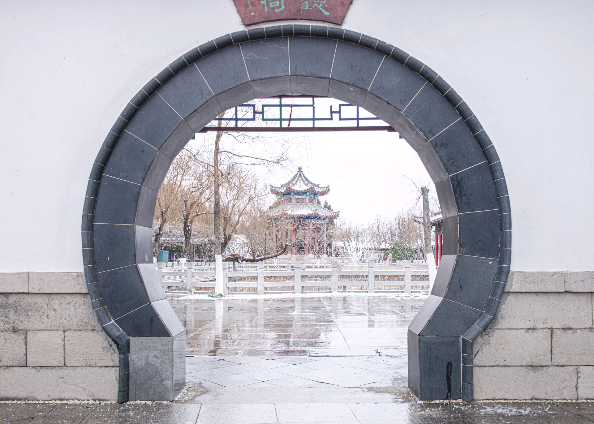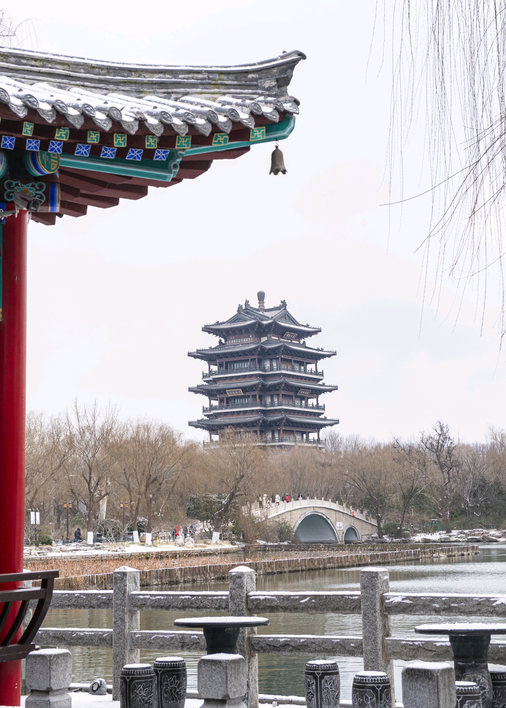 冬日古园,碧波荡漾,红梅点缀,游客漫步。亭台楼阁倒影水中,仿佛置身画中。