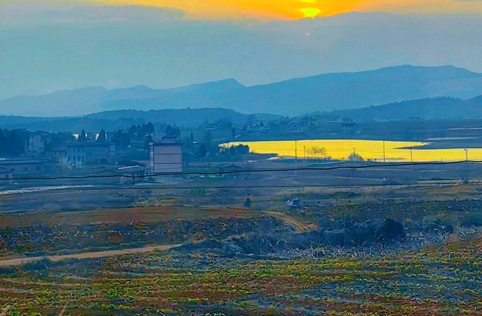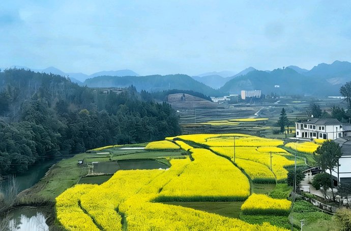 田埂上的油菜花攒着劲儿开,金红明艳,风过时掀起层层浪,甜香顺着窗缝往车里钻。远山被云雾缠着,像蒙了层薄纱,青黛色的山尖时隐时现,像在跟我们躲猫猫。
