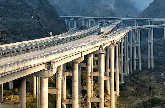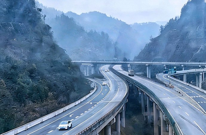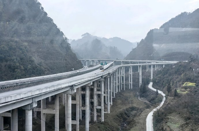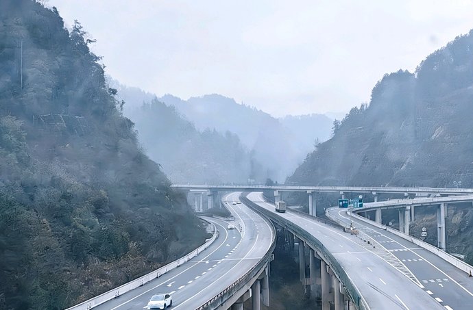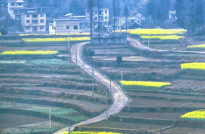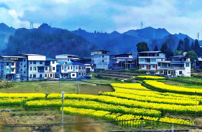 银灰色的立交桥最是特别,盘绕在山坳与花田之间,硬朗的线条竟和柔美的春景融在了一起,一头连着热闹的村寨,一头伸向云深的山巅。