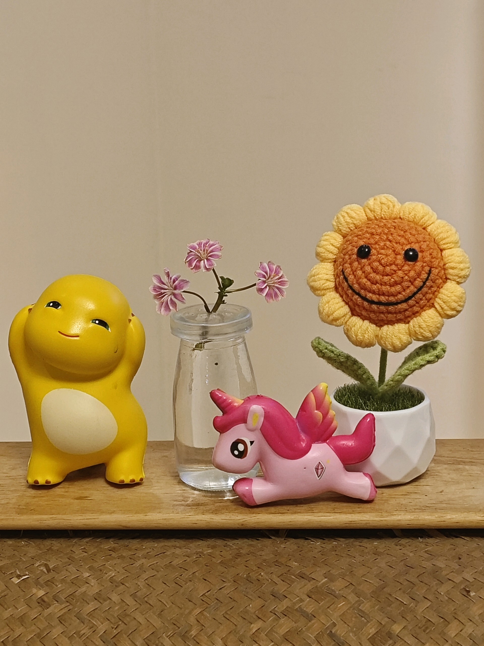 奶龙憨笑,护得春多少。粉驹踏雪风前飘,手作葵花正笑。