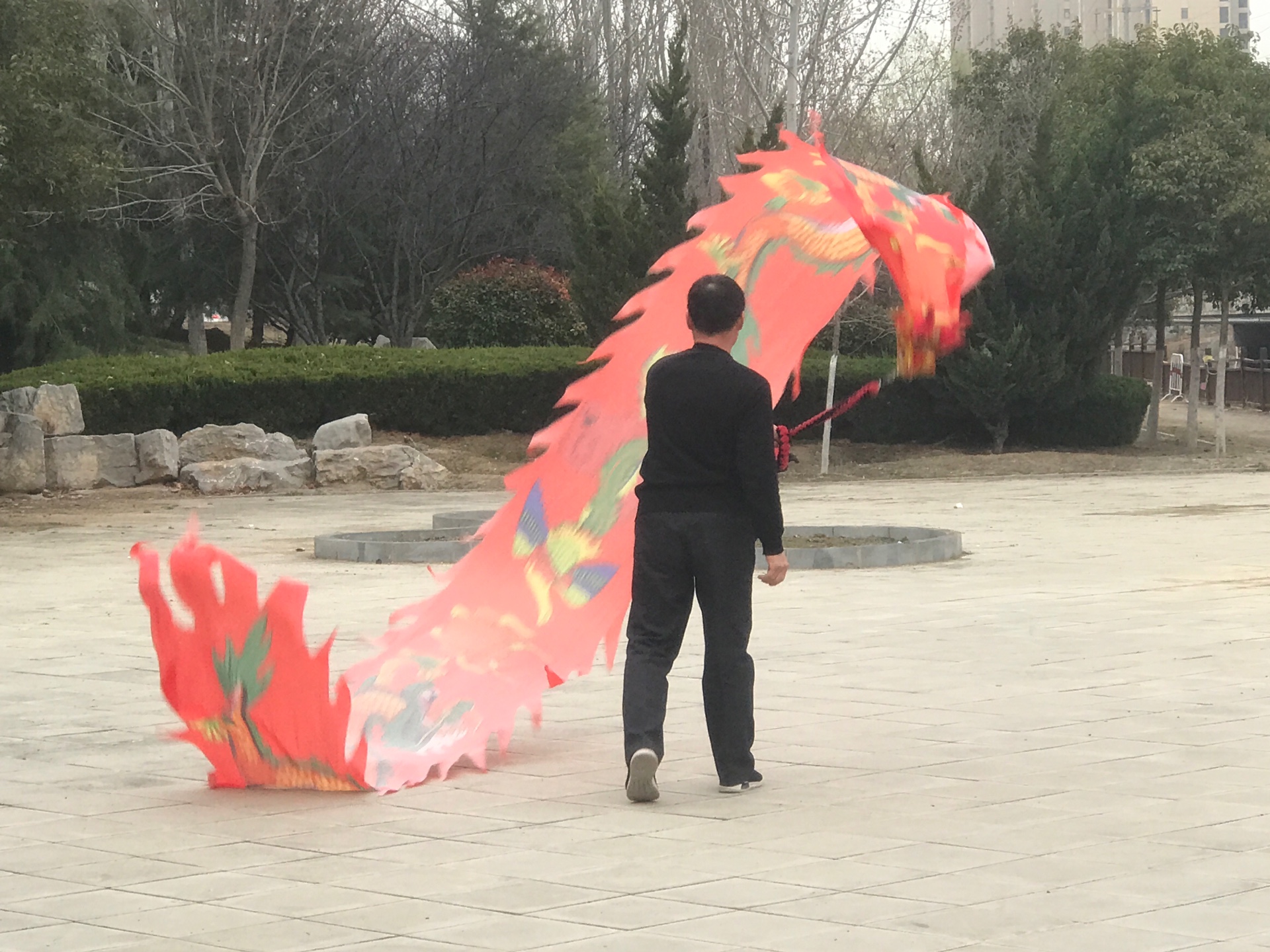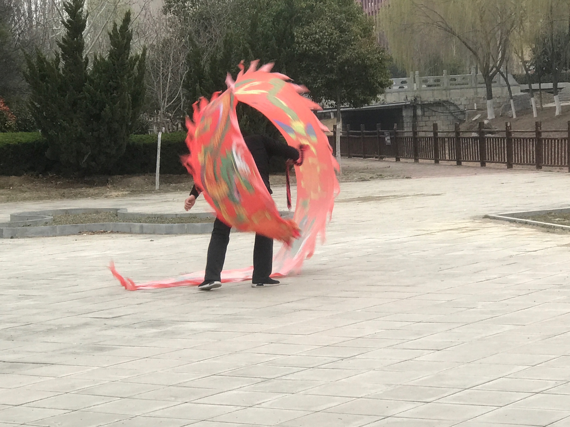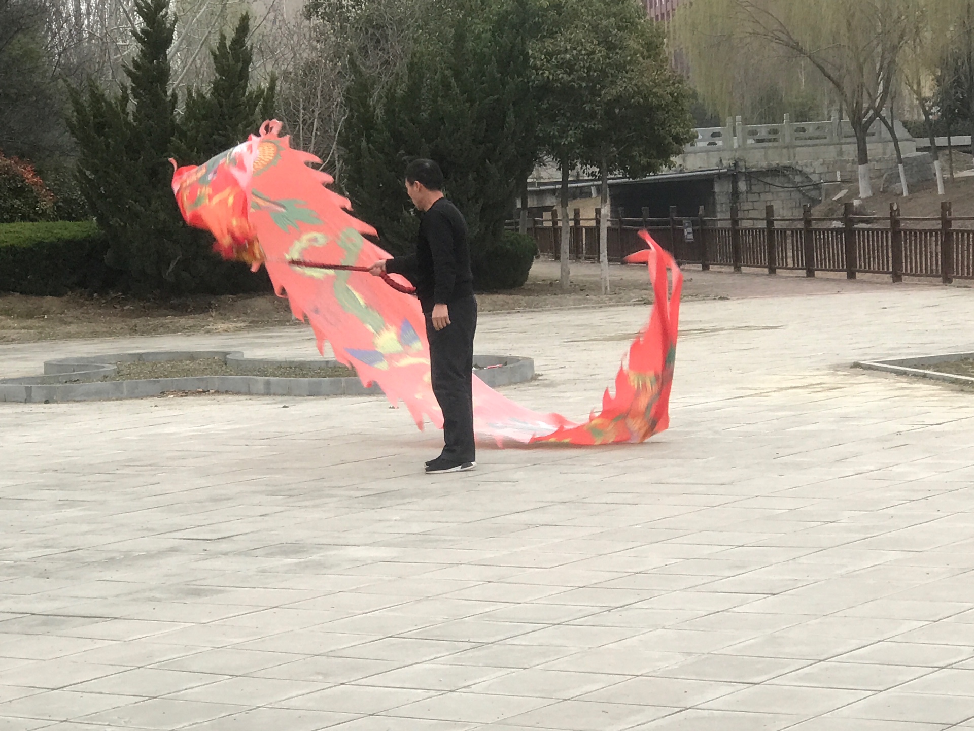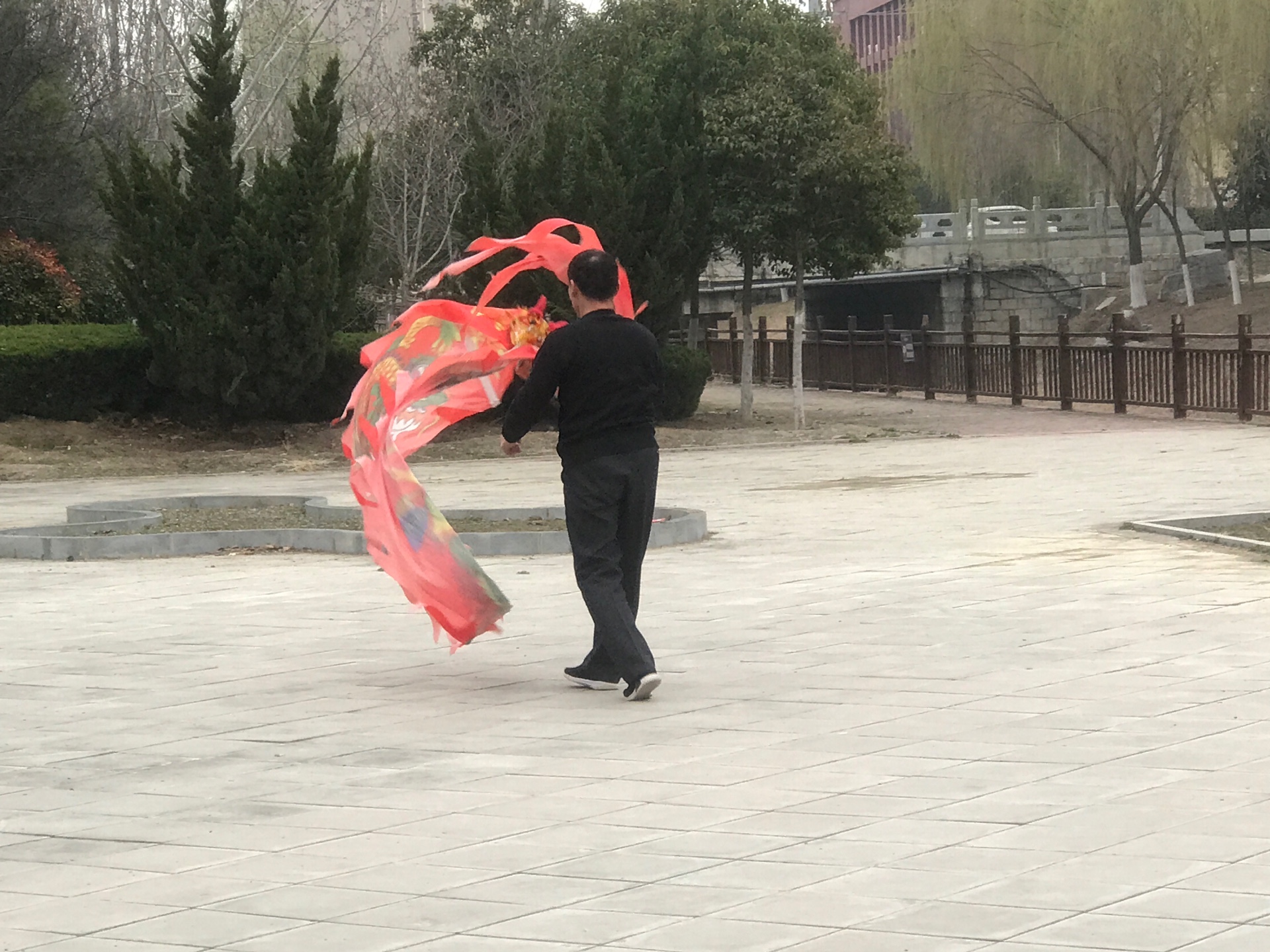 周末,在宁阳县团结路附近的“健身小广场”,一市民正挥舞“彩带龙”;或抛、或转、或仰,彩龙飞舞,红红火火;舞出了健康、舞出了人们的精气神。
