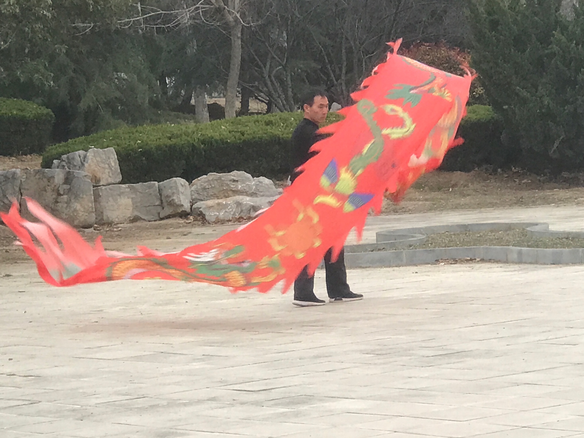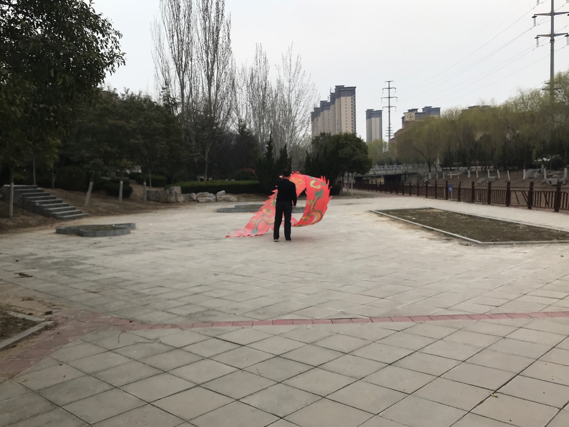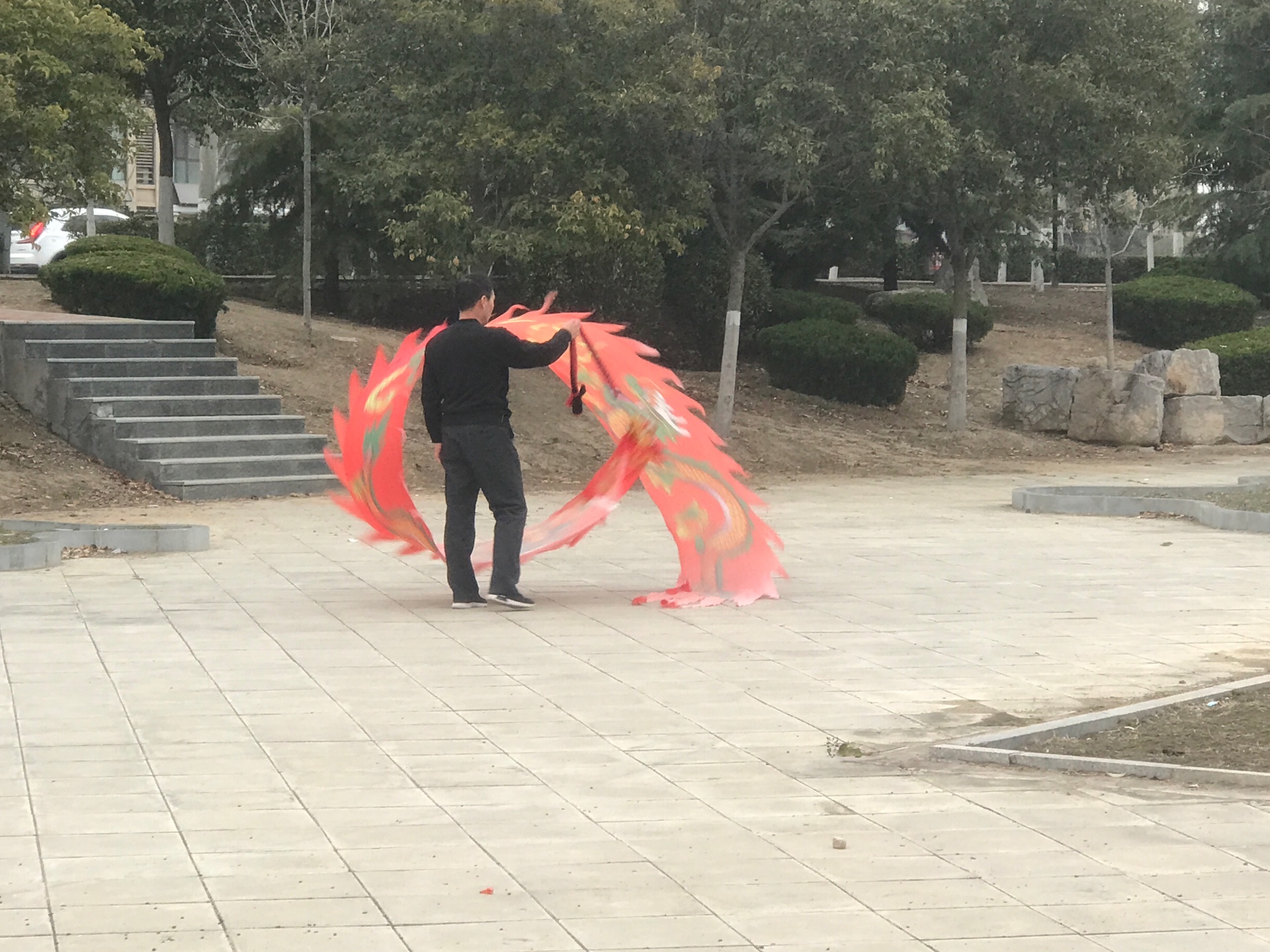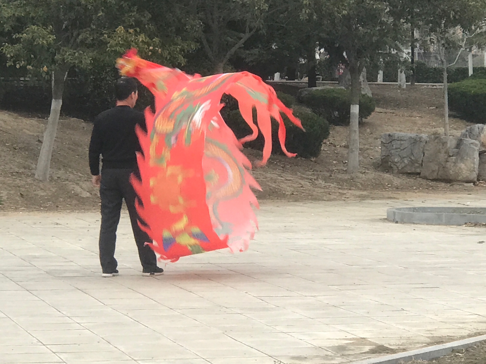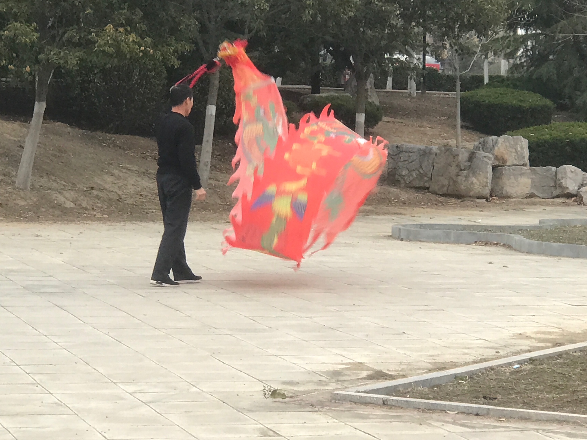周末,在宁阳县团结路附近的“健身小广场”,一市民正挥舞“彩带龙”;或抛、或转、或仰,彩龙飞舞,红红火火;舞出了健康、舞出了人们的精气神。