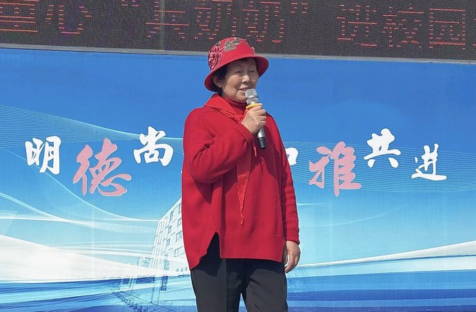 参观结束,学生代表为齐奶奶佩戴红领巾。随后,齐奶奶在主席台前动情叮嘱孩子们:要学会感恩,心中有爱;要锻炼身体,保持阳光心态,做到身心两健;要少玩手机,发挥自身优势,努力成为闪闪发光的好少年。朴实的话语,深深打动了在场师生。