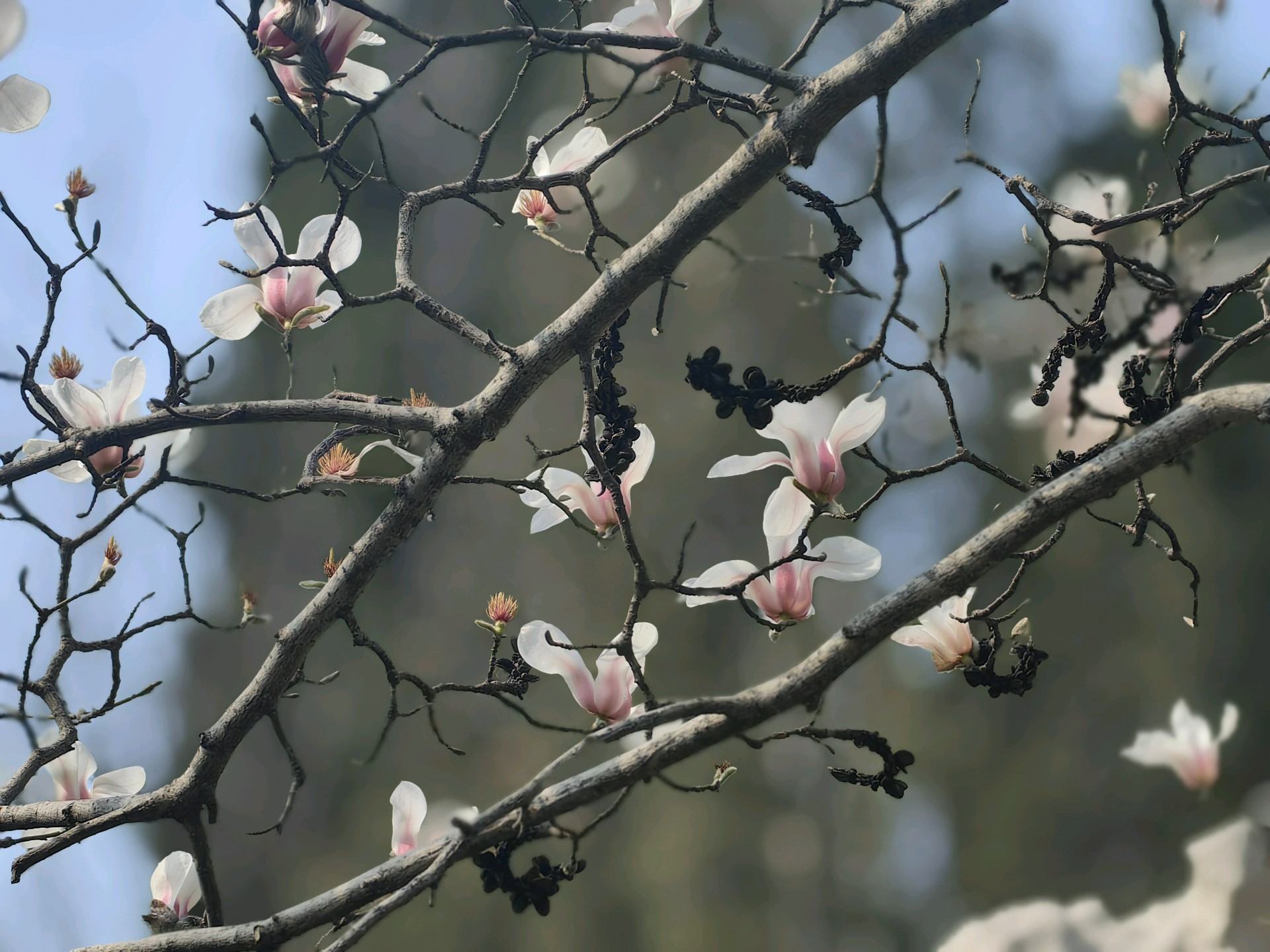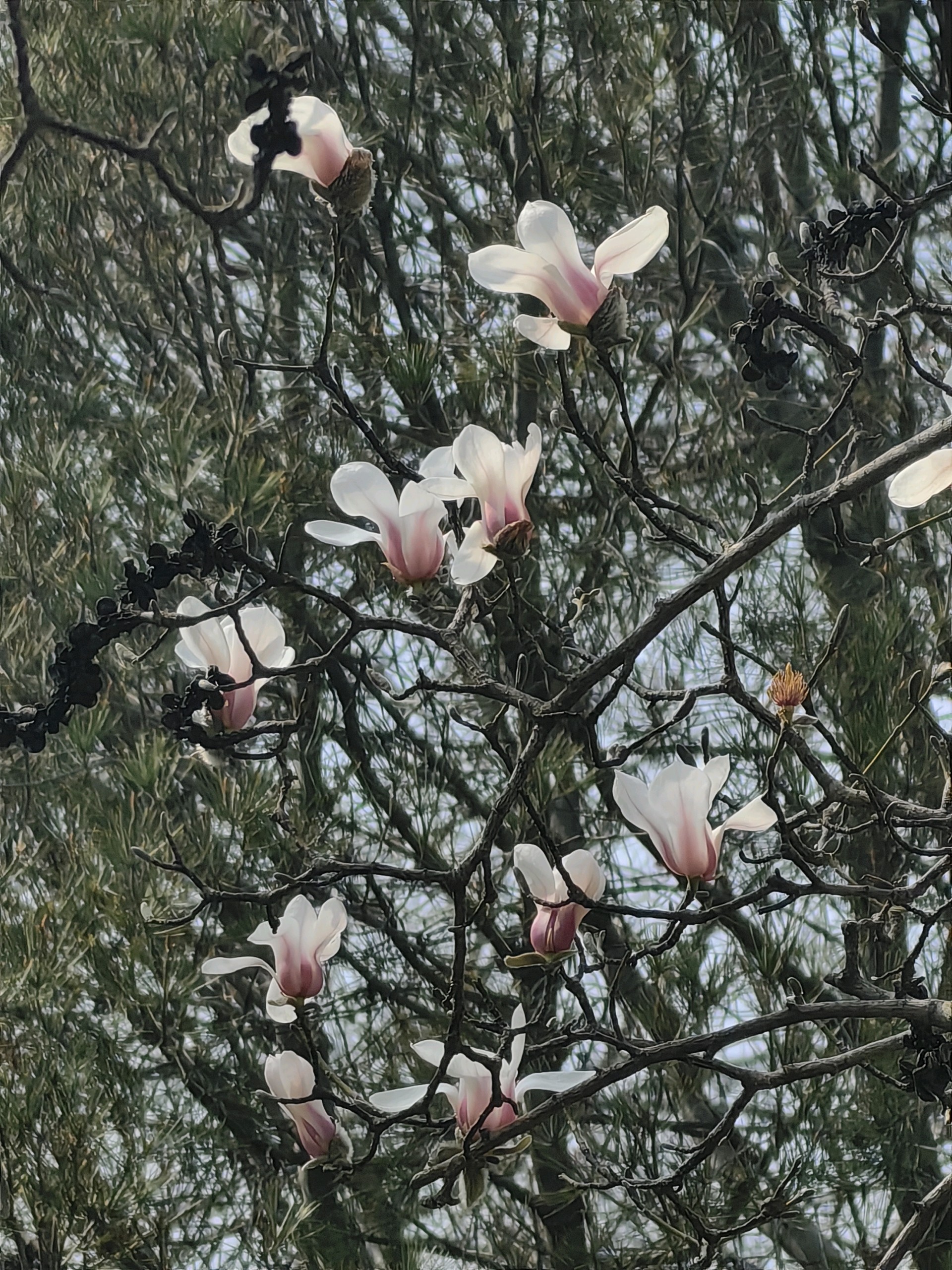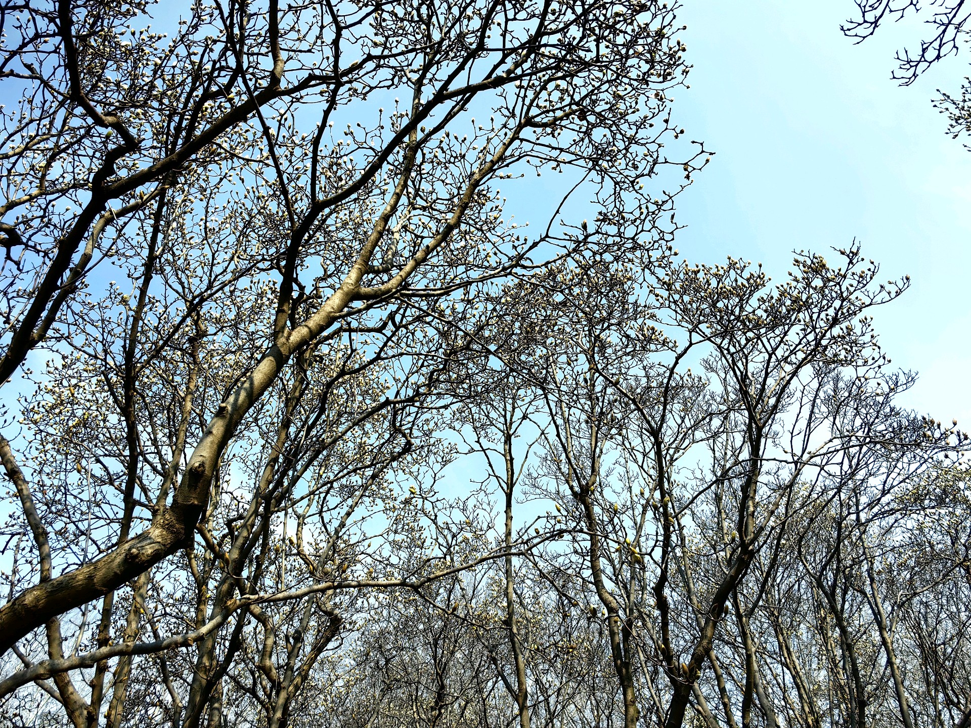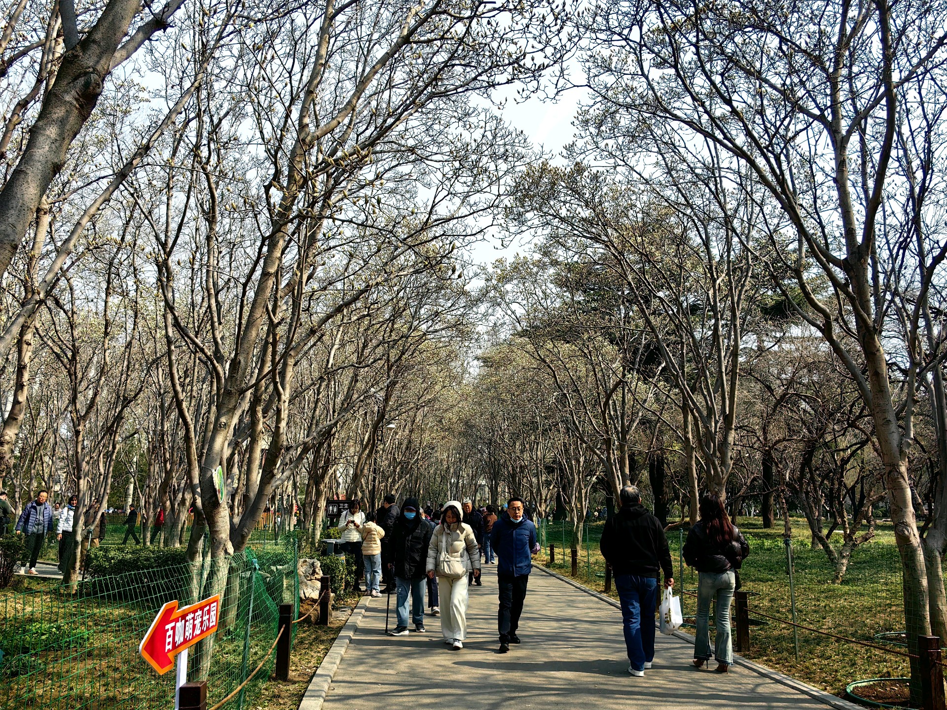百花公园玉兰花开,阳光透过树枝洒下,为大地增添了生机。人们用手机记录下这美好的瞬间。