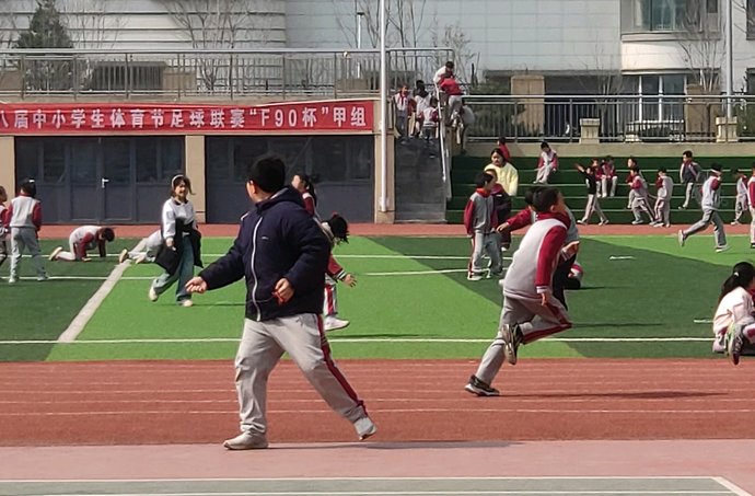 绿茵场上,同学们三两结伴,手持五彩风筝,奔跑、拉线、放飞。蝴蝶、金鱼、雄鹰等造型各异的风筝乘风而起,在蓝天中自由翱翔,与白云相映成趣。大家互相配合、彼此加油,清脆的笑声在校园里久久回荡。