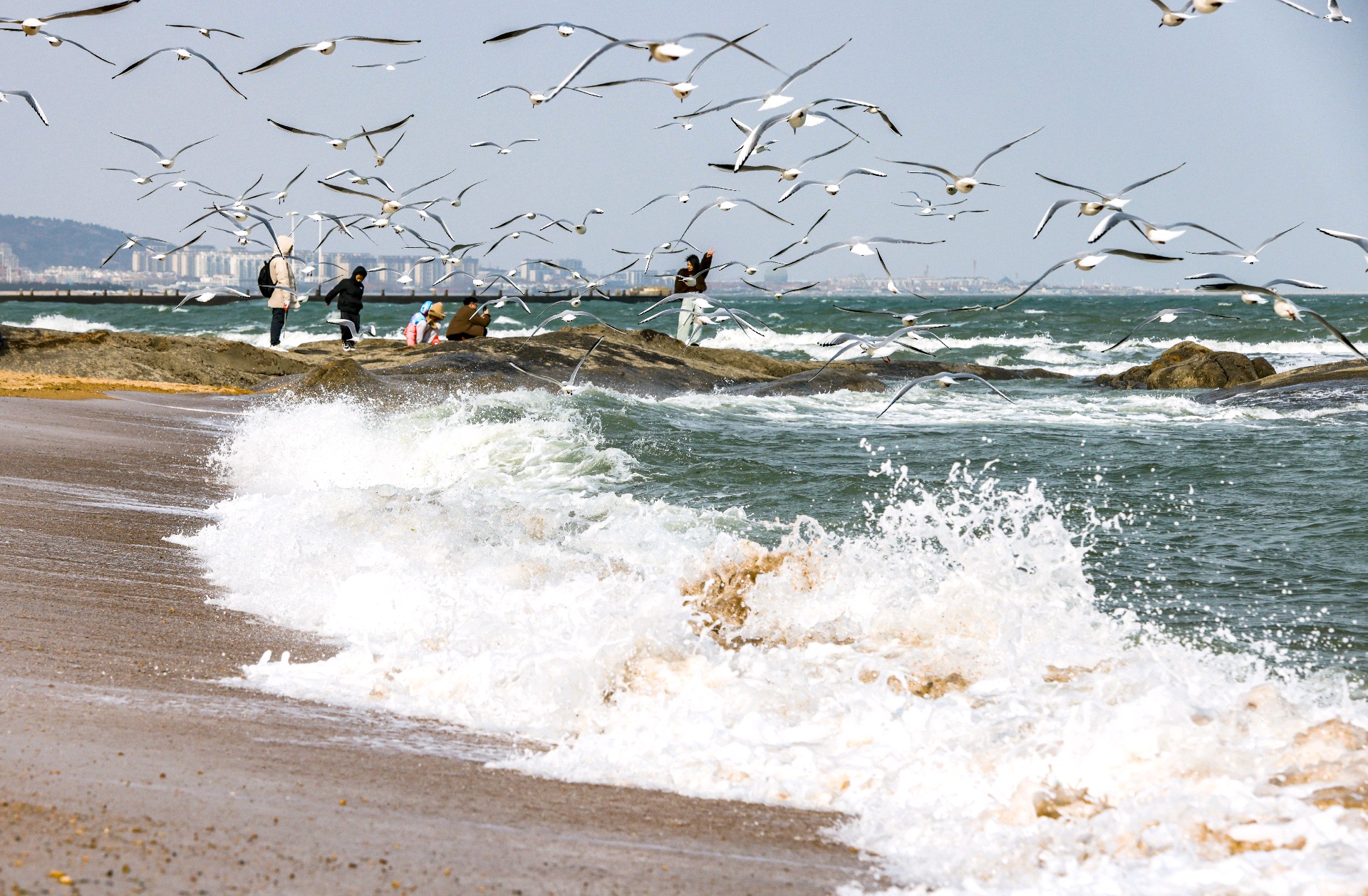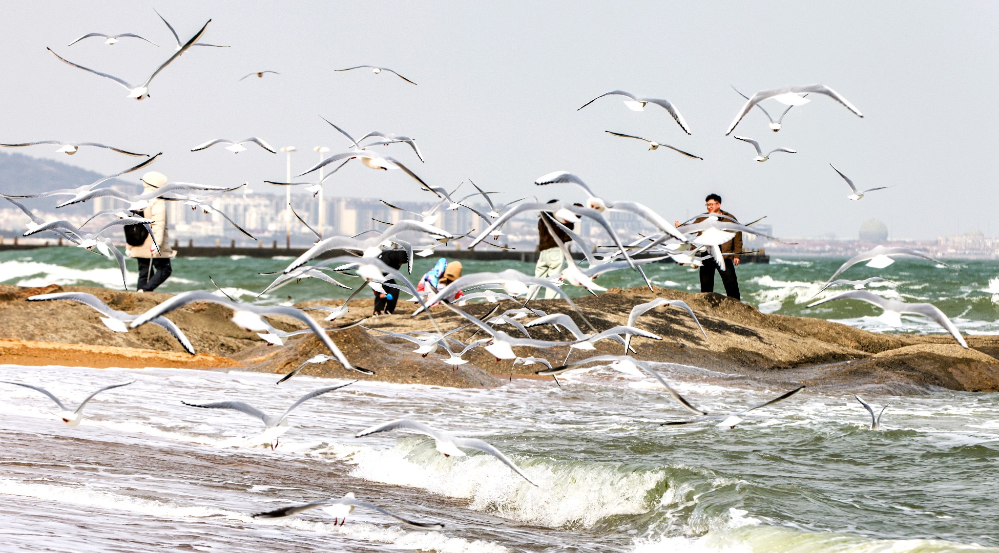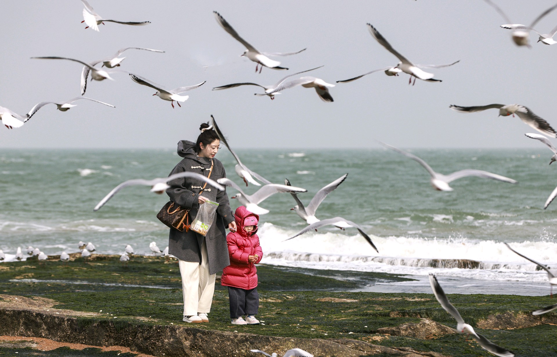 2026年3月10日,山东省日照市灯塔风景区,游客与市民来观赏投喂海鸥,随着来日照越冬的海鸥越来越多,来海边看海鸥成为日照市旅游的一张新名片。