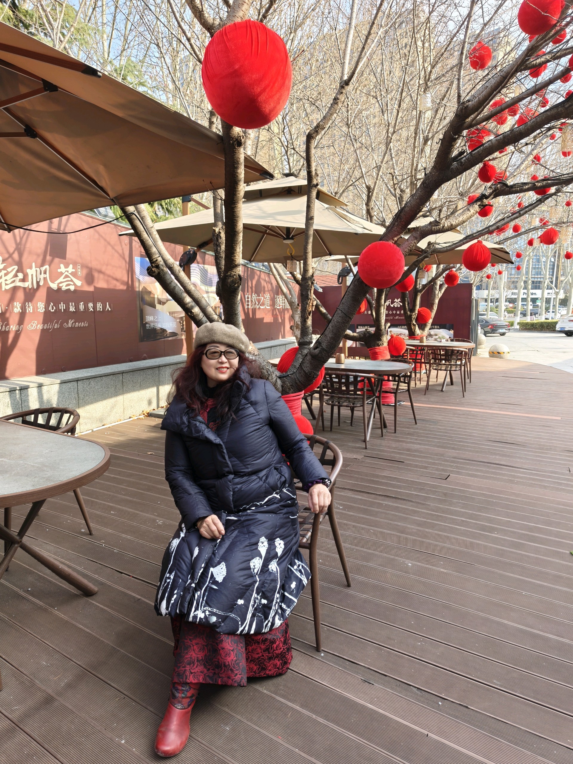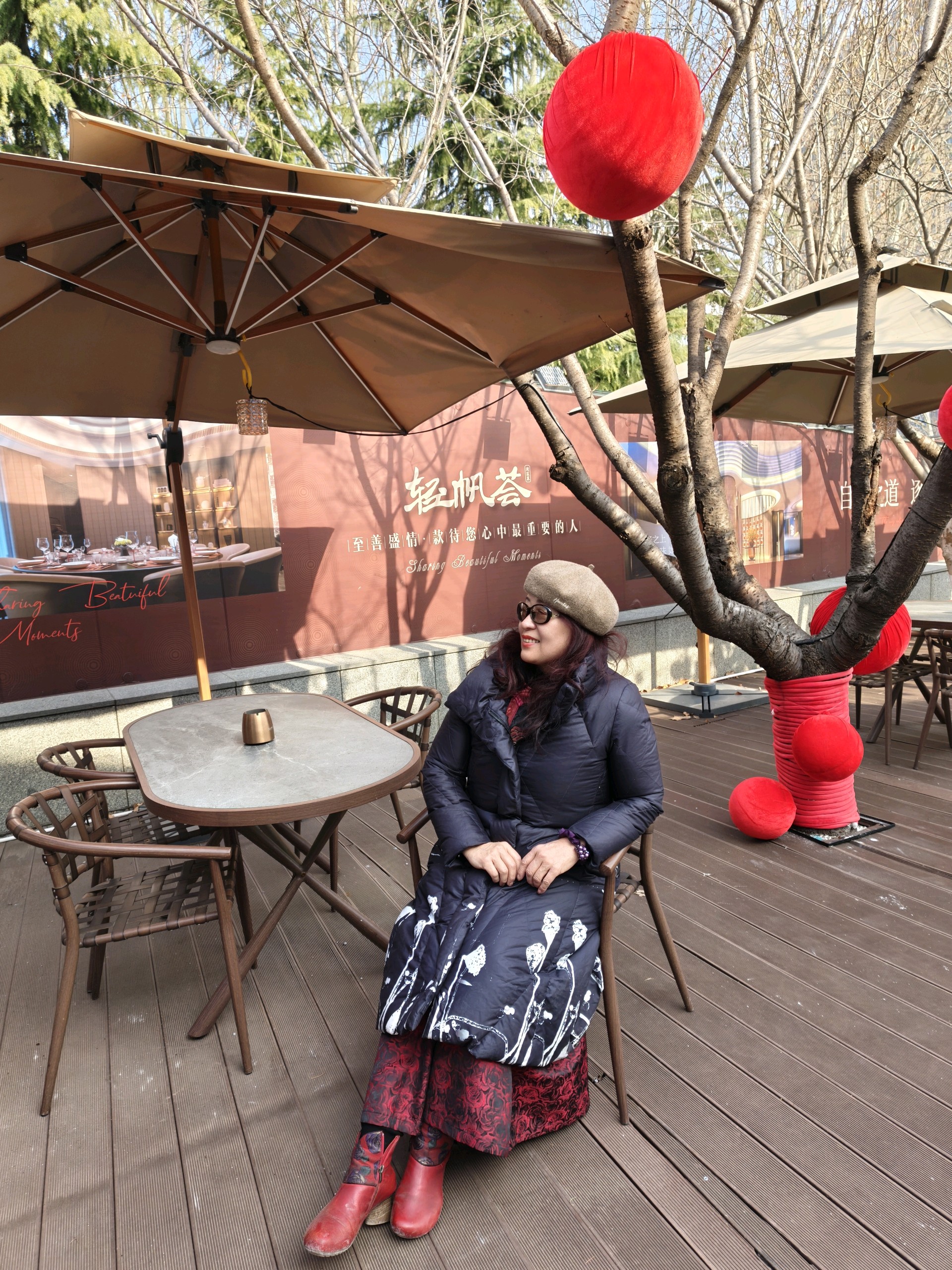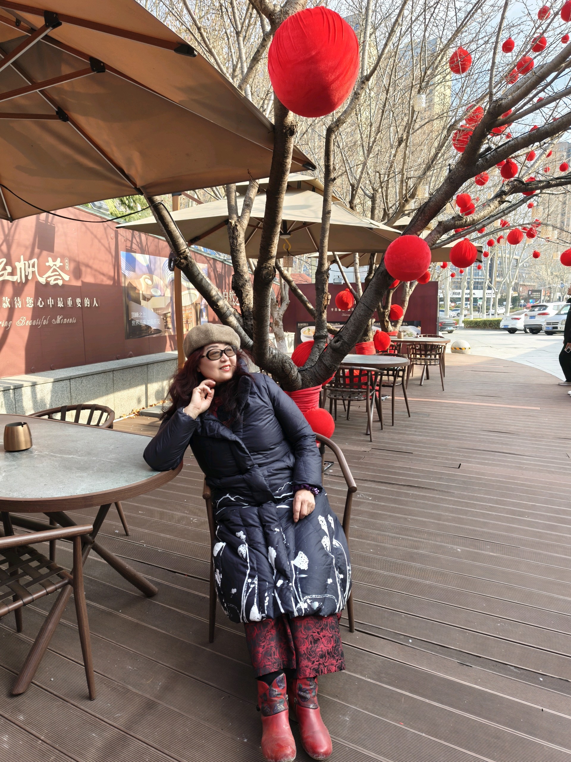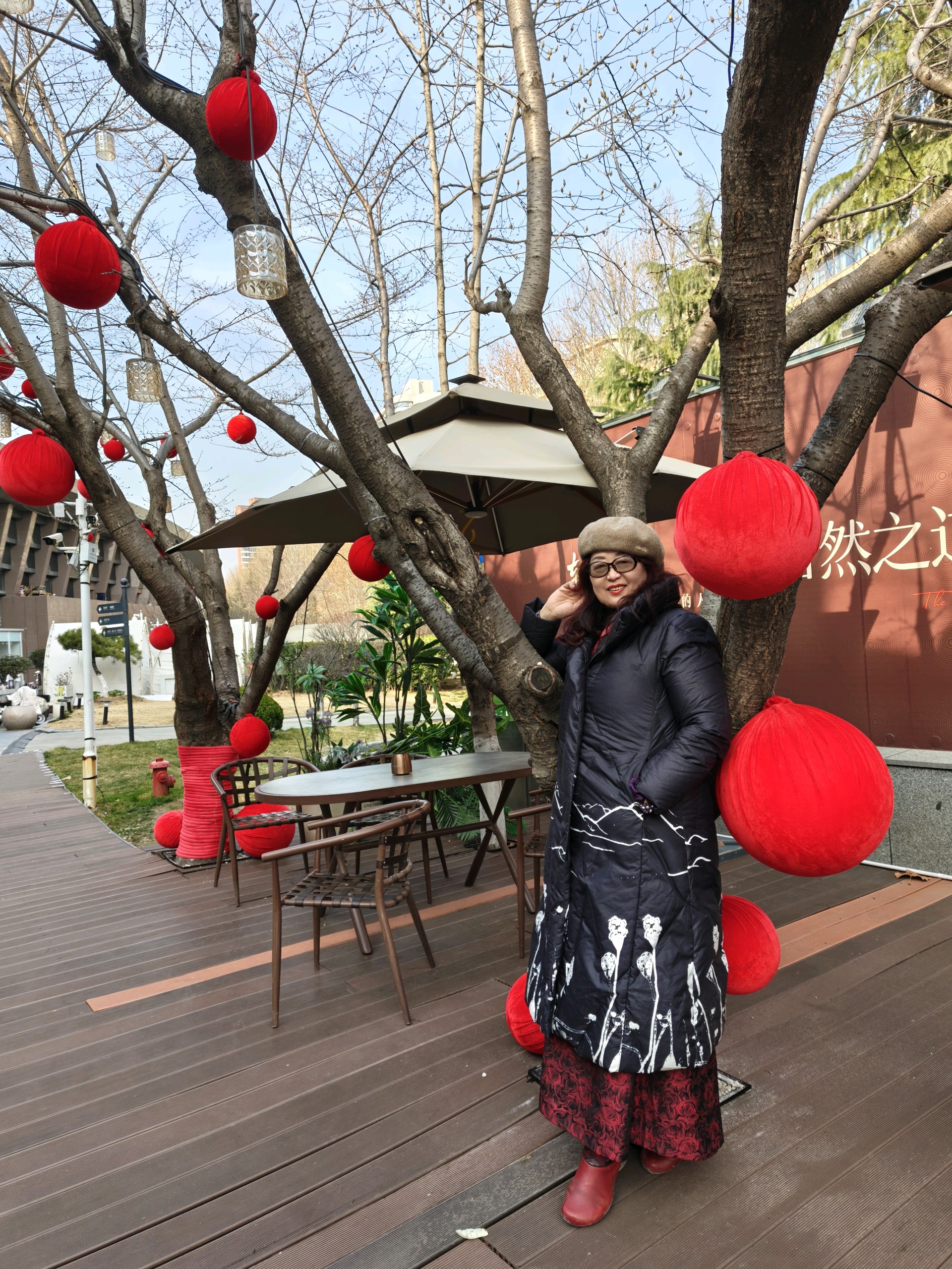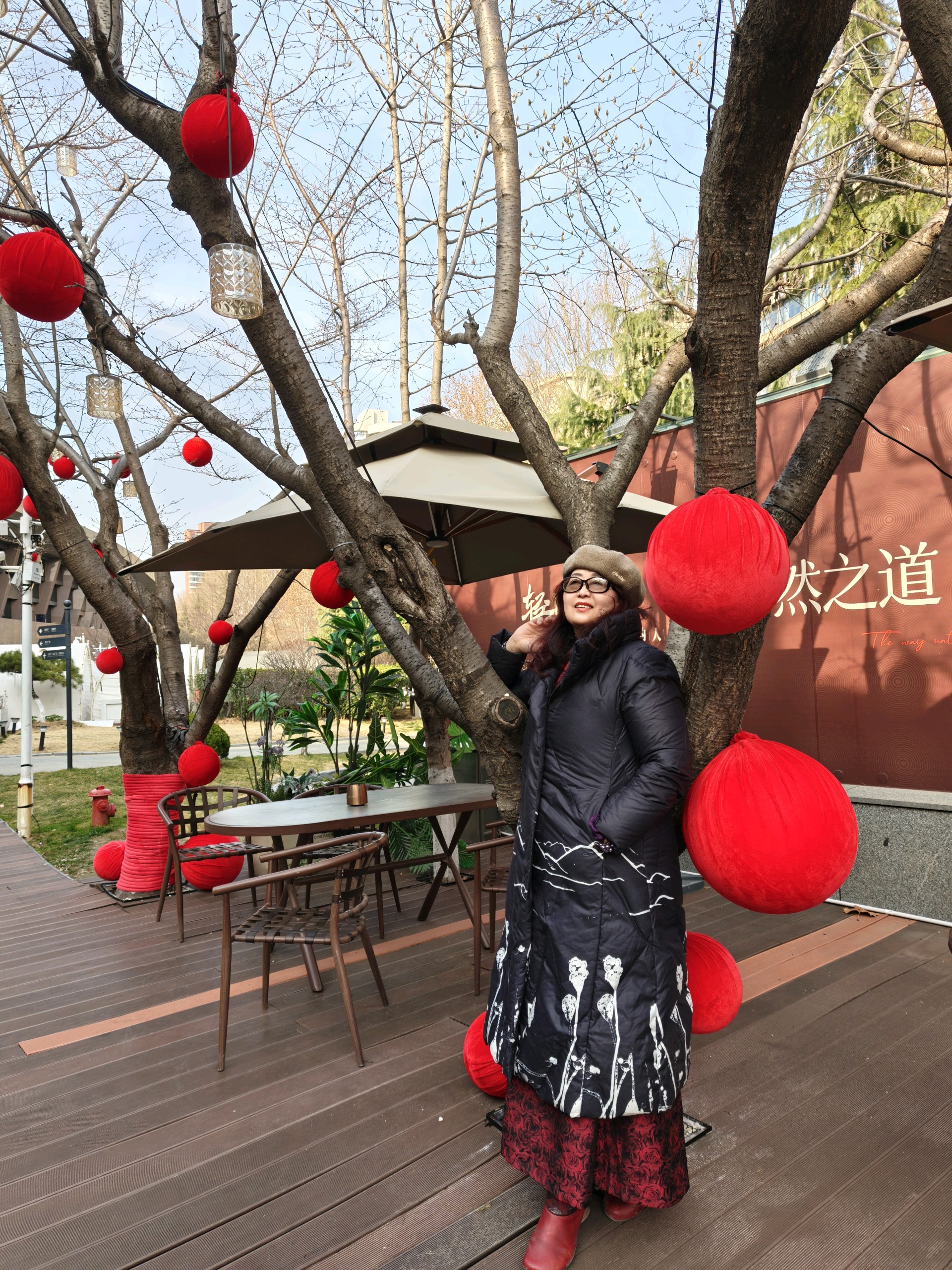 木栈道晒着太阳,桌椅还留着过年时人来人往的余温,咖啡杯里的热气早散了,可心里还暖着。身后的红墙写着“自然之道”,眼前的树还没抽芽,可那一串串红灯笼,把冬末的清冷都衬得温柔起来。