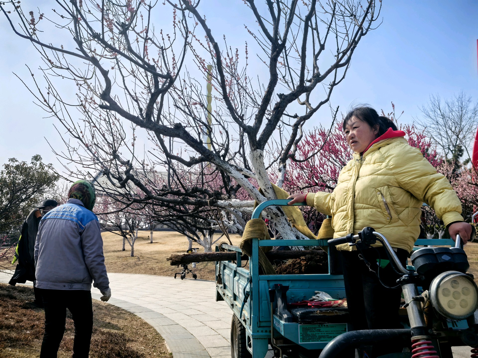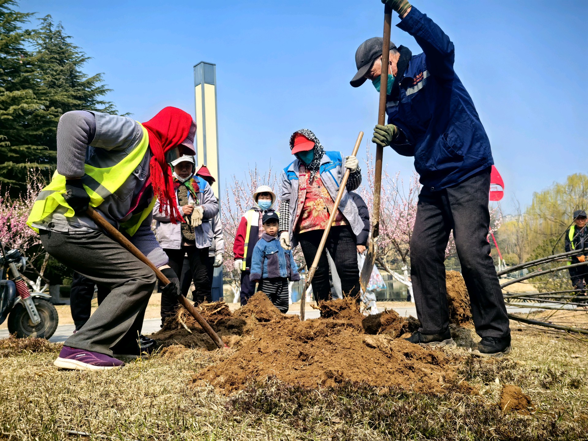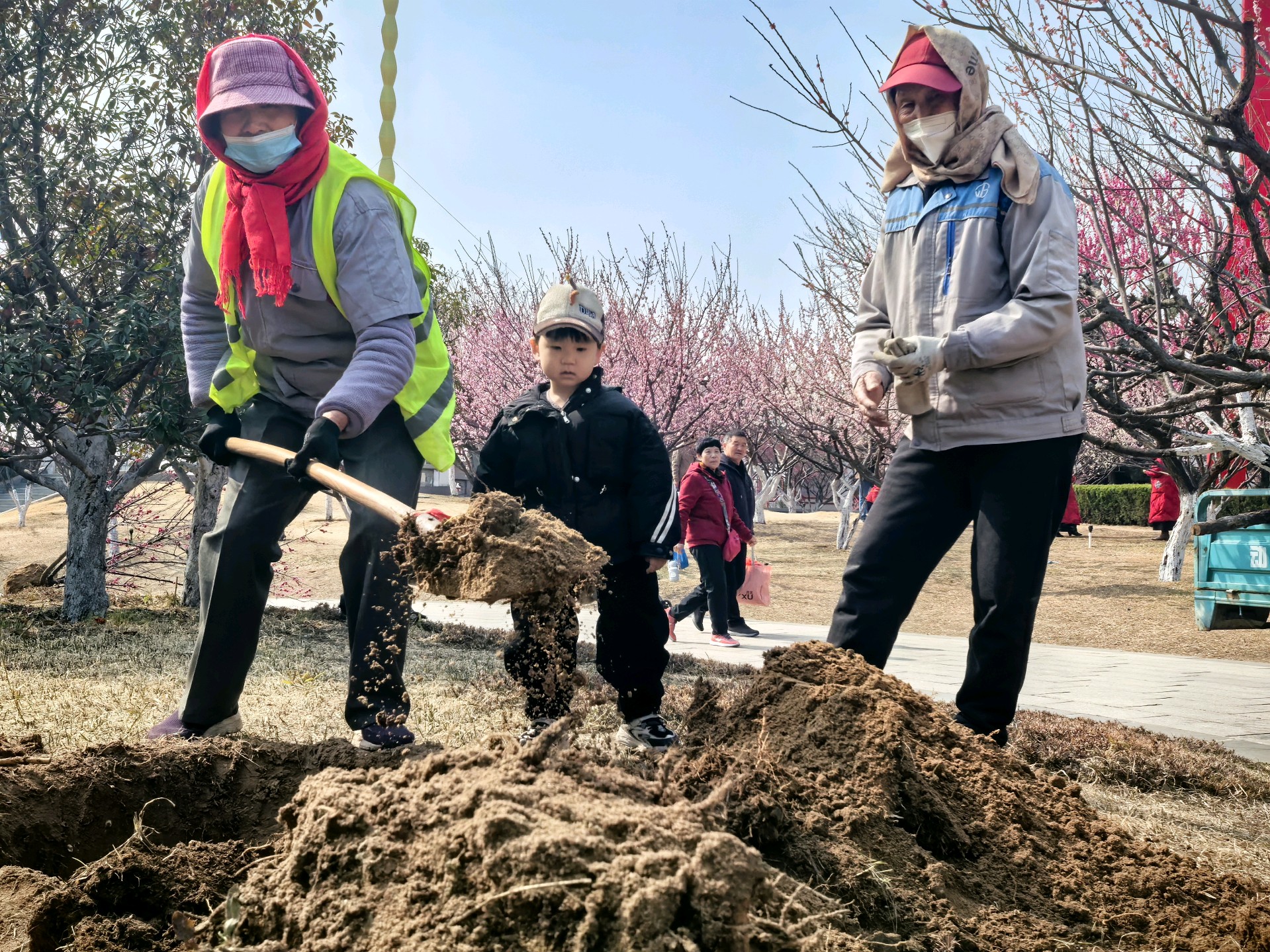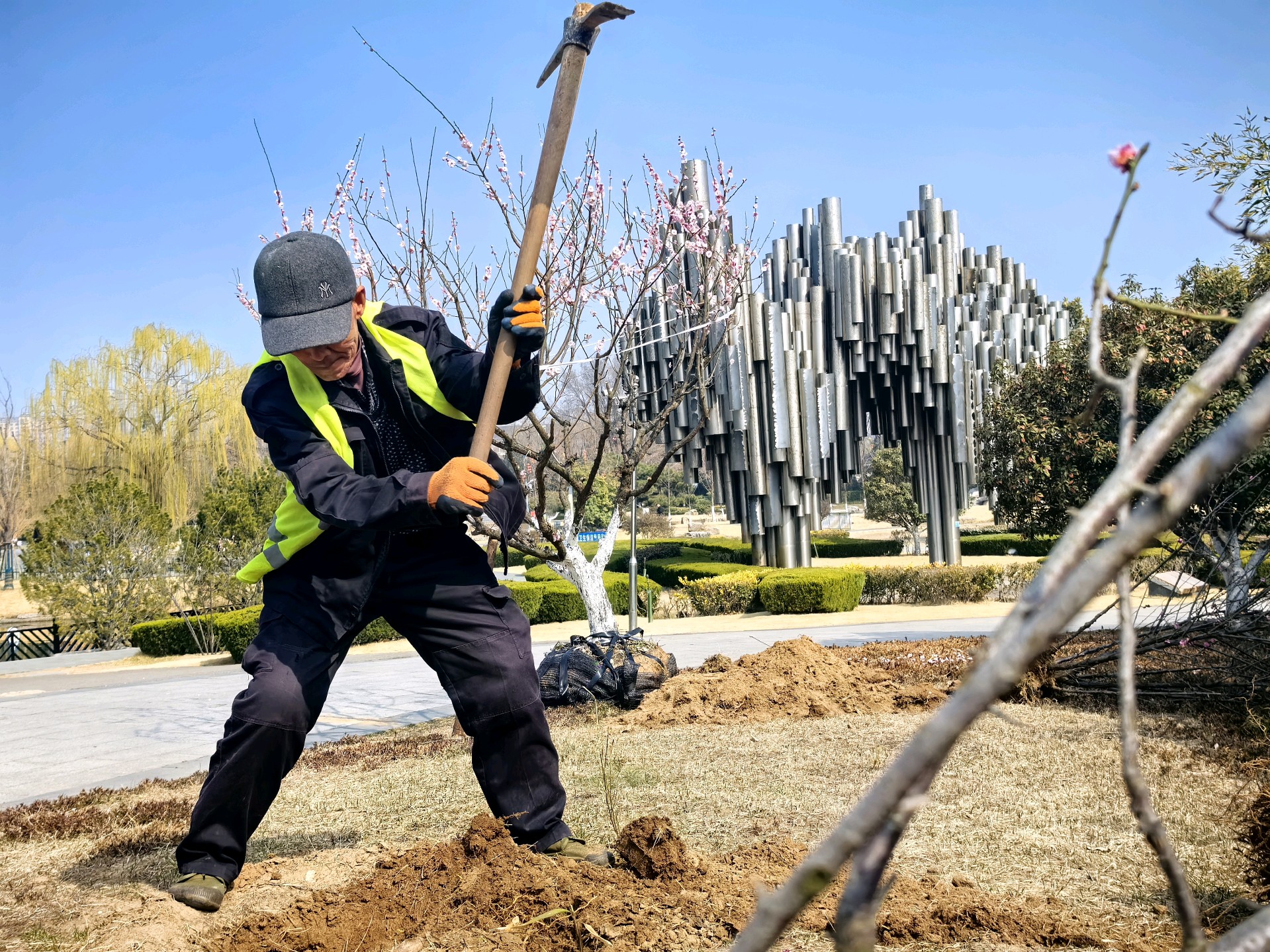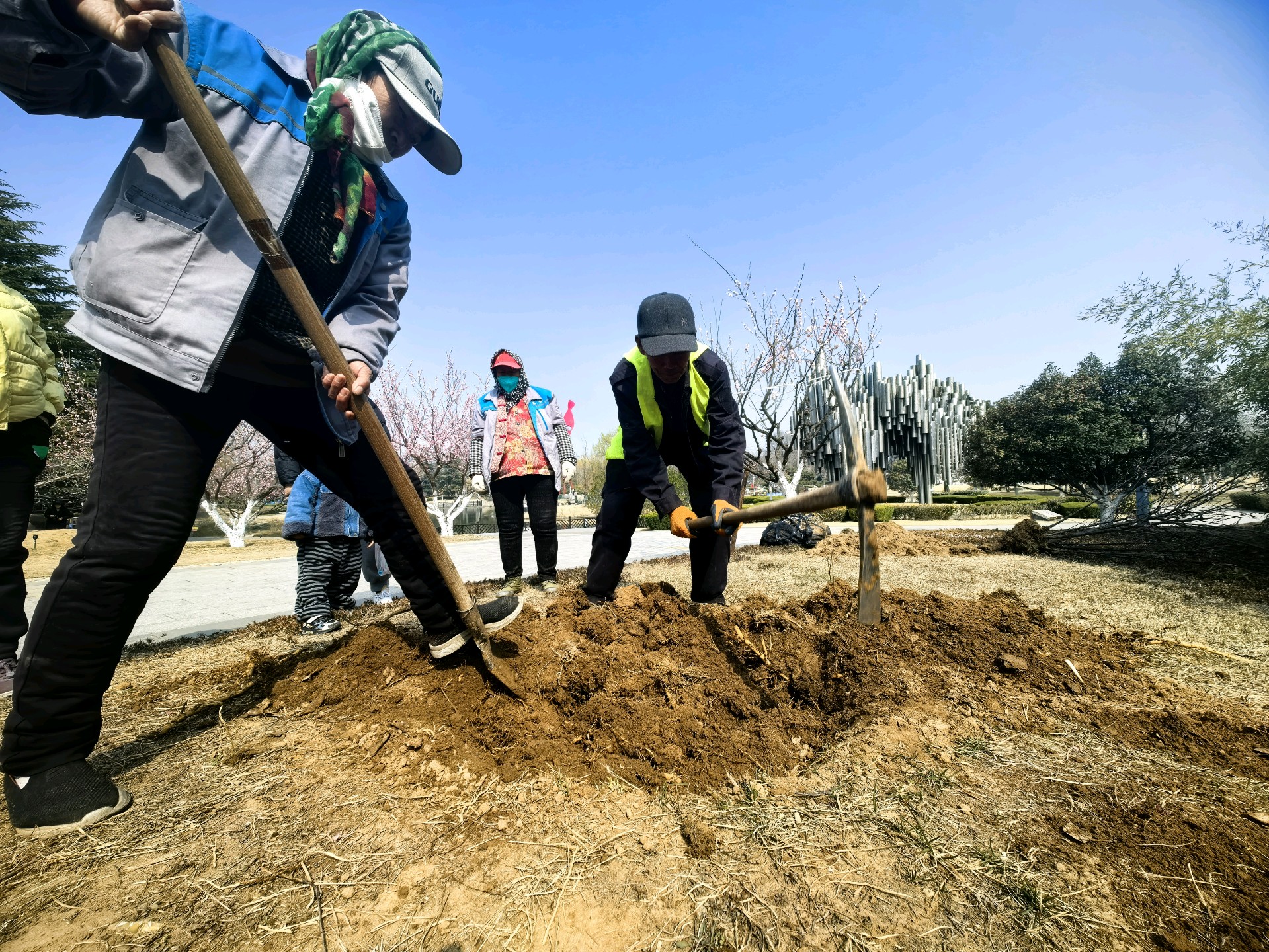 雕塑公园,园林工人忙碌地挖坑种树,小家伙也来凑热闹。泥土飞扬,笑声不断,这是对大自然的热爱,也是对未来的期待。