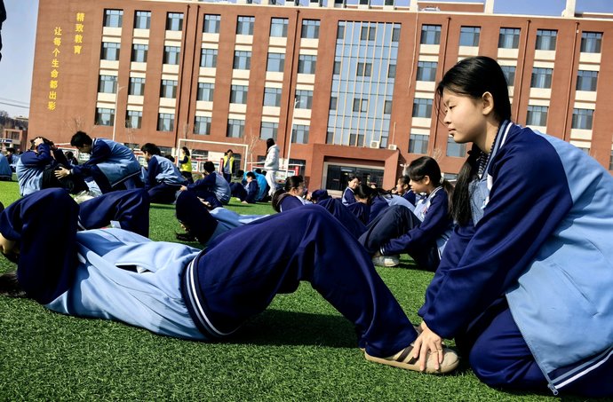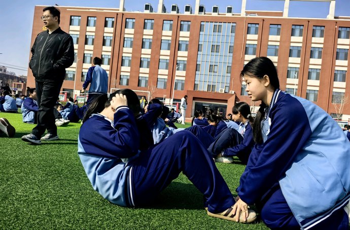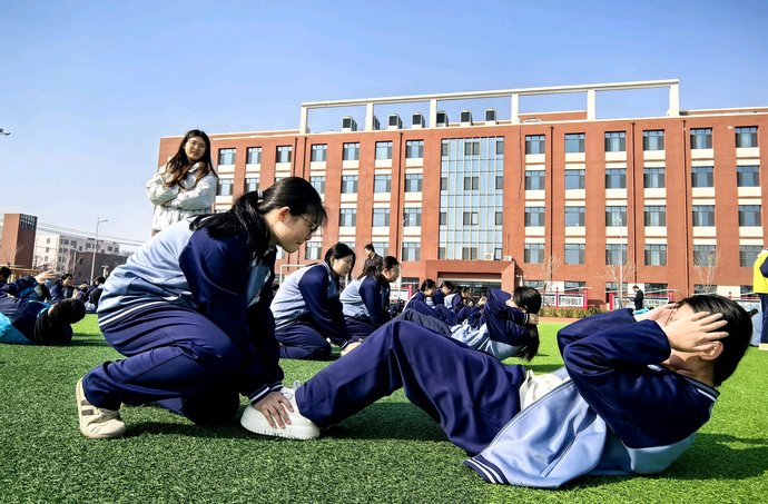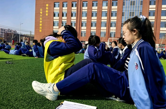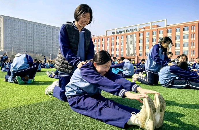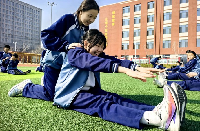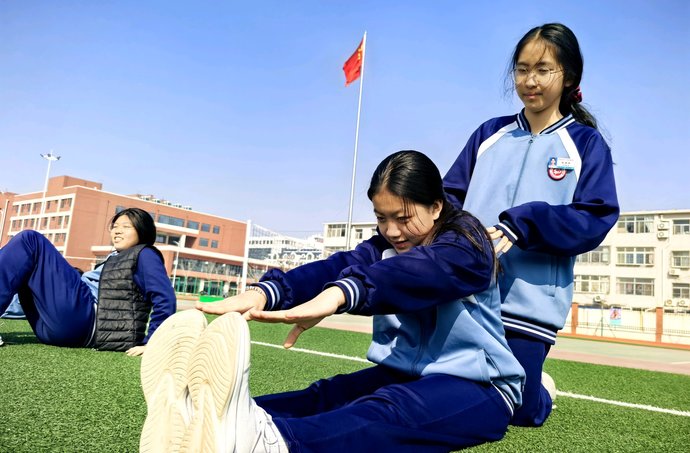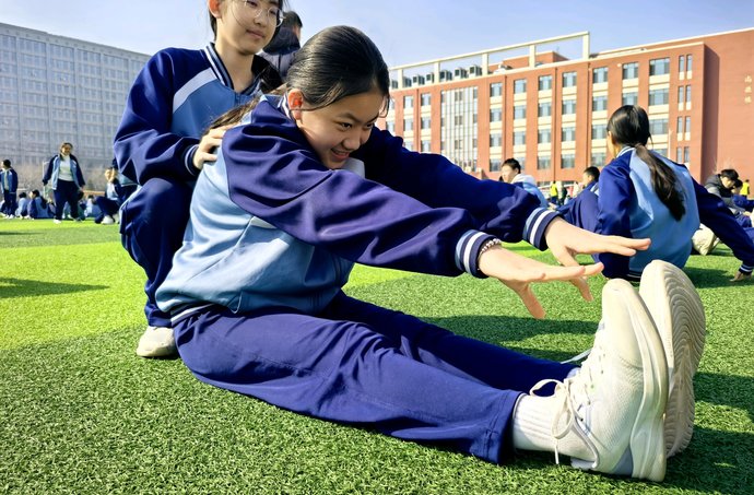 学校充分利用阳光大课间及体育课,扎实开展各项体能训练,确保学生动起来、体质强起来。图中,学生们正在进行仰卧起坐与坐位体前屈训练,专注投入,拉伸筋骨。通过科学系统的体育锻炼,不仅缓解了学业压力,更有效提升了柔韧性与核心力量。