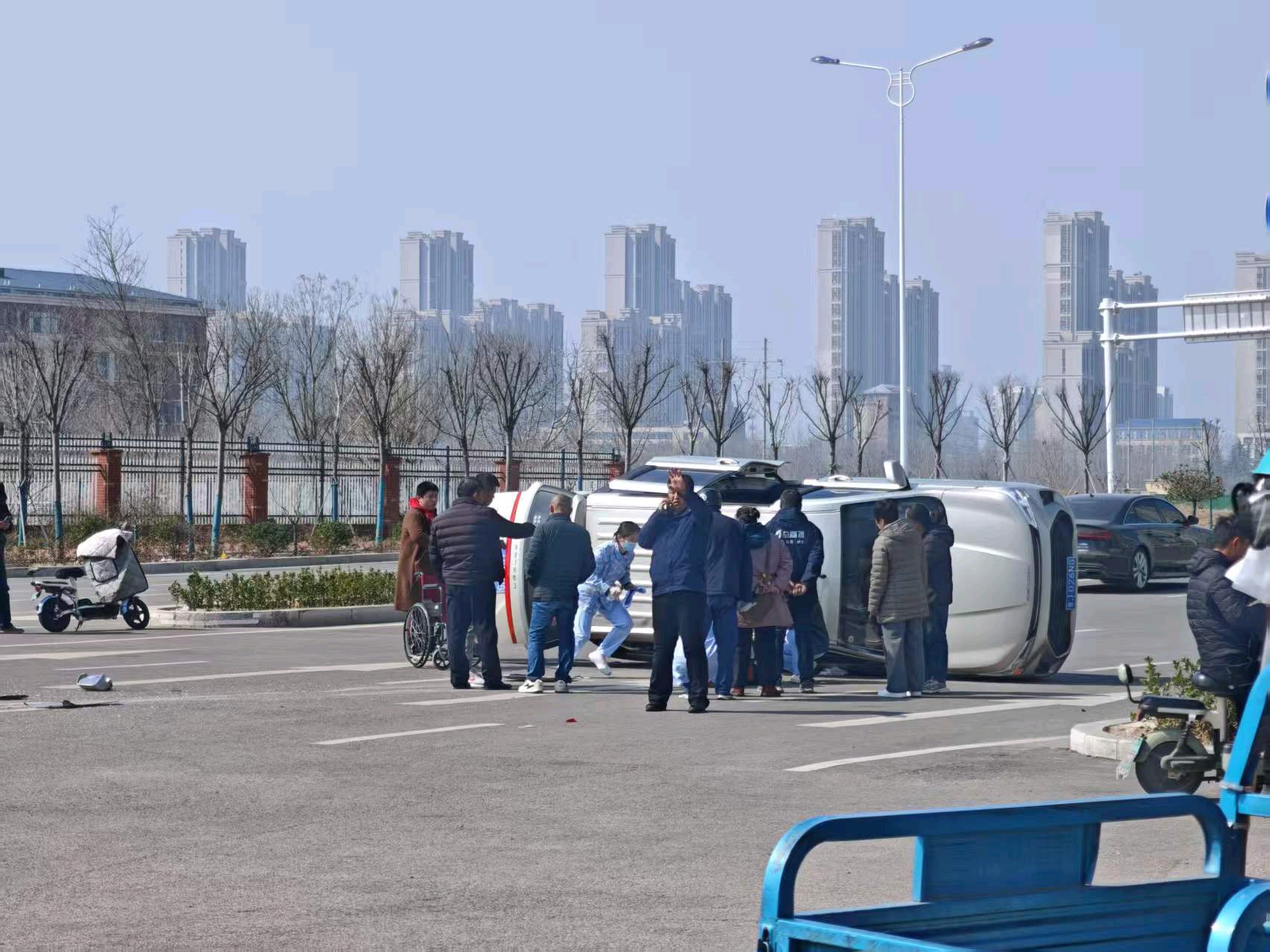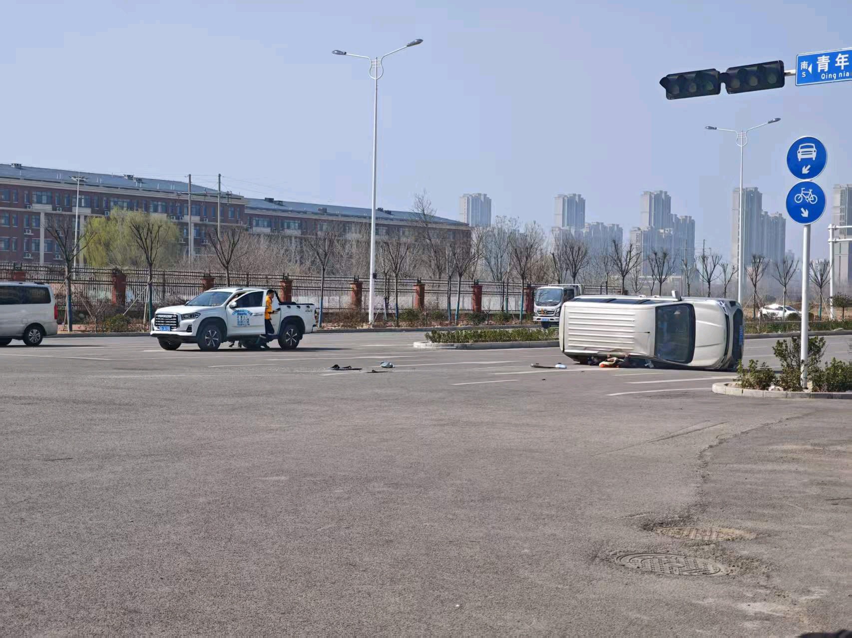 今天上午11:00左右,在泰安市泰山区岱阳大街与青年路交叉口,一辆SUV由南向西转弯,驾驶员抢信号灯,车辆行驶过快导致侧翻,路过时救援人员已赶到并展开紧急救援,车上人员轻微受伤,为了安全,宁等三分不抢一秒一定得记牢!