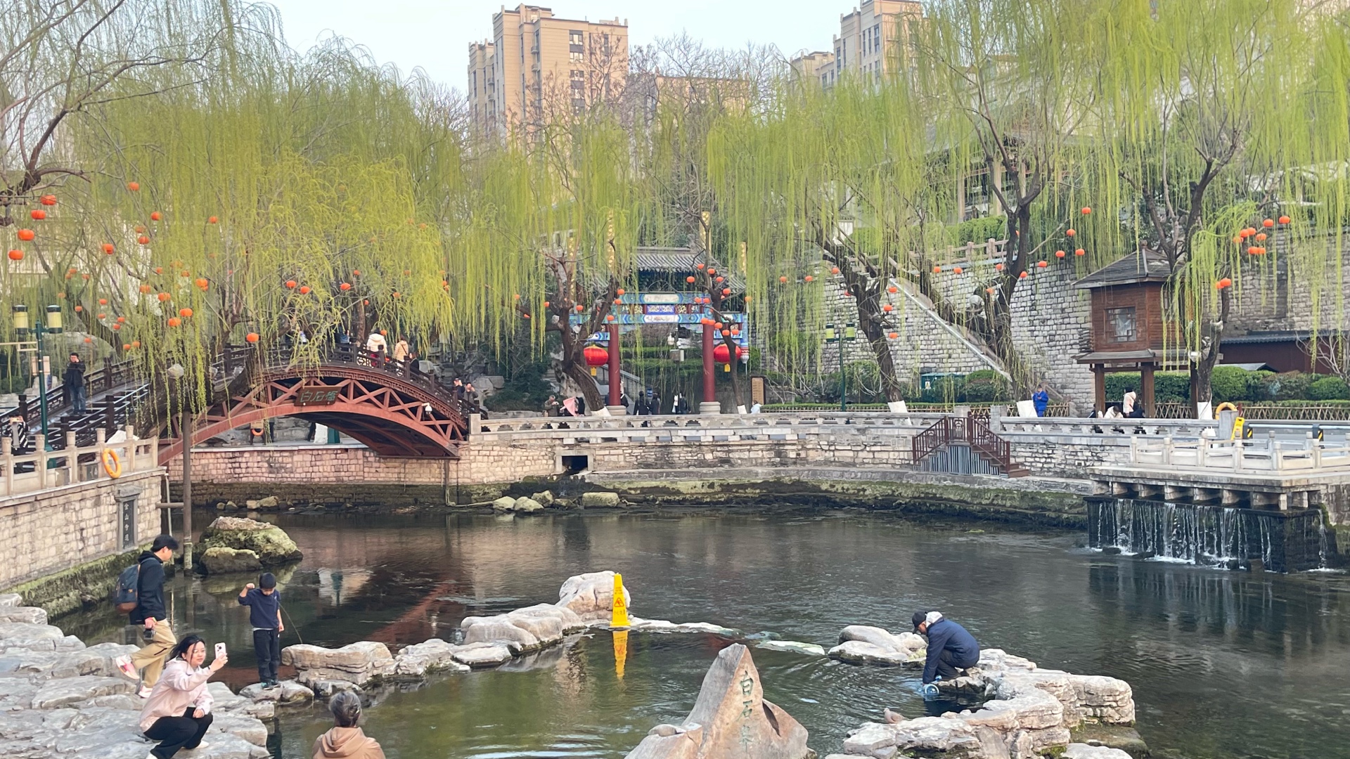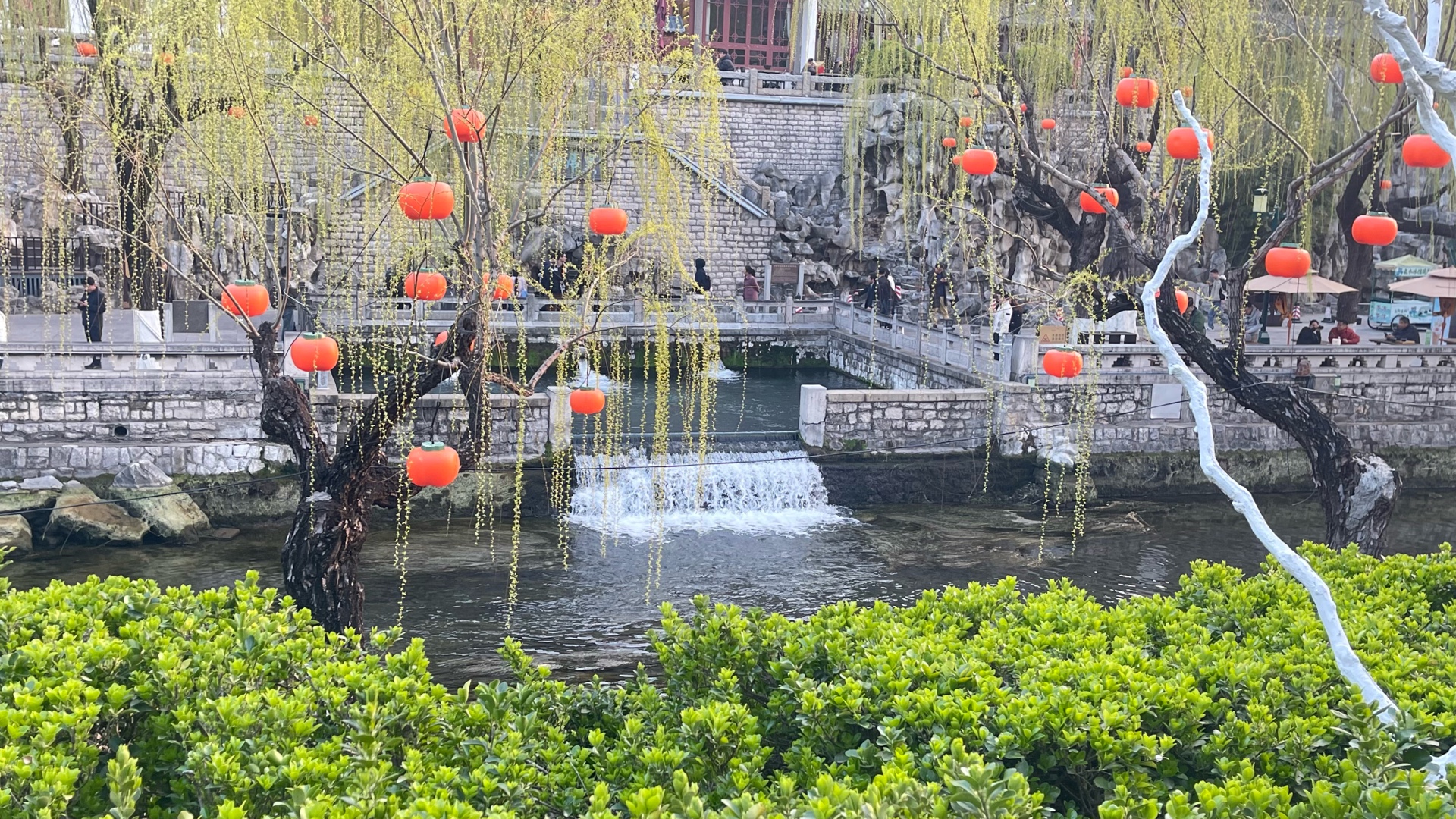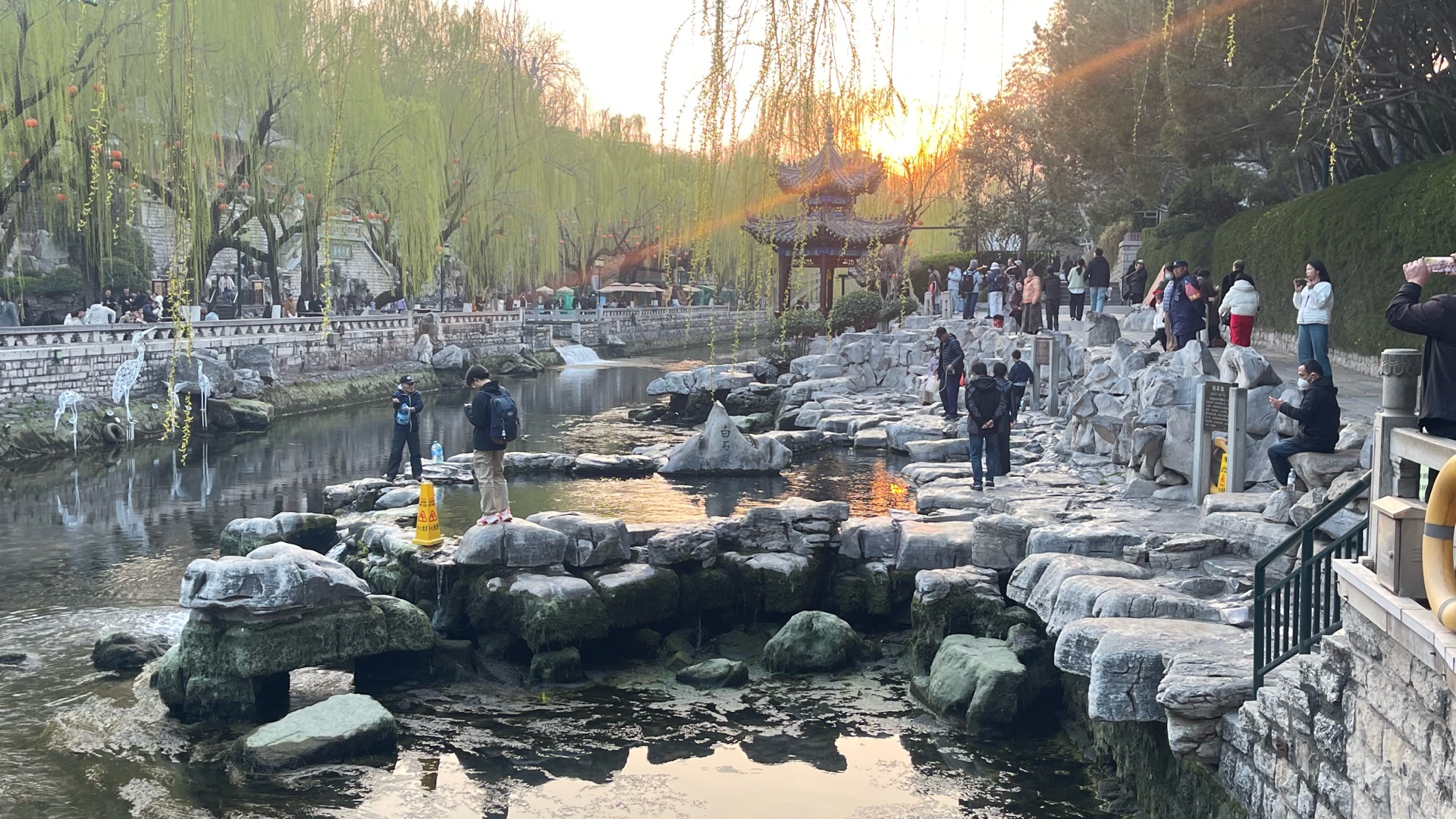 春天来了,午后的护城河畔,春花盛开、泉水欢唱、游客驻足赏花、看泉!