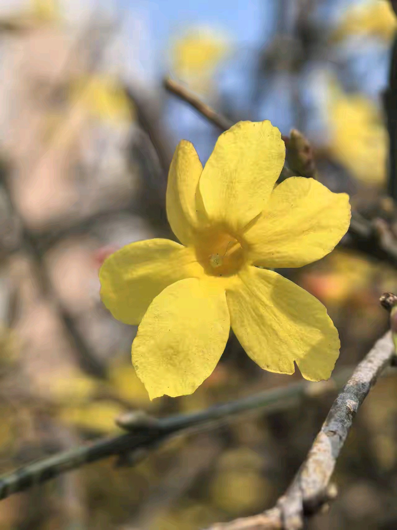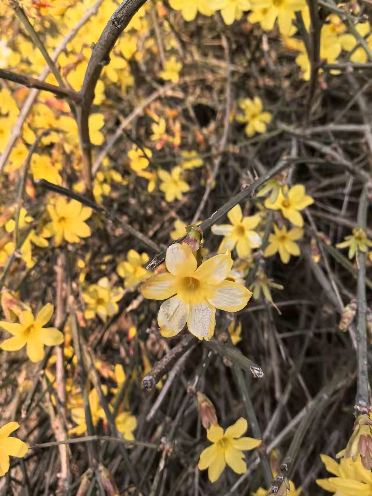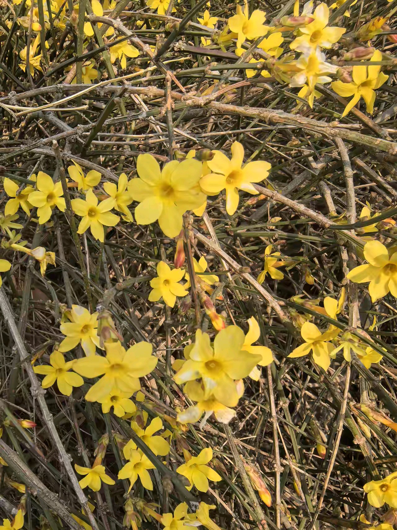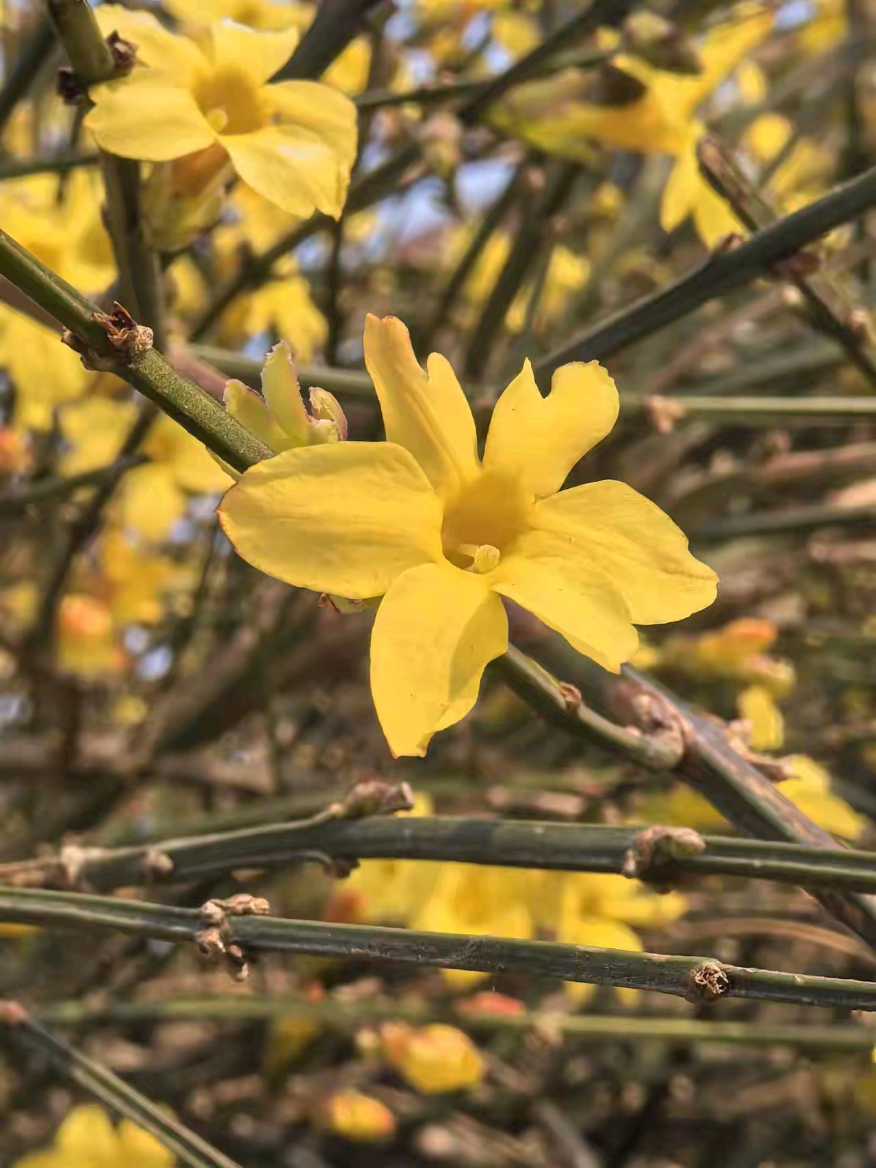 迎春花开像一朵朵小太阳面向大太阳。迎春花开,春姑娘带着一路繁花走来,给春天穿上最美的花衣裳。