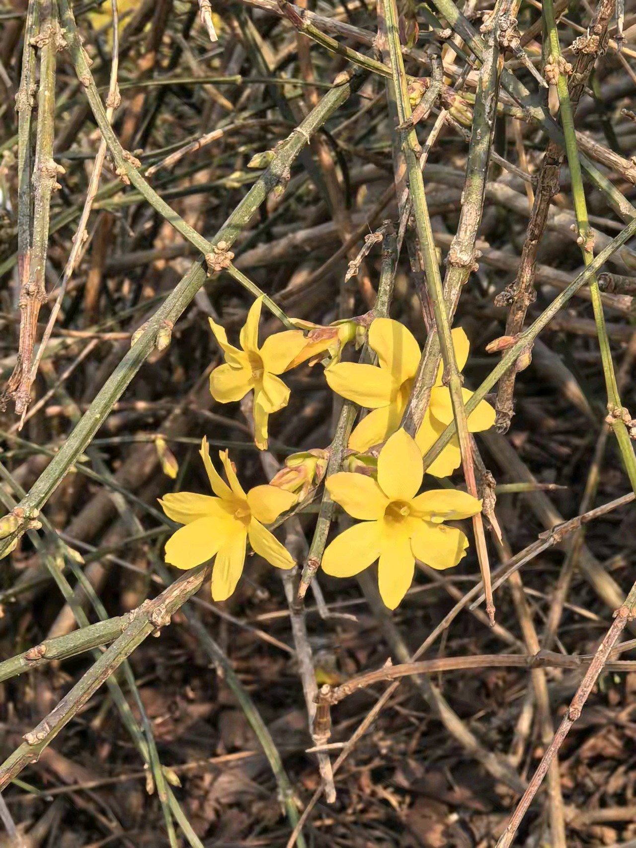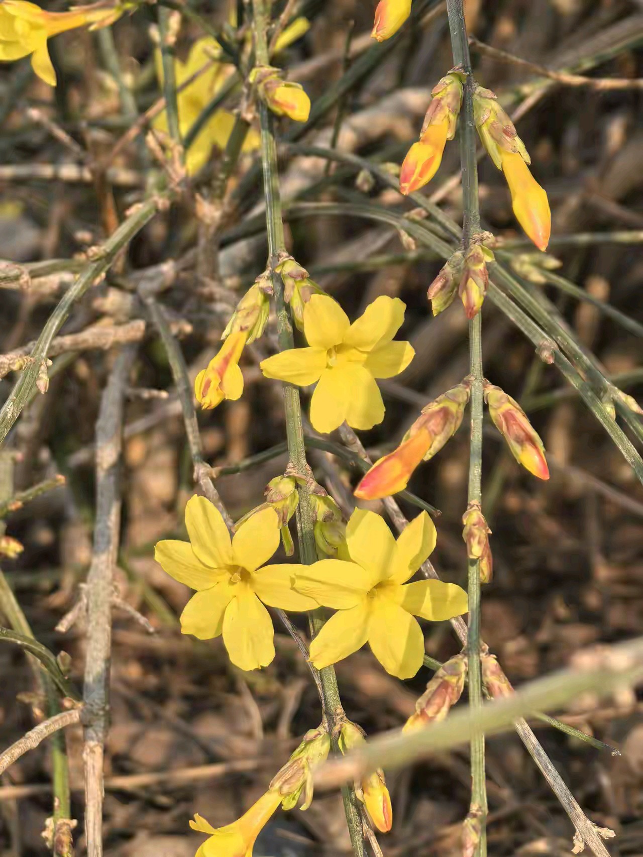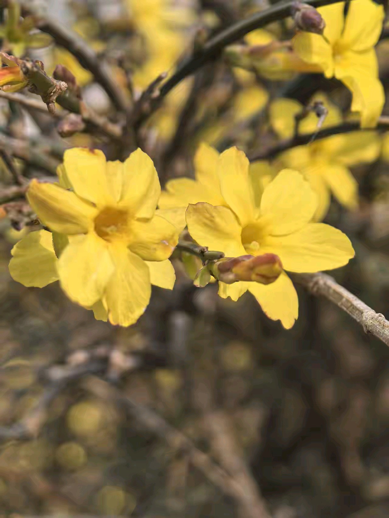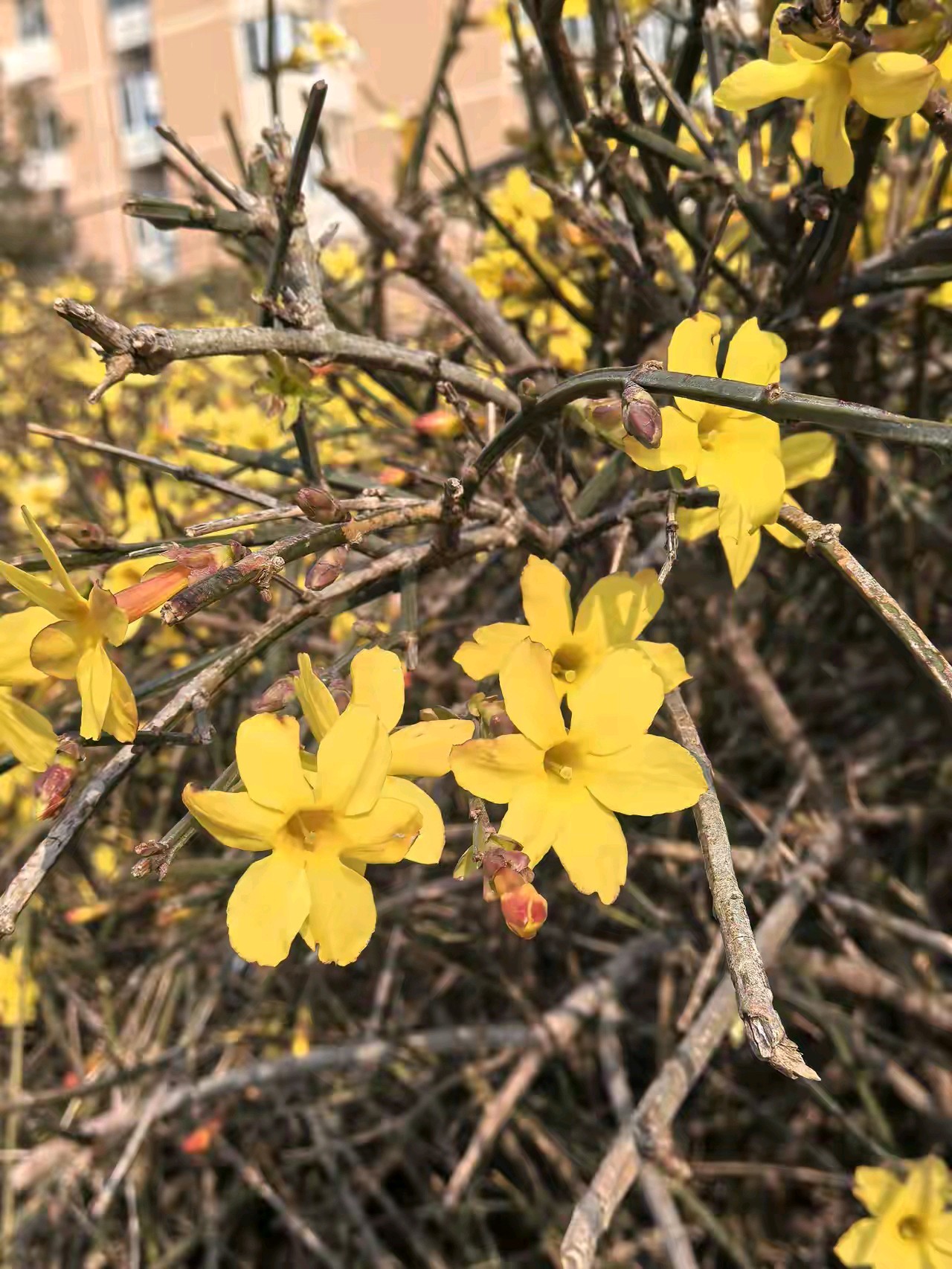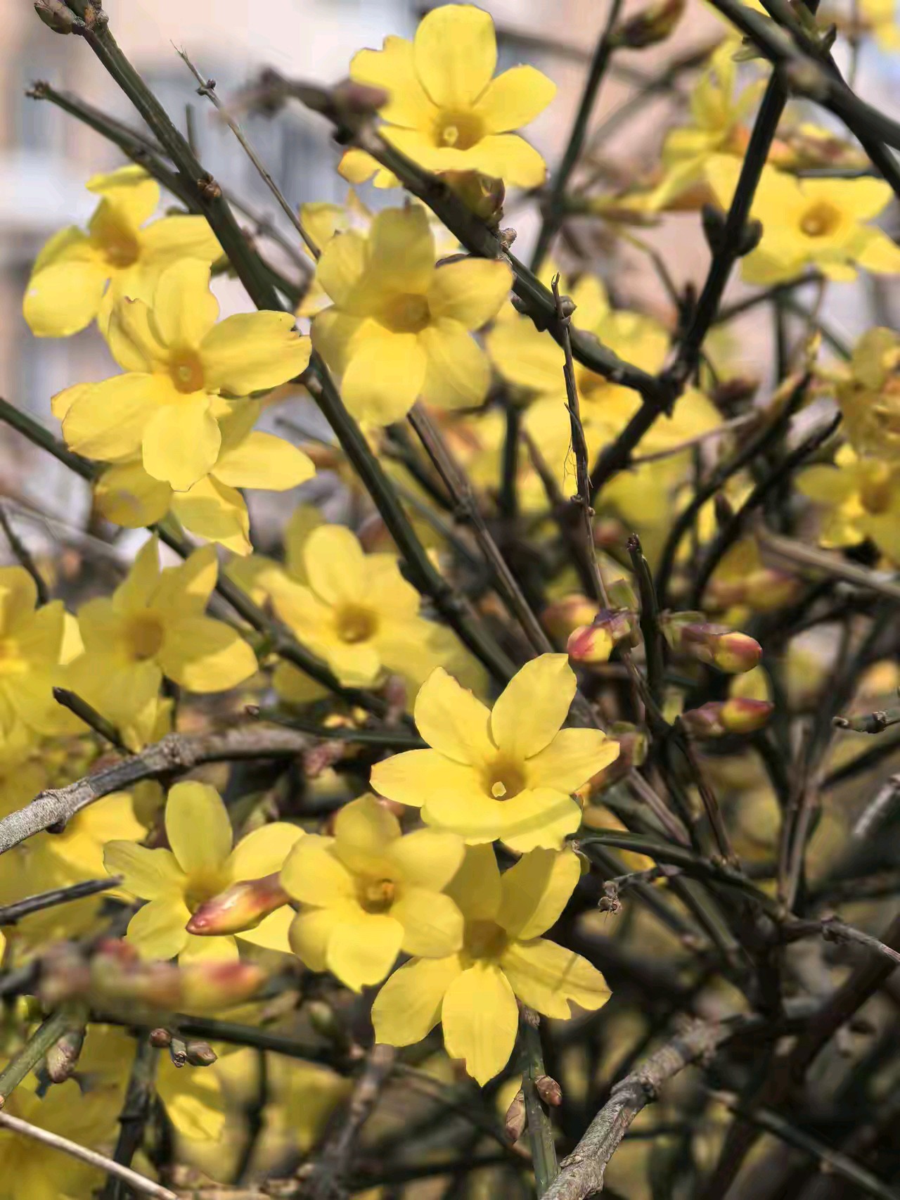 迎春花开像一朵朵小太阳面向大太阳。迎春花开,春姑娘带着一路繁花走来,给春天穿上最美的花衣裳。