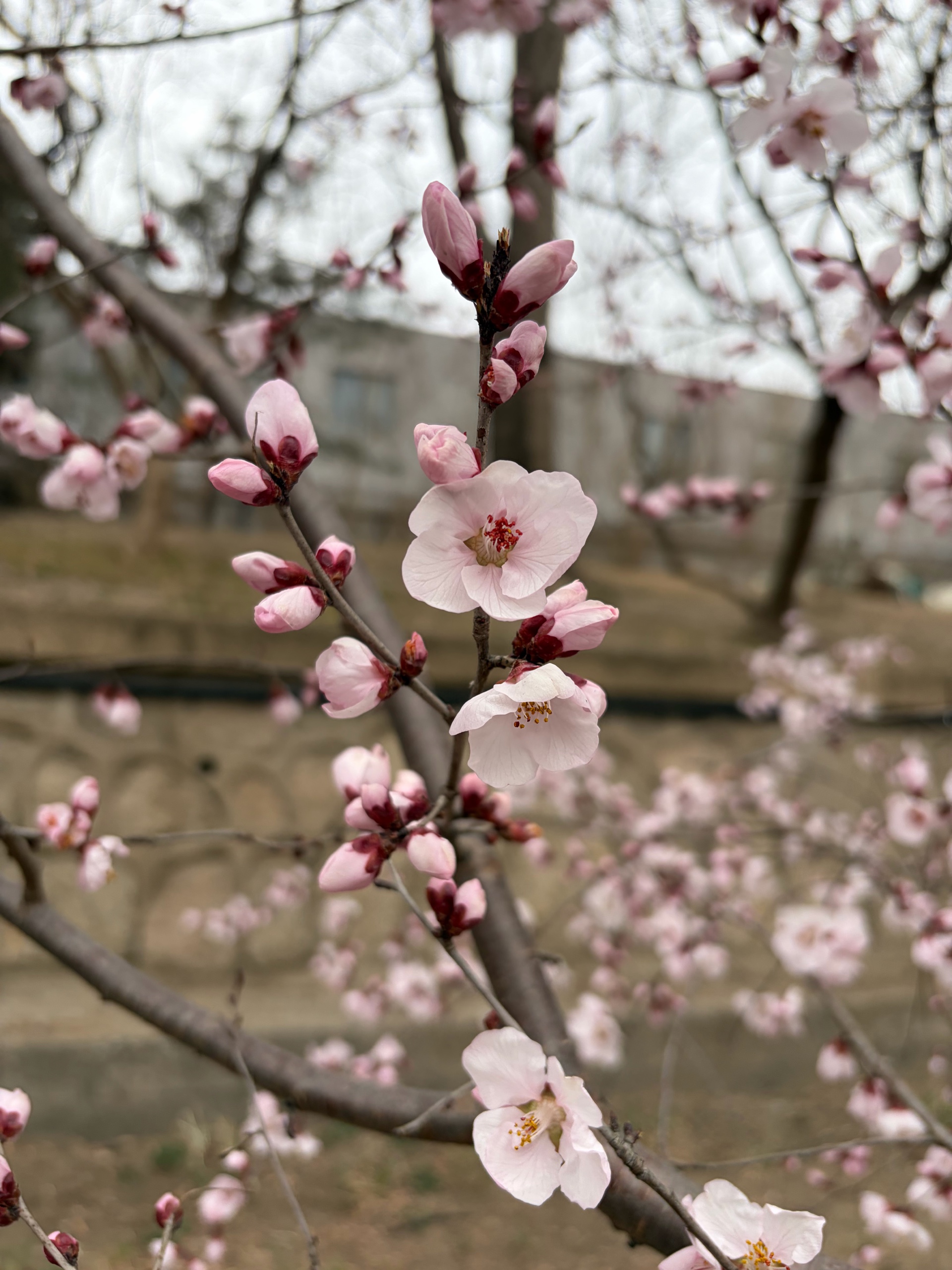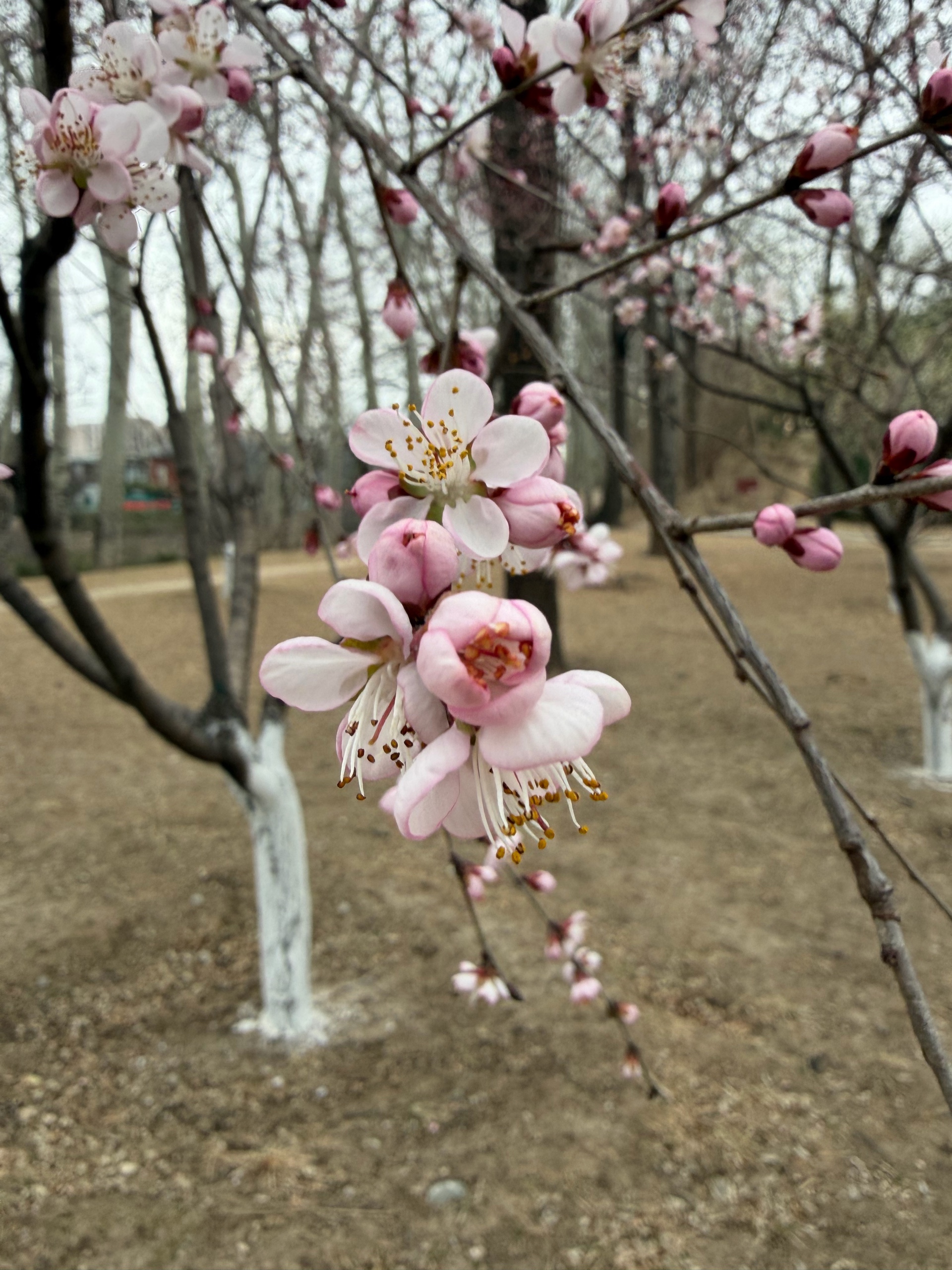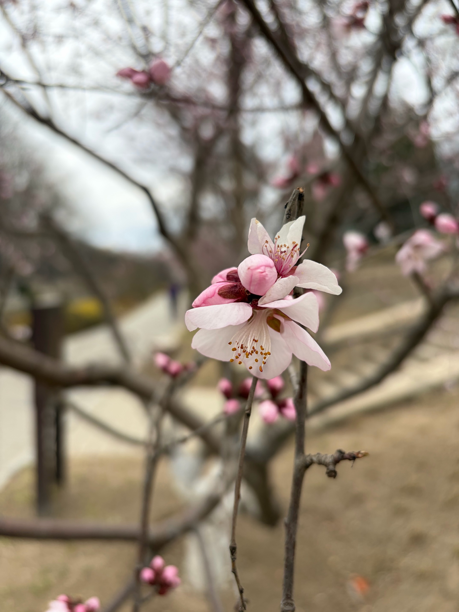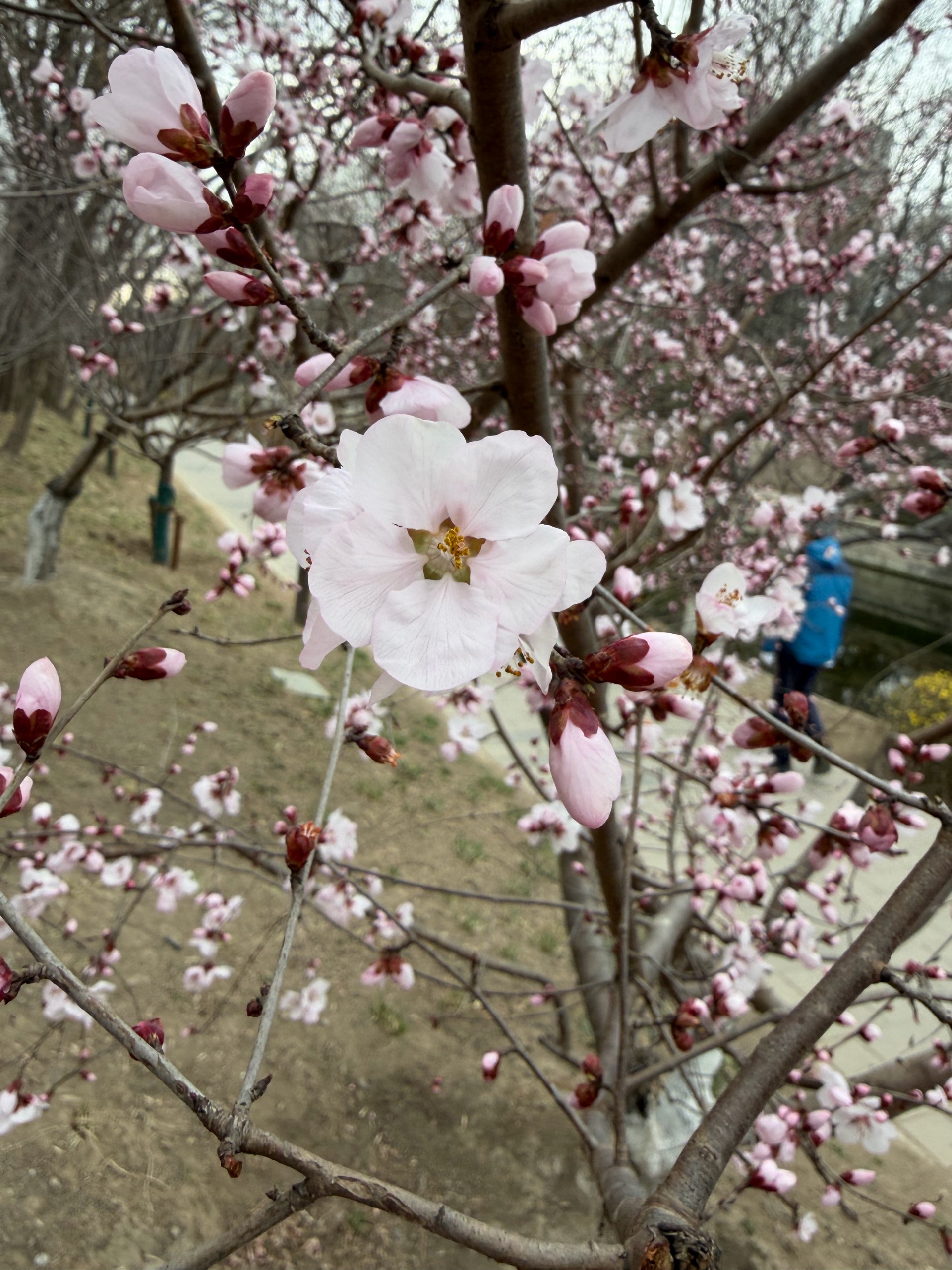 漫步在小径上,一棵棵盛开的桃树,粉色花朵如云朵般绽放,仿佛置身于童话世界。跑步的人也多了起来。