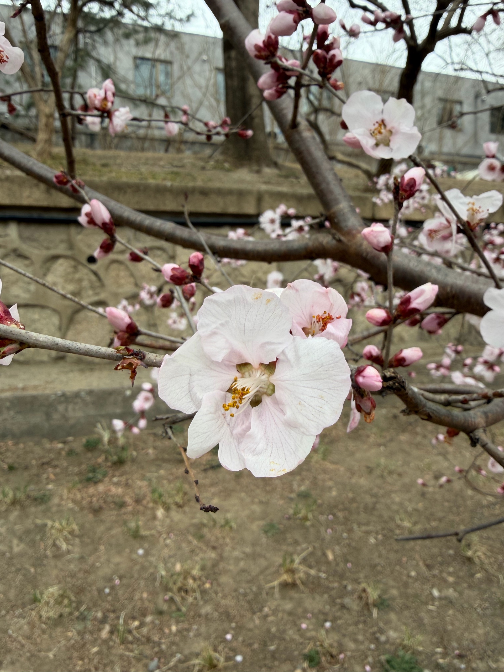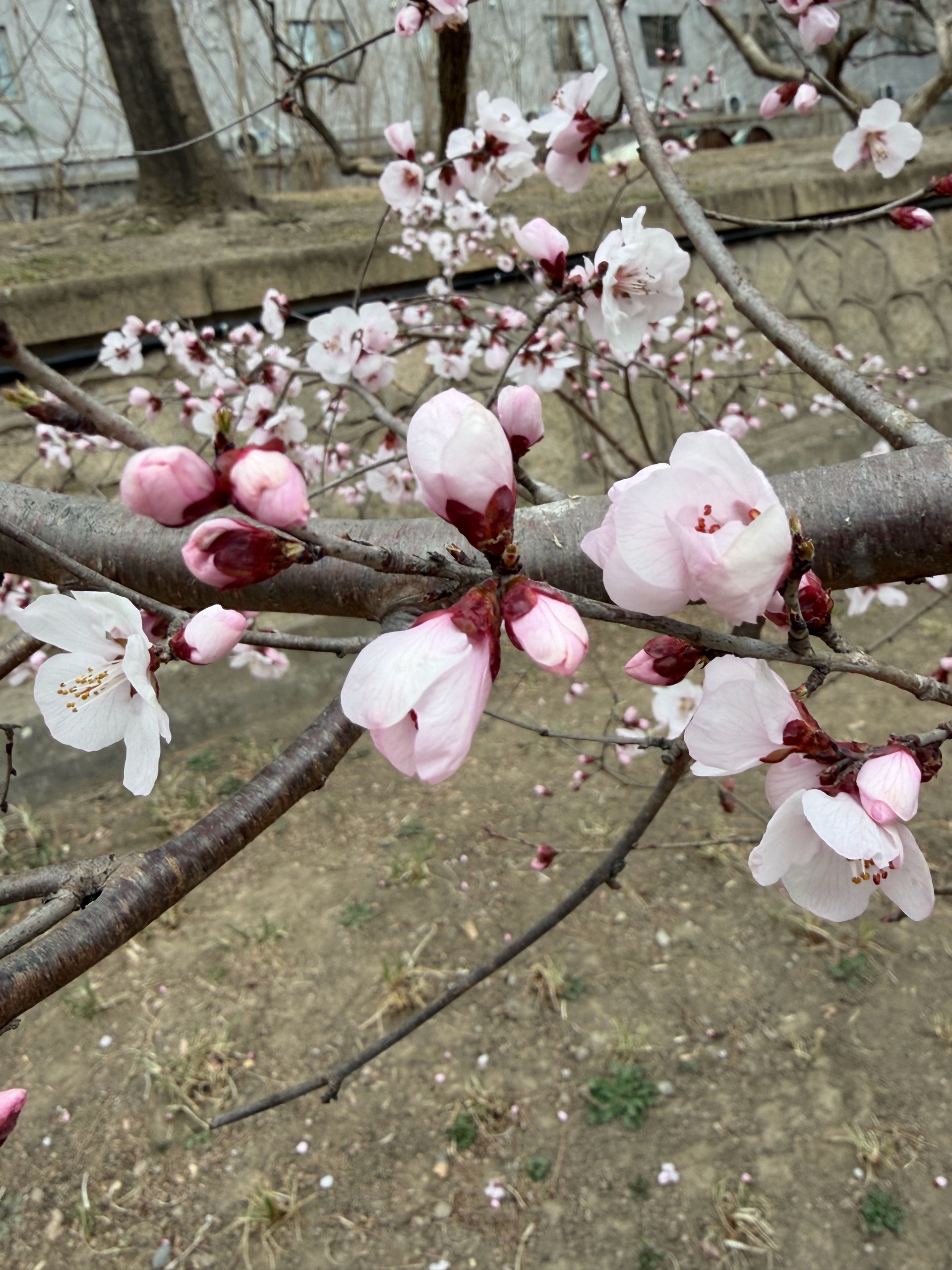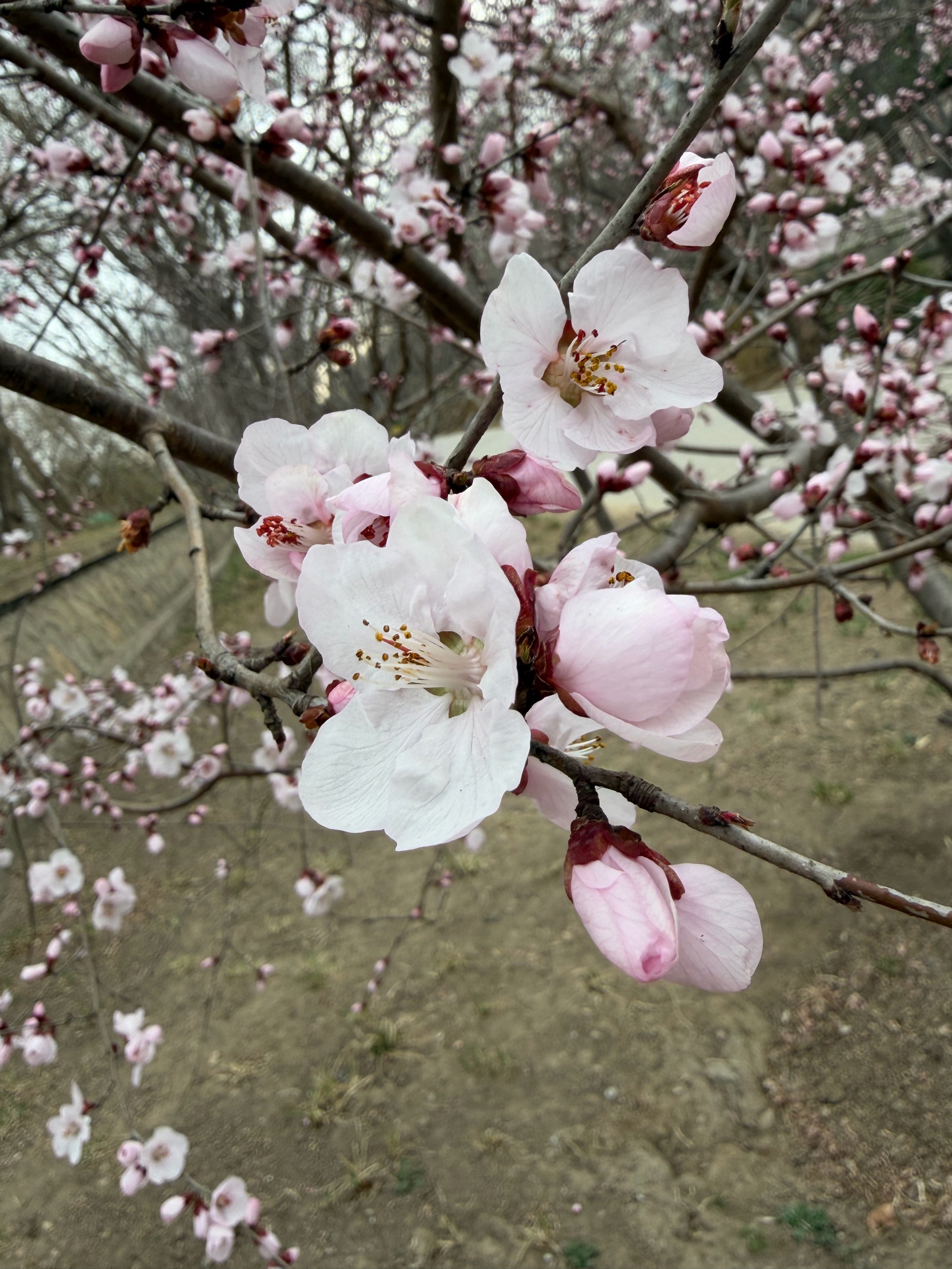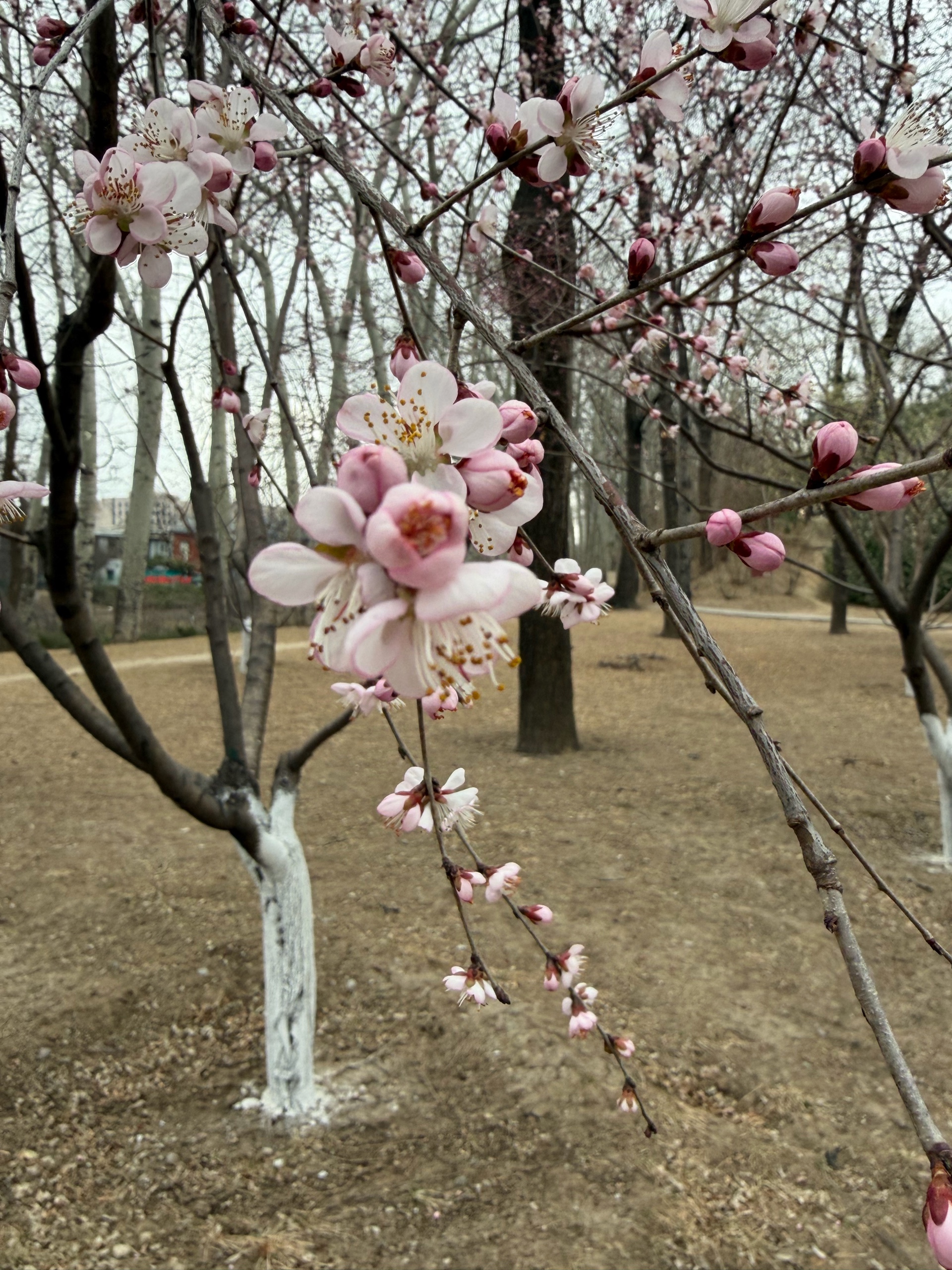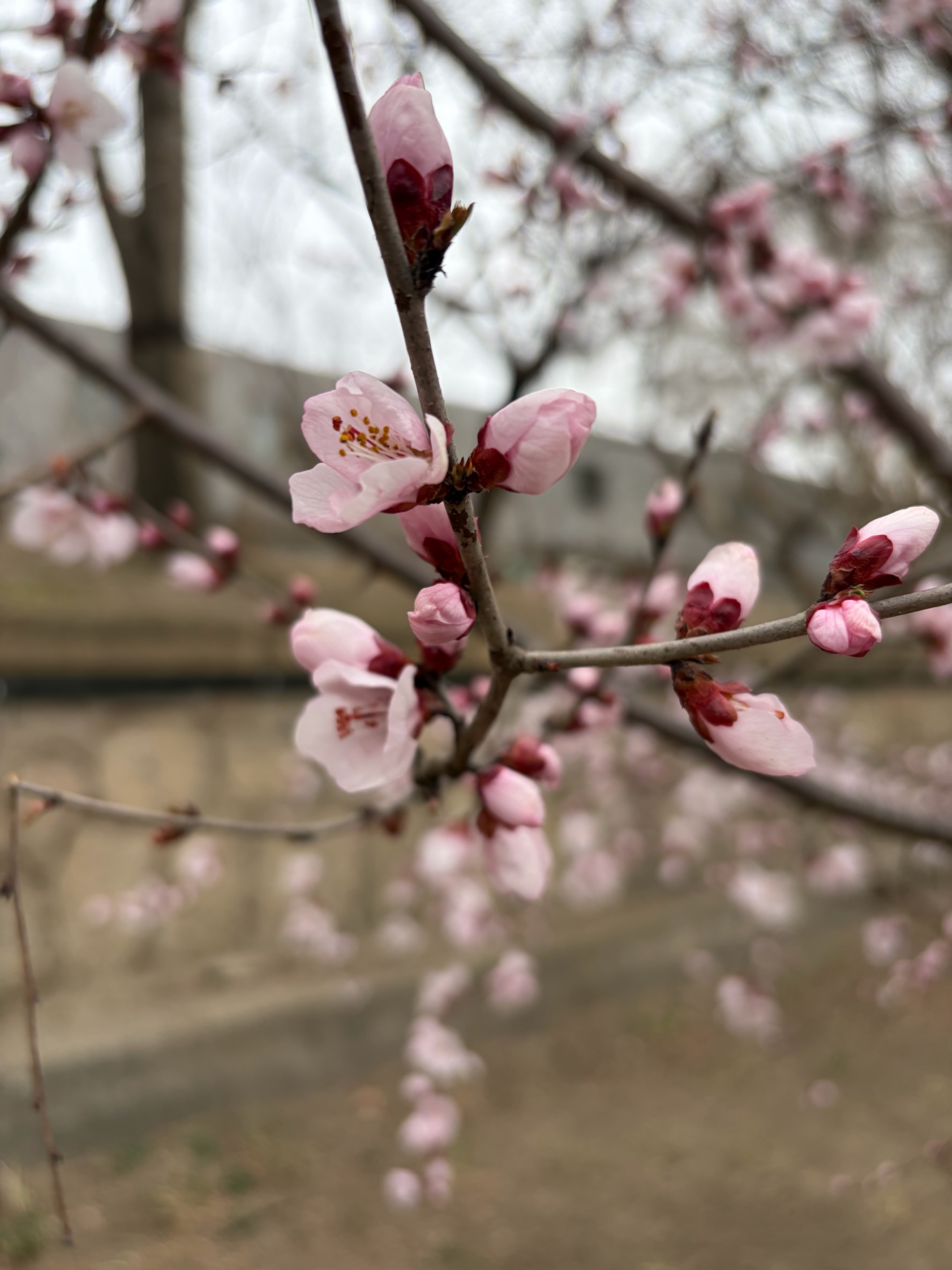 漫步在小径上,一棵棵盛开的桃树,粉色花朵如云朵般绽放,仿佛置身于童话世界。跑步的人也多了起来。
