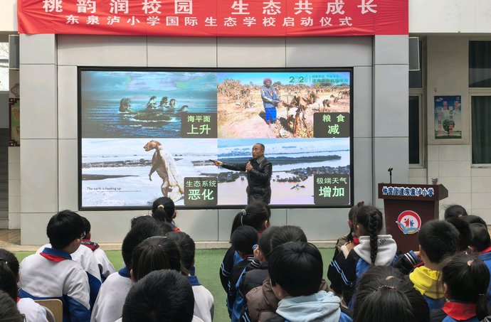 杨校长告诉孩子们,我们必须重视气候变化,这关系到我们所有人的今天与未来,学习气候变化相关知识,做应对气候变化的环保小卫士。相关知识要点:1、近些年来,狂风暴雨泥石流等极端天气越来越极端、破坏力越来越强且越来越多的原因是气候持续变暖所致;2、气候变暖的主要原因是人类活动所致,特别是工业化以来长期无节制排放温室气体二氧化碳等造成的;3、气候变化让所有人深受其害,面对气候变化导致的极端天气,无人能独善其身、置身度外;4、要减少极端天气的肆虐破坏与严重伤害就得大幅减少二氧化碳等温室气体排放,也就是要尽早碳达峰,关键是尽快碳中和,大幅度节能降碳与大力度绿色转型;5、人人应该践行遵守国家多部委颁布的《公民生态环境行为规范》,新时代学校教育应用心实施生态文明教育,这是学校的责任与使命。他建议中小学树立“爱学生就是爱事业,爱绿色就是爱生活”的从教理念和探索“用绿色力量推动整体提升办学质量”的新质教育思路,全面实施素质教育,始终坚持德育为首,用心培养有可持续发展意识的新时代中国式现代化建设的高素质文明公民,人人做“美丽中国,我是行动者”。