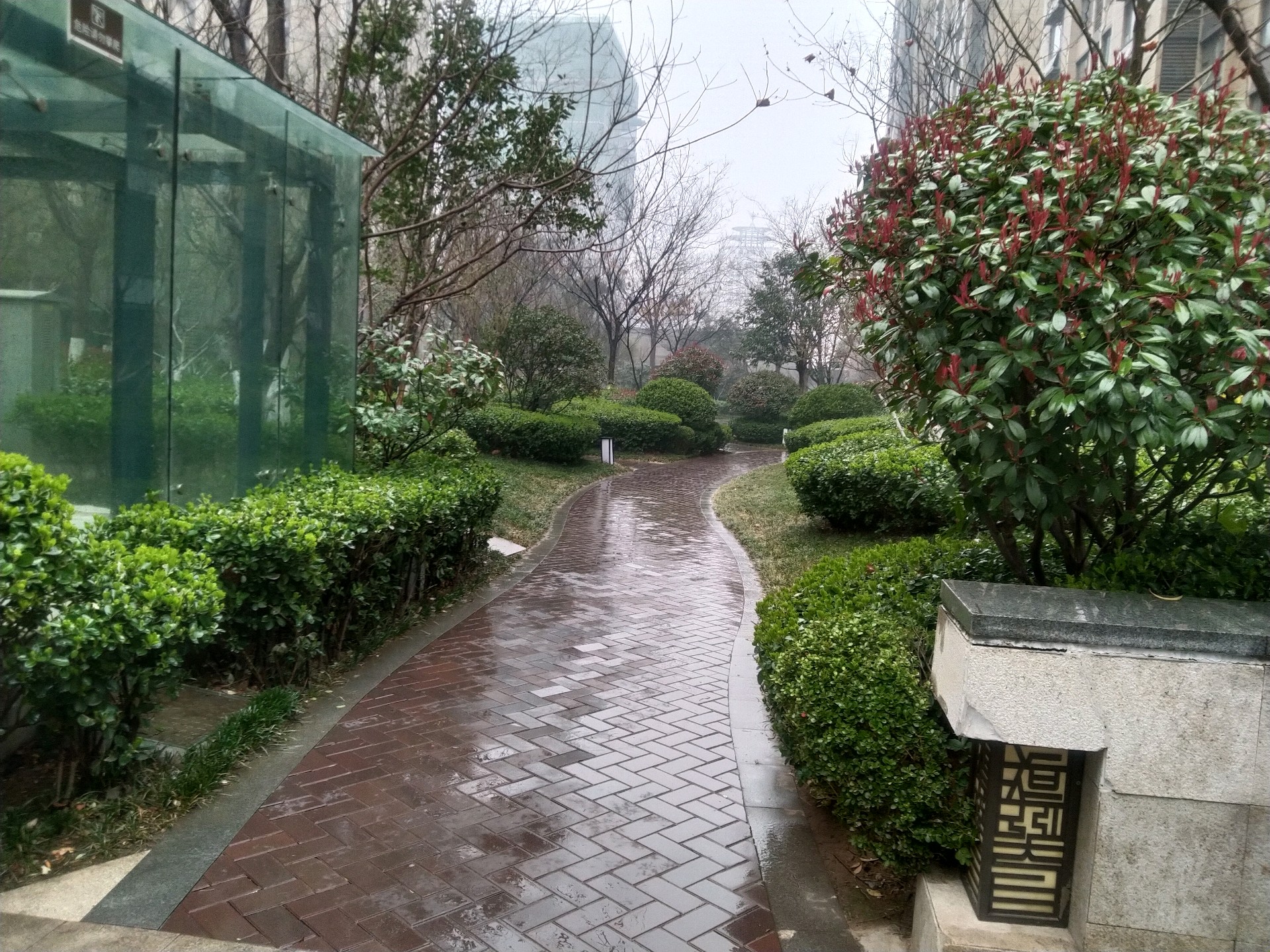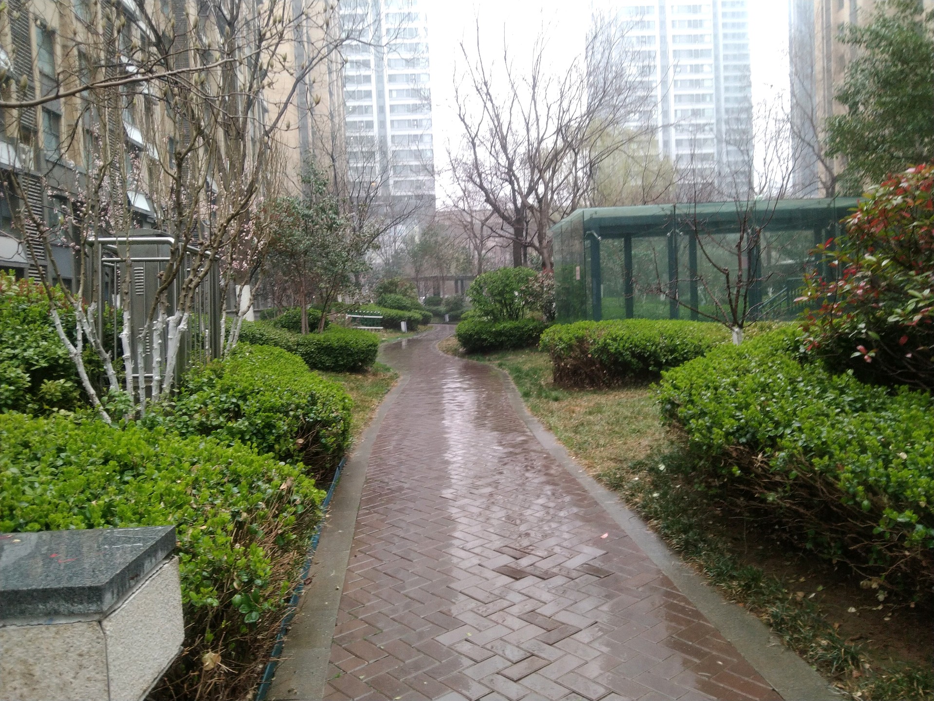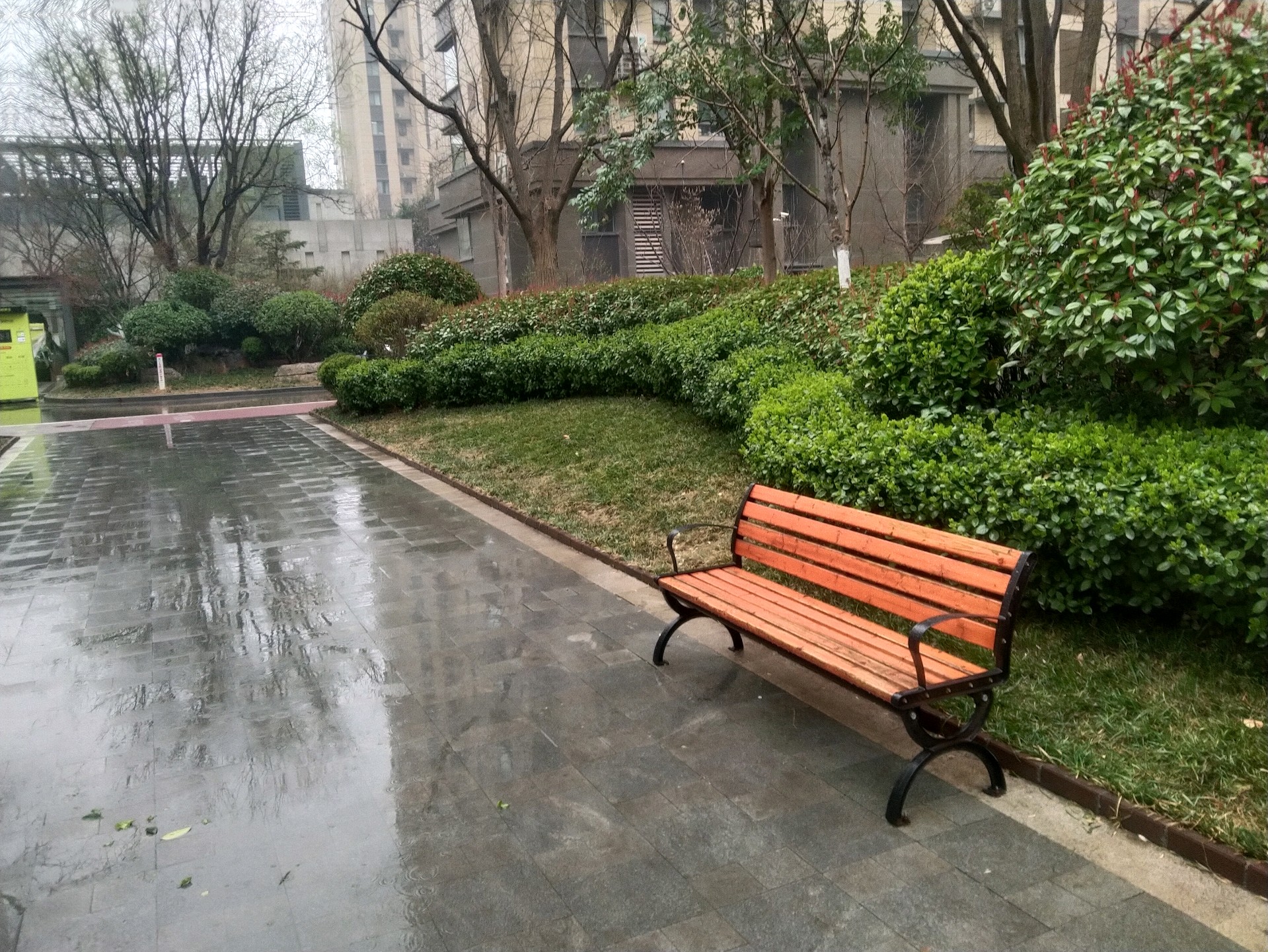 今天周末 淅沥沥的雨下起来,地面小面积有积水,绿植经过雨水的 灌溉与冲刷的后更加翠绿