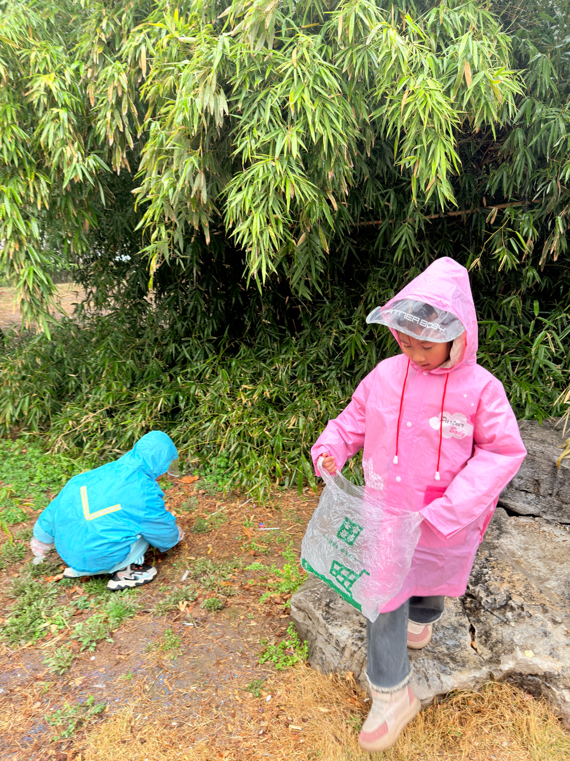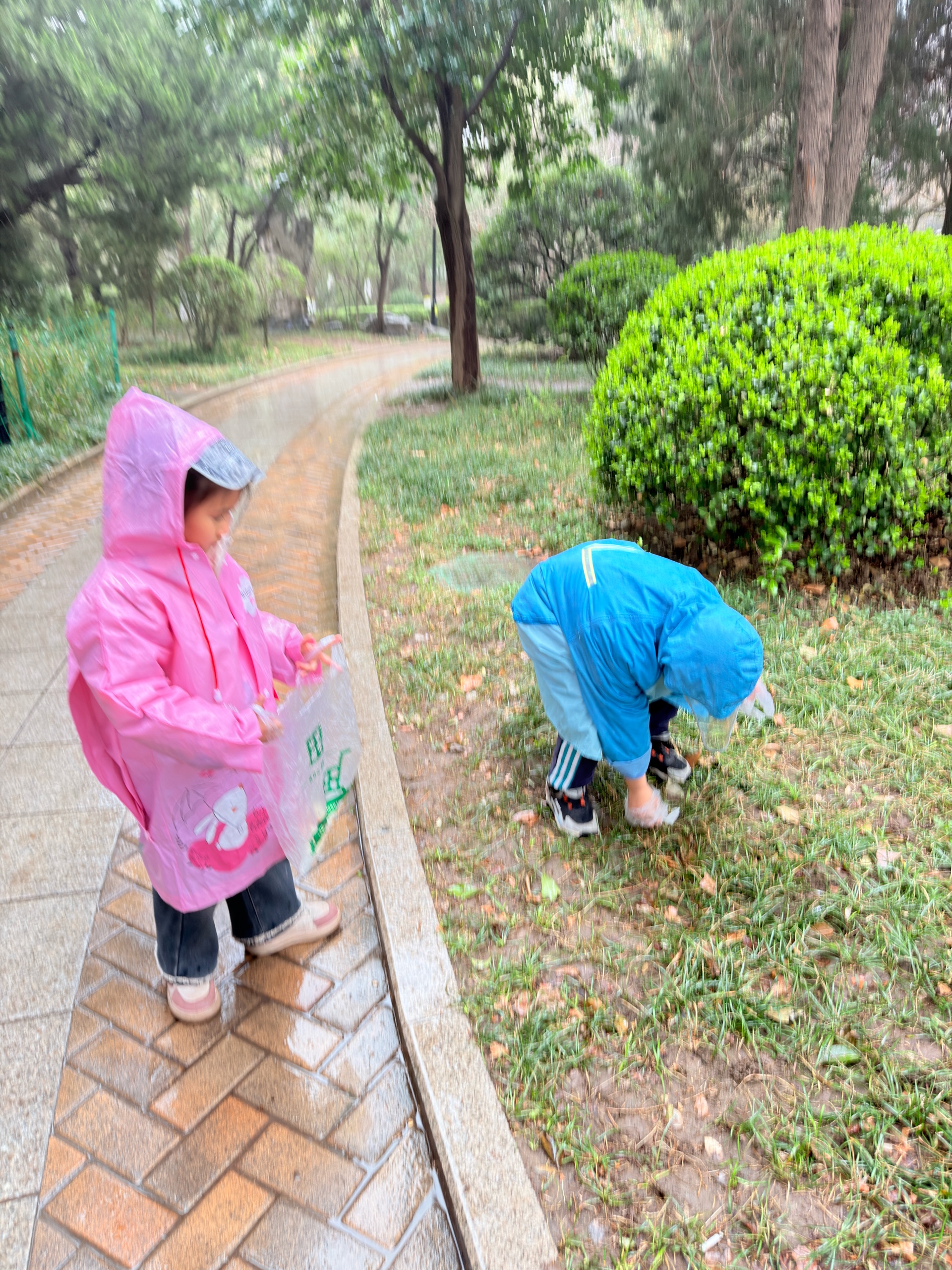 下雨天也挡不住保护环境的热情和步伐,捡起垃圾,让大家在整洁的公园中欣赏各种美丽的花朵。