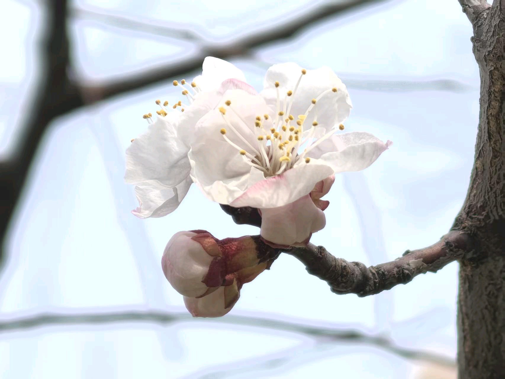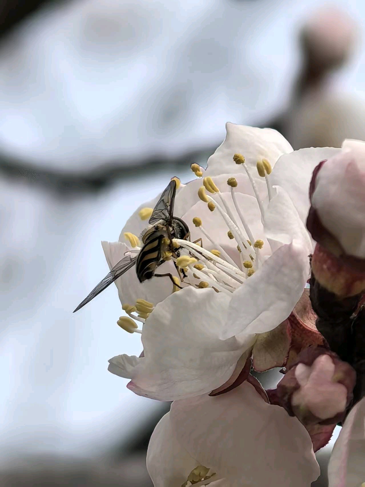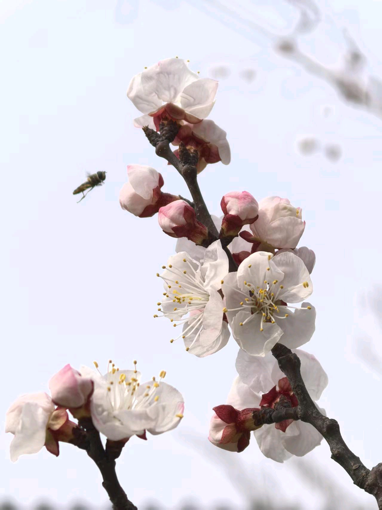 杏花开了,春意盎然,飞来一只蜜蜂在枝头飞舞。粉色花苞与白色花朵争相斗艳,仿佛在欢迎春天的到来。