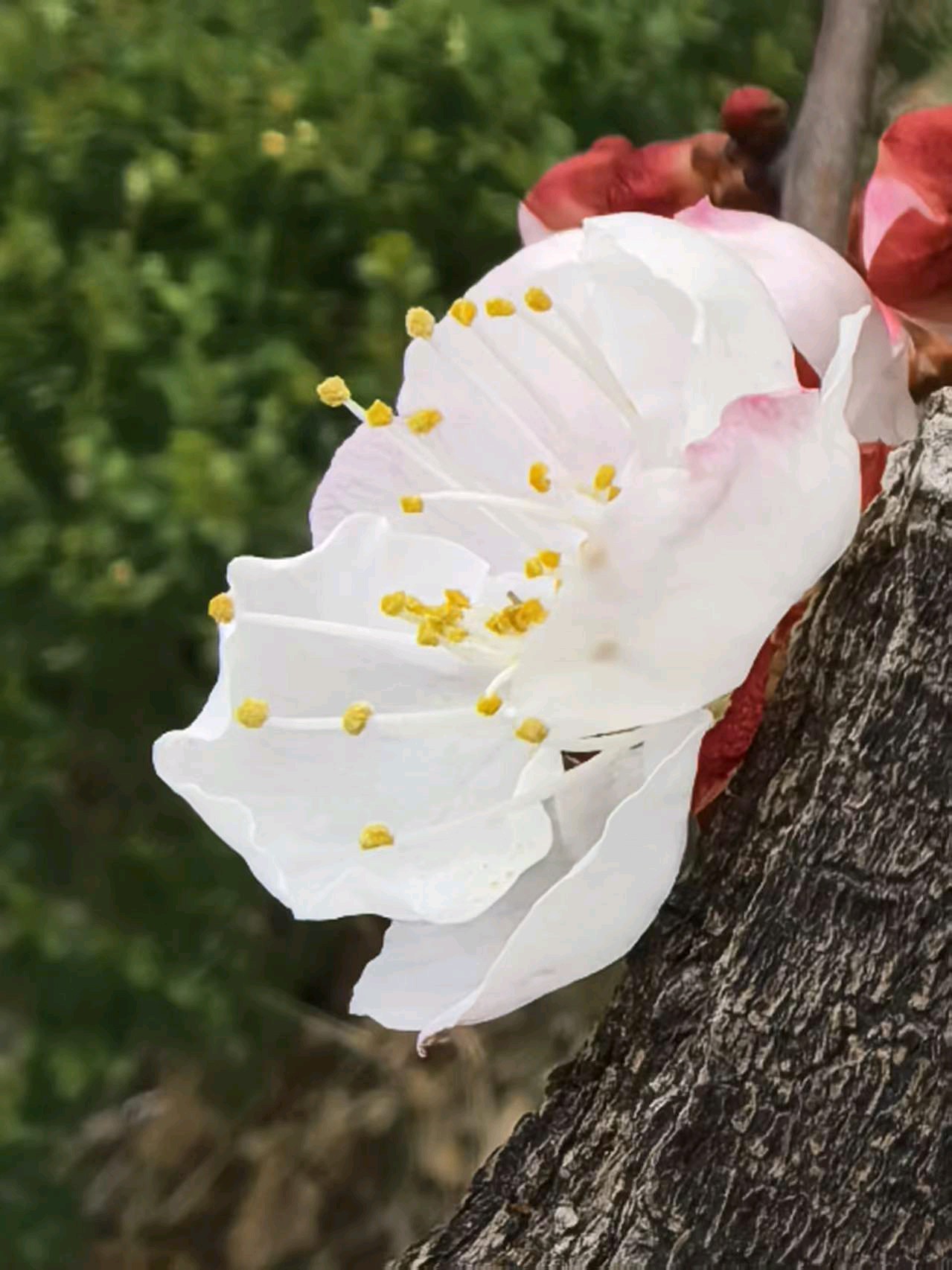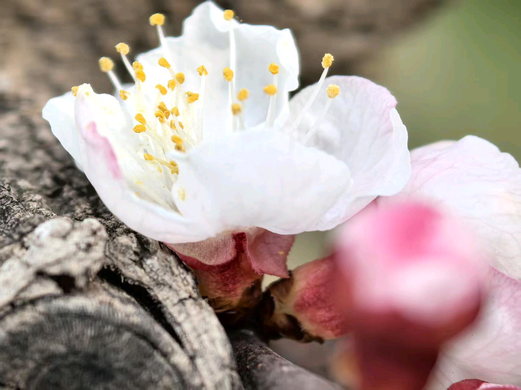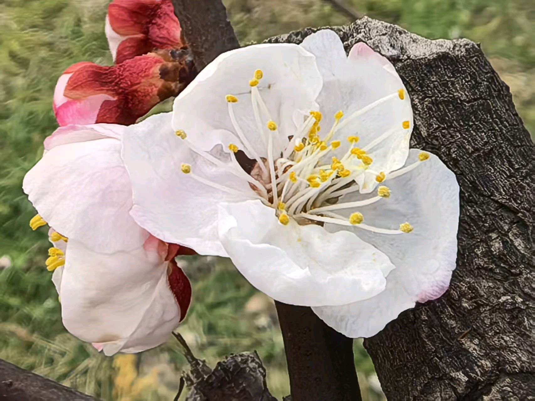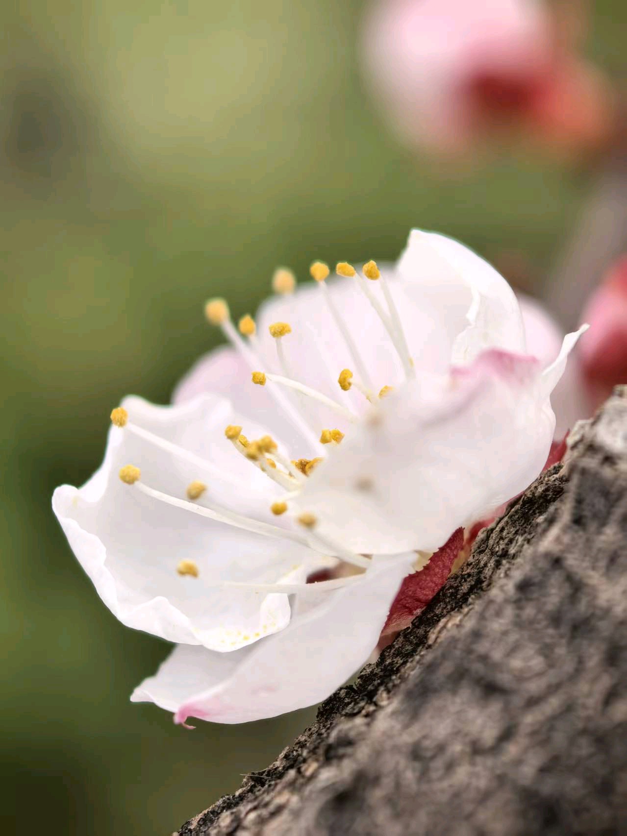 杏花开了,春意盎然,飞来一只蜜蜂在枝头飞舞。粉色花苞与白色花朵争相斗艳,仿佛在欢迎春天的到来。