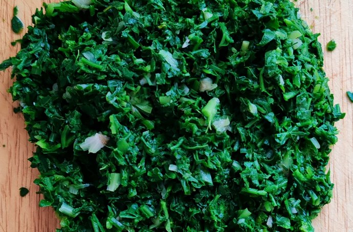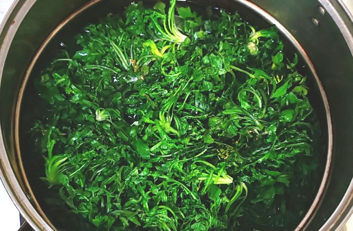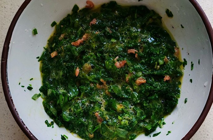 1. 荠菜去老根黄叶,淡盐水泡10分钟,反复冲净;水烧开加少许盐+几滴油,入荠菜焯水30秒,立即捞入冰水过凉,清洗干净,挤干水分,切成碎末。