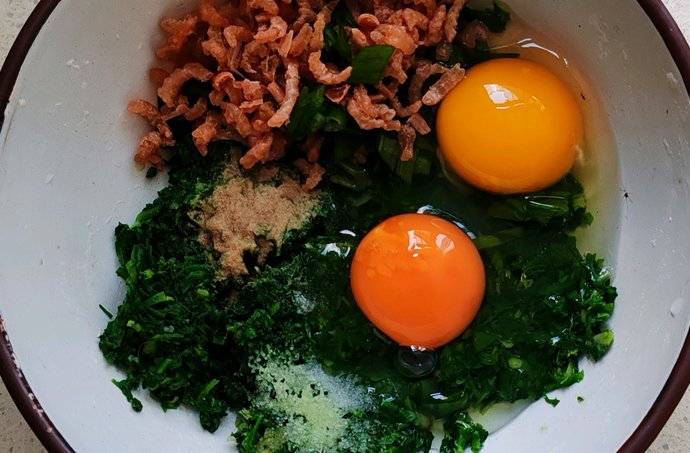 2. 鸡蛋打入碗中,加少许盐、虾米,胡椒粉,几滴料酒,拌入荠菜碎搅匀。