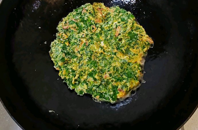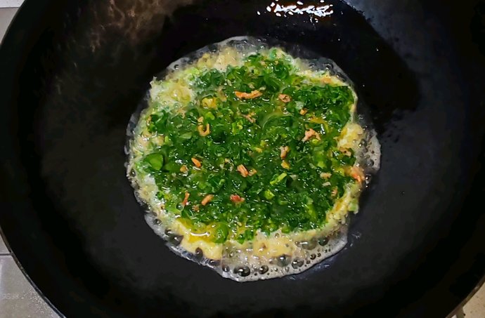3. 热锅凉油,油温七成热倒入混合蛋液;底部凝固后翻面,大火翻炒1分钟,蛋液全凝、荠菜翠绿,关火装盘。