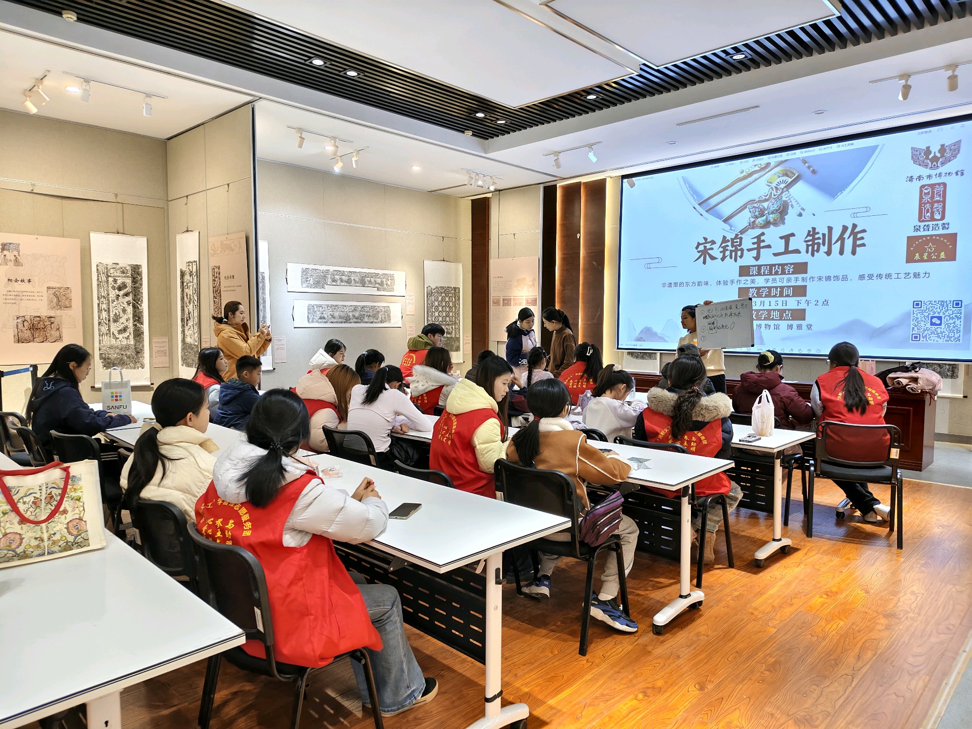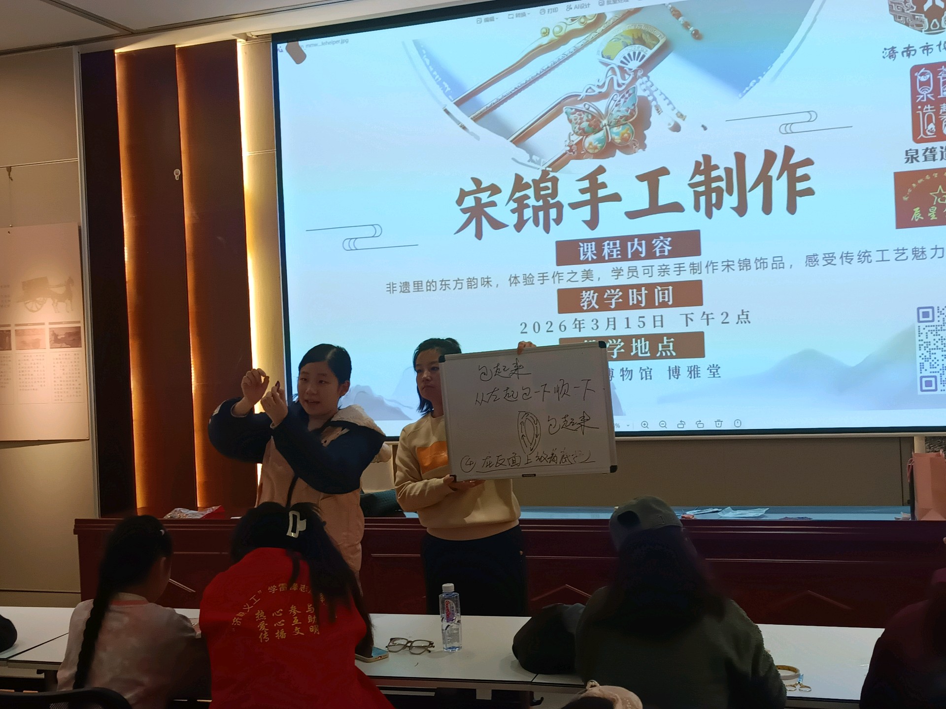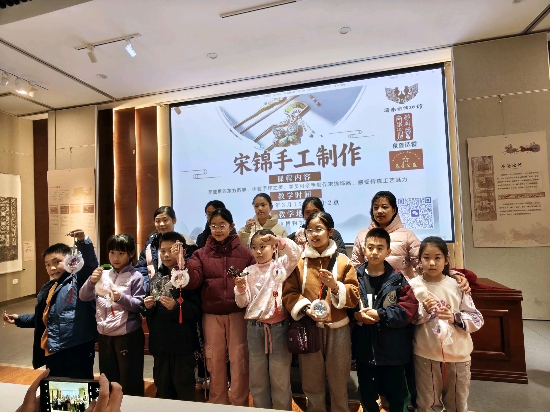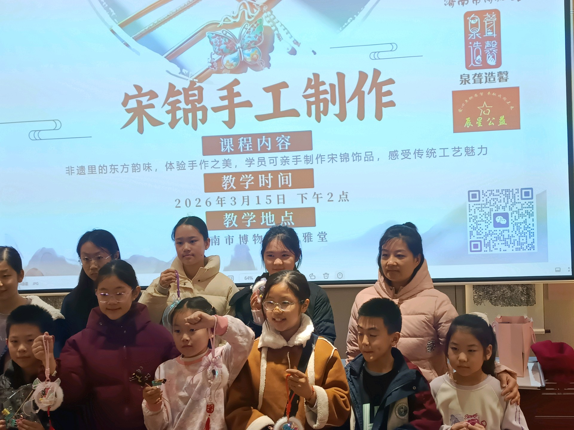 在济南市博物馆,以文化交流为契机,辰星公益团队和听障人士开展残健融合活动。大家一起到展厅参观馆藏清代楹联展,在博雅堂携手制作工艺品,体验非遗宋锦的魅力。泉聋造馨聋人代表和辰星公益曼妮队长联合现场教学。爱出者人必爱之,济南职业学院的志愿者踊跃帮忙手工制作。聋人代表赠送手作给本次辰星活动志愿者。