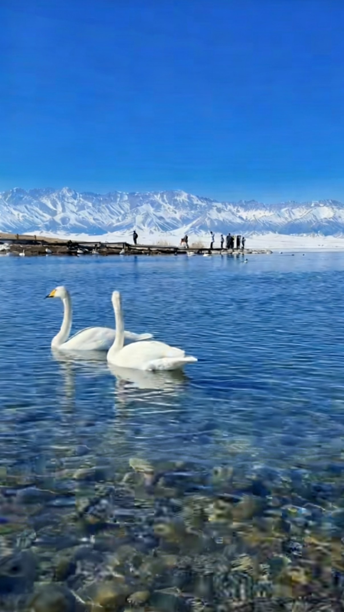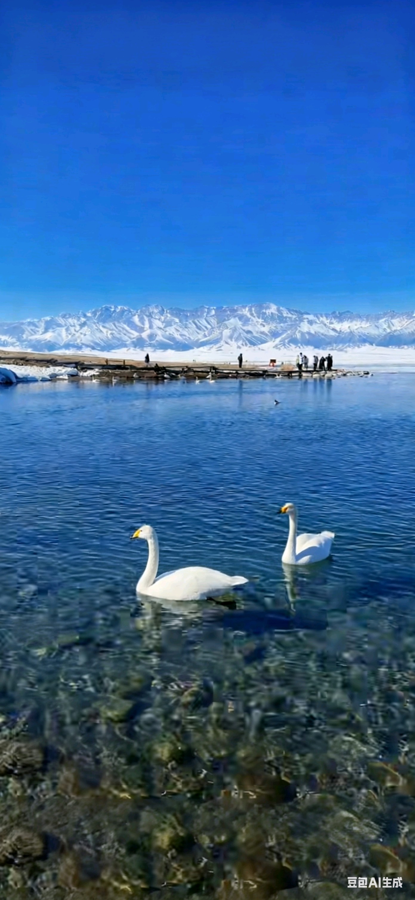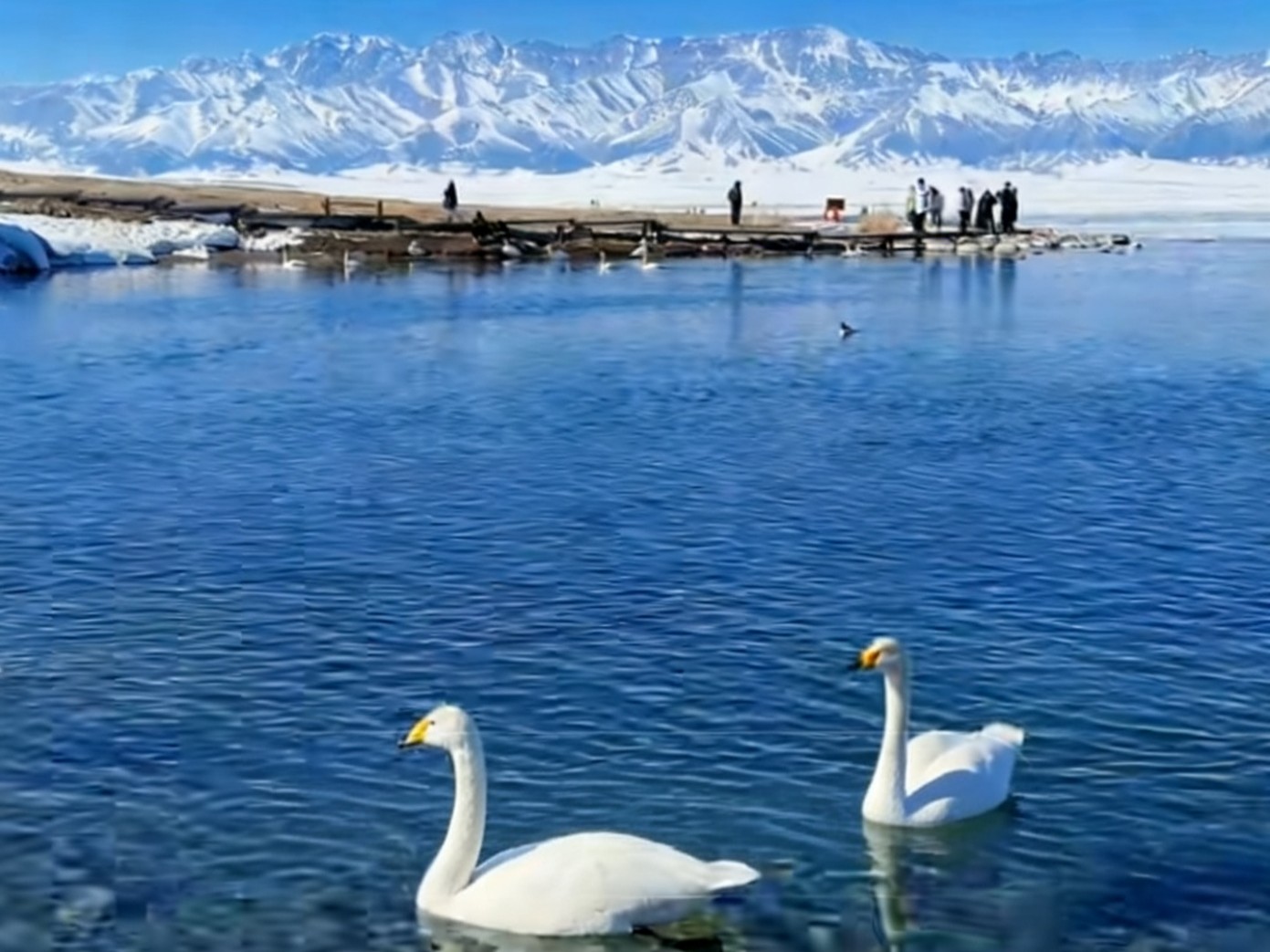 赛里木湖以纯净优美的自然风光吸引了大量的白天鹅前来过冬,被称作天鹅湖