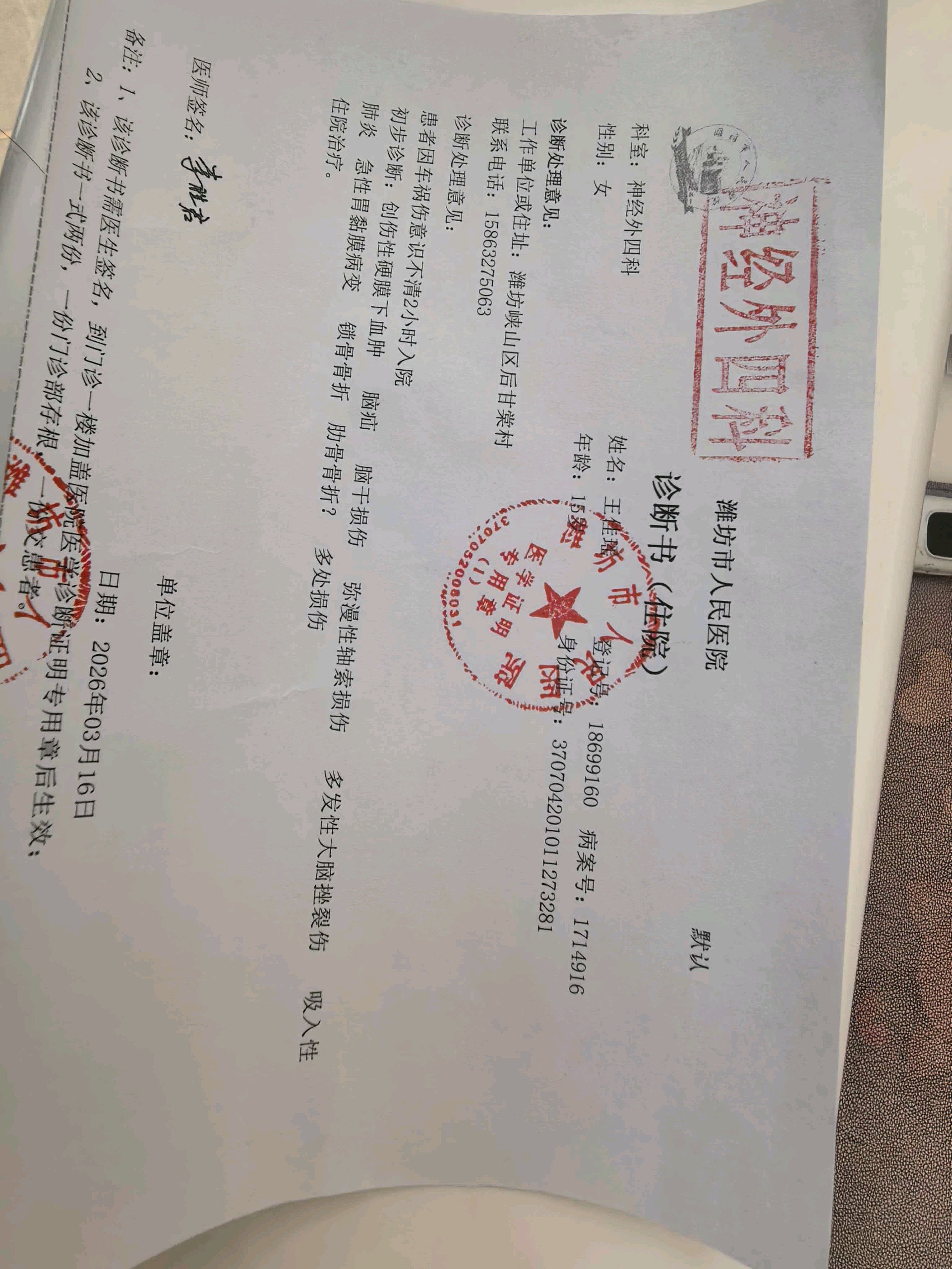 3月18日,我正在家中整理拥军图片,周六上午,泉城义工志愿服务站里,一群学生聆听拥军故事。可就在这时,接到来自山东潍坊的电话,是潍坊峡山区太保庄街道后甘村村民王启玉打来电话,带着哭腔的声音:他的女儿王佳瑶,是峡山凤凰学校初三三班的学生,正值花一般的年纪,本该在教室里为了梦想奋力拼搏,却在3月13日遭遇了一场突如其来的横祸。那天,王佳瑶在家附近取快件时,被当地一辆皮卡车撞倒,小小的身体重重摔在冰冷的路面上,被紧急送往潍坊市人民医院,经诊断为多发性大脑挫裂伤、脑干损伤等严重伤情,立即进行开颅手术。