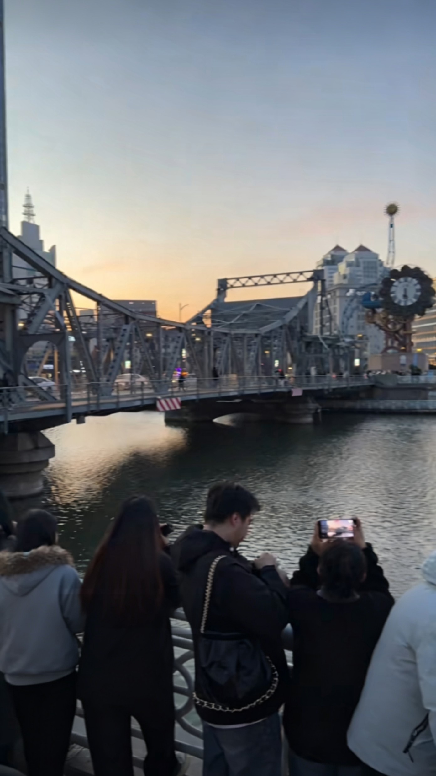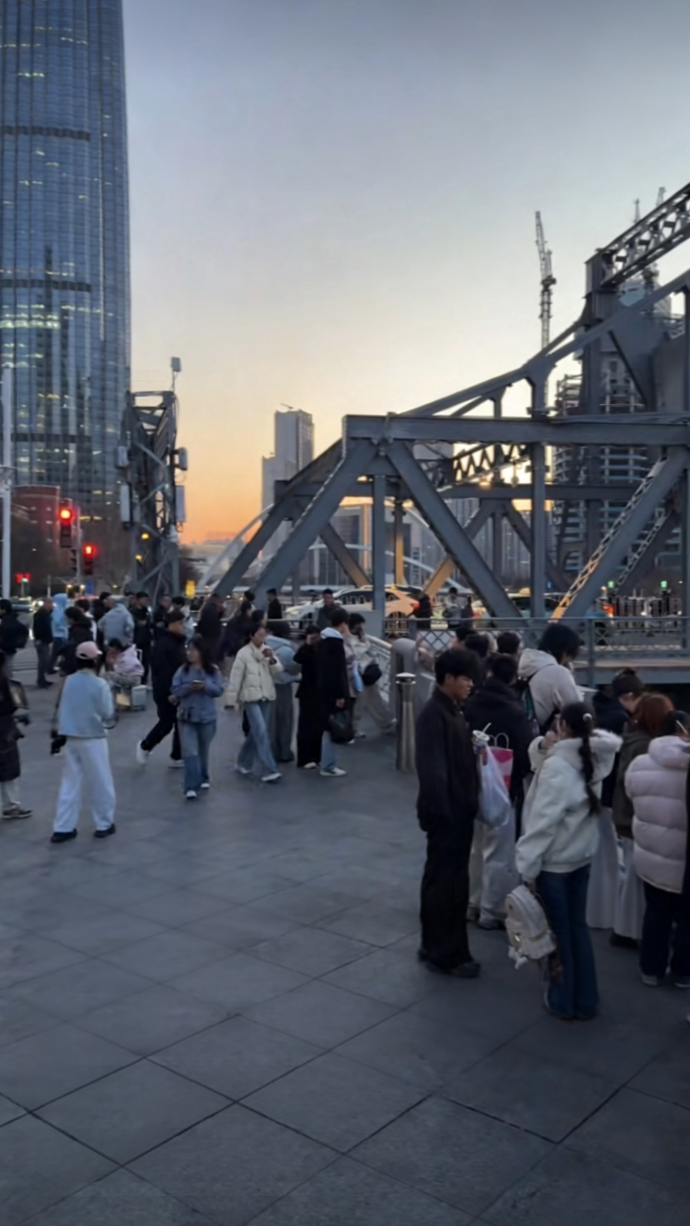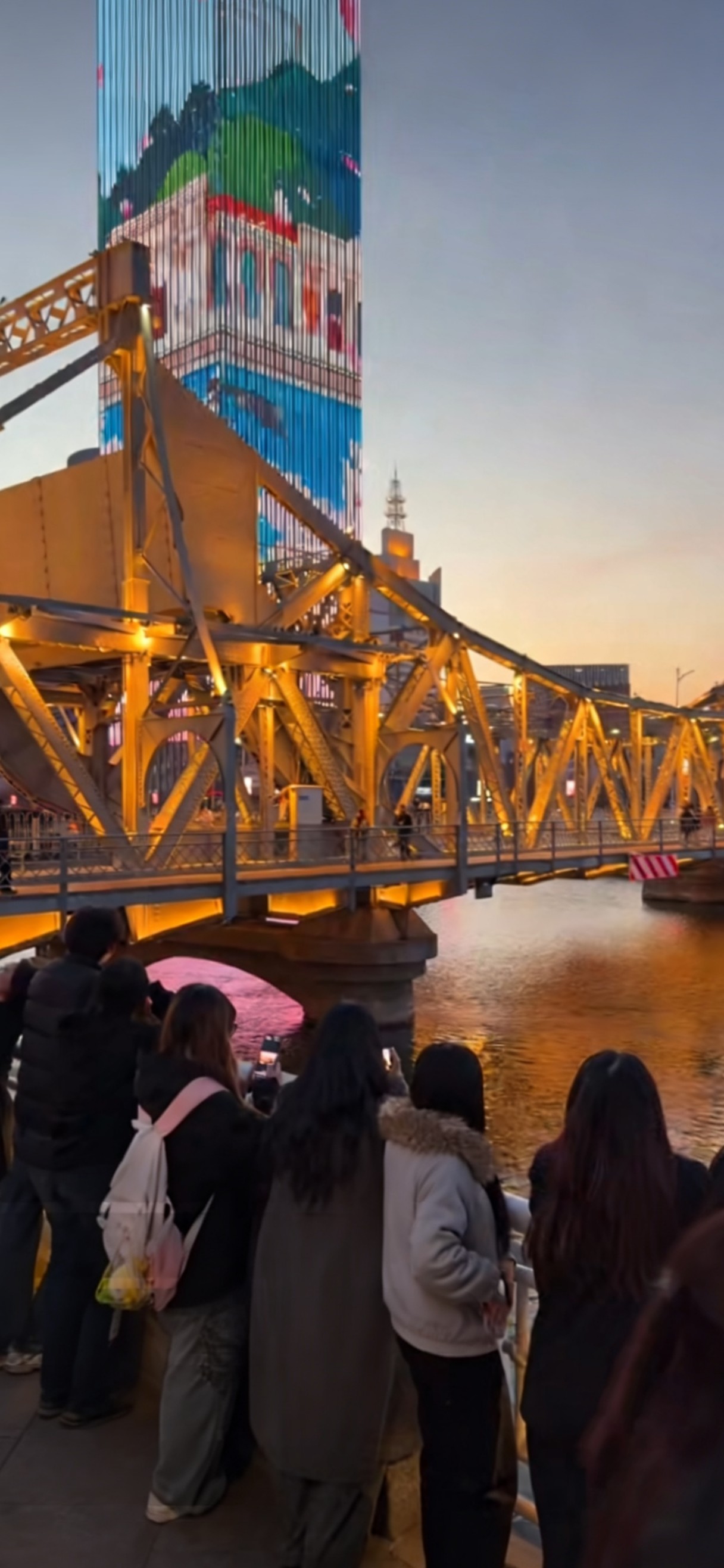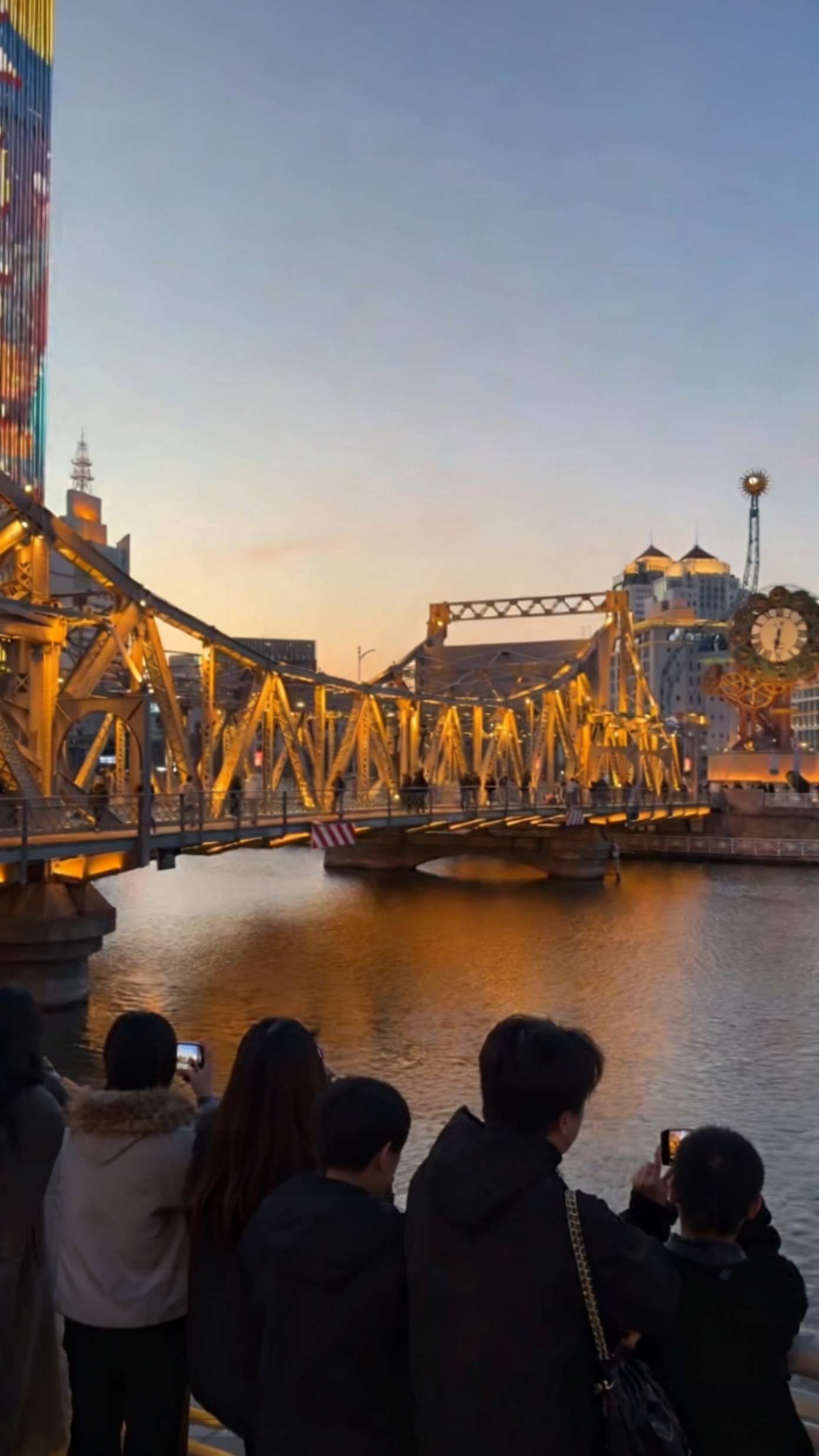 暮色未沉时,解放桥以素色钢铁静卧海河之上。夕阳为桥身镀上浅 金,华灯初上,光影骤起。暖黄灯光顺着钢梁蜿蜒展开,将冰冷钢铁化作鎏金长虹。桥身璀璨,倒影入河,随波漾成星河;对岸津湾灯火辉映,世纪钟鸣悠扬,晚风裹着烟火气,百年老桥瞬间鲜活,尽显津门夜的浪漫与繁华。