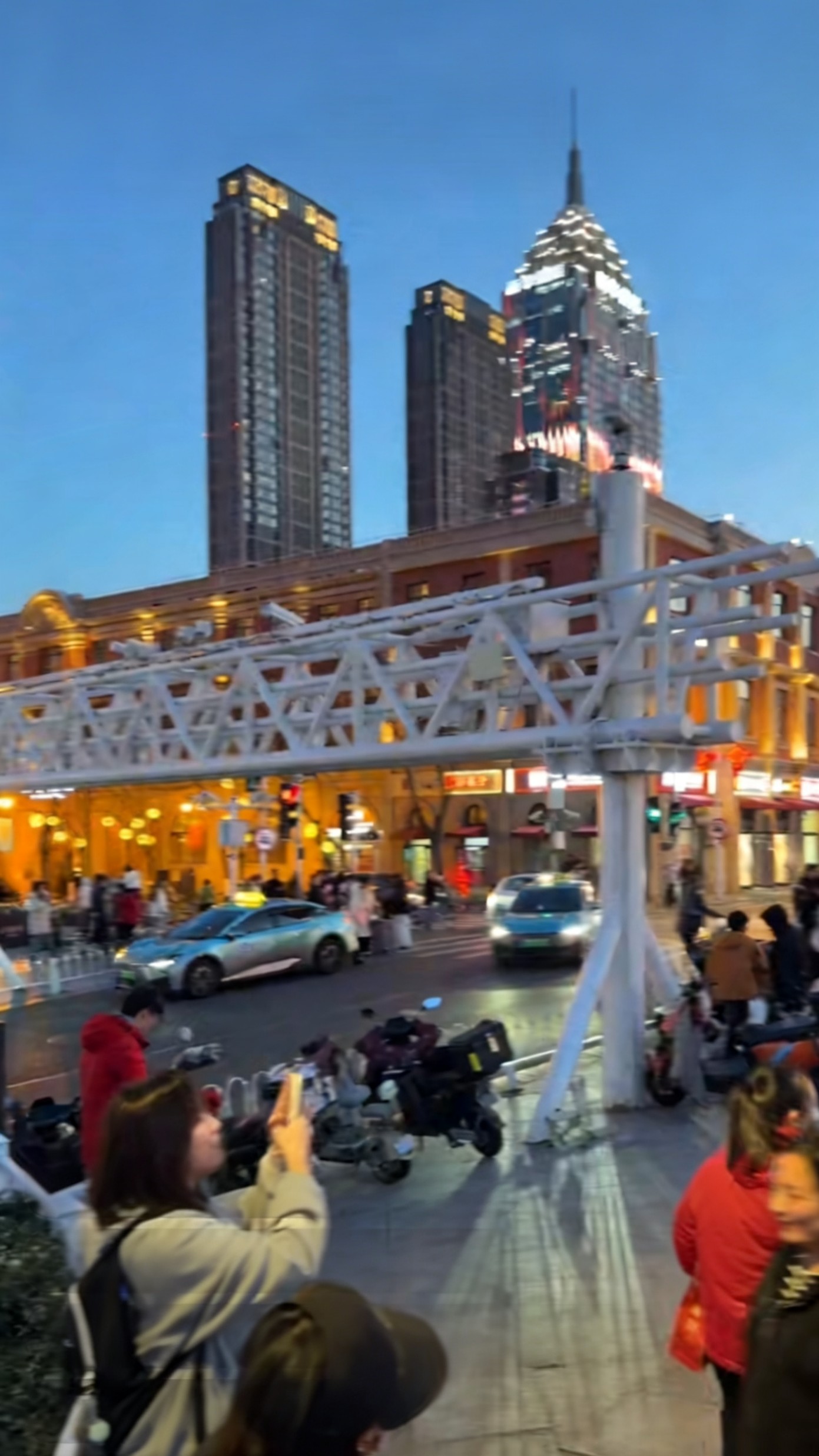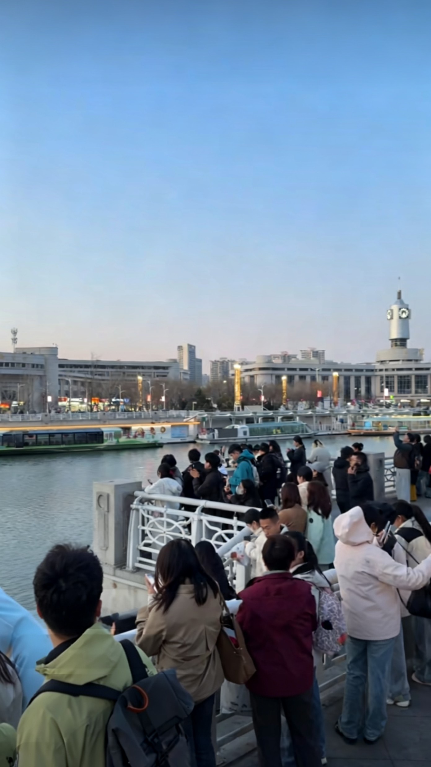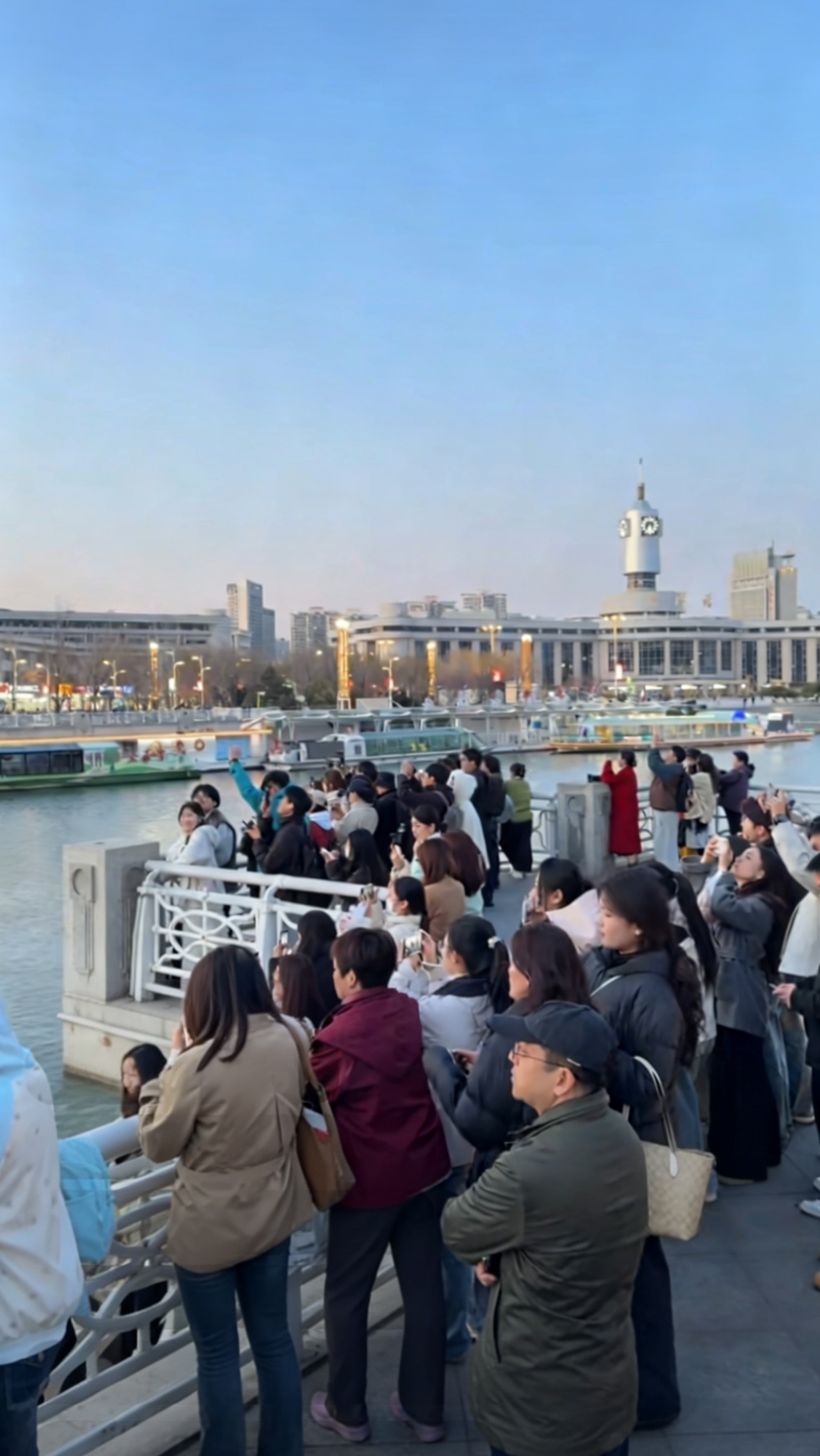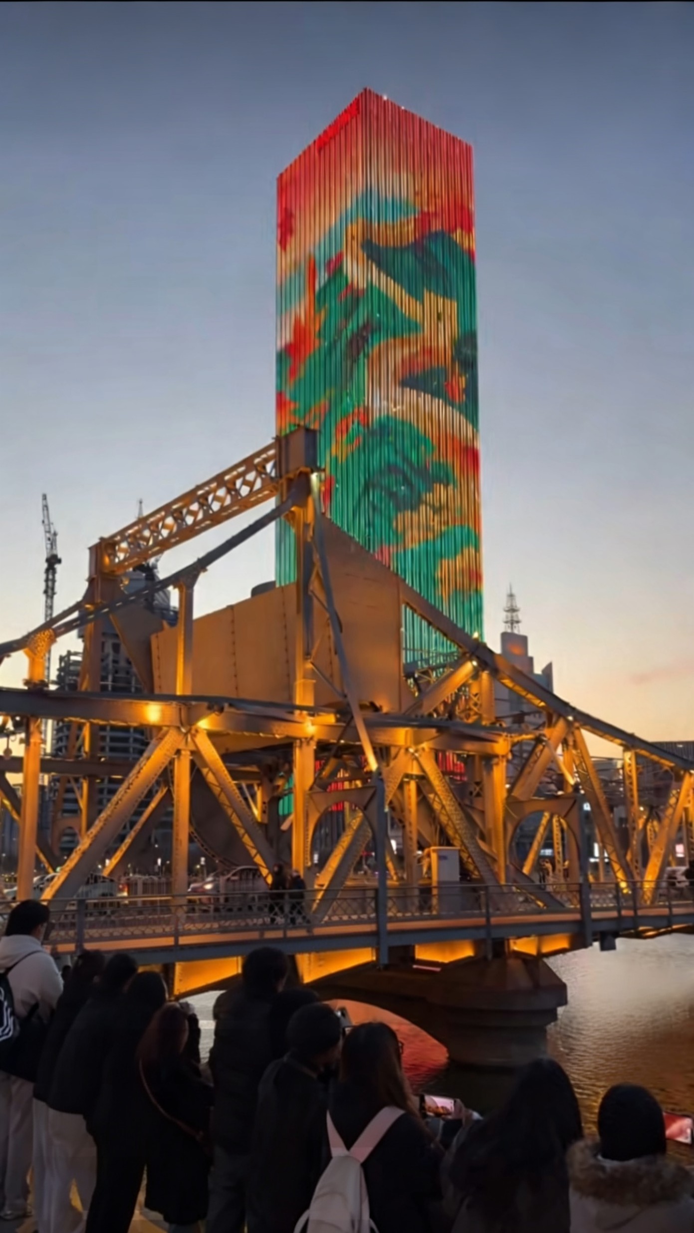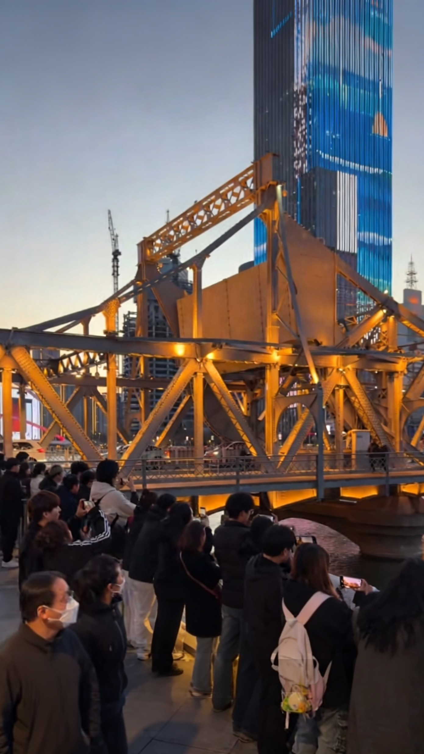 暮色未沉时,解放桥以素色钢铁静卧海河之上。夕阳为桥身镀上浅 金,华灯初上,光影骤起。暖黄灯光顺着钢梁蜿蜒展开,将冰冷钢铁化作鎏金长虹。桥身璀璨,倒影入河,随波漾成星河;对岸津湾灯火辉映,世纪钟鸣悠扬,晚风裹着烟火气,百年老桥瞬间鲜活,尽显津门夜的浪漫与繁华。