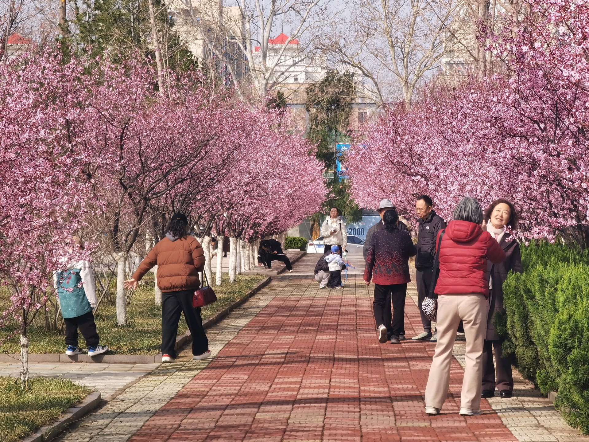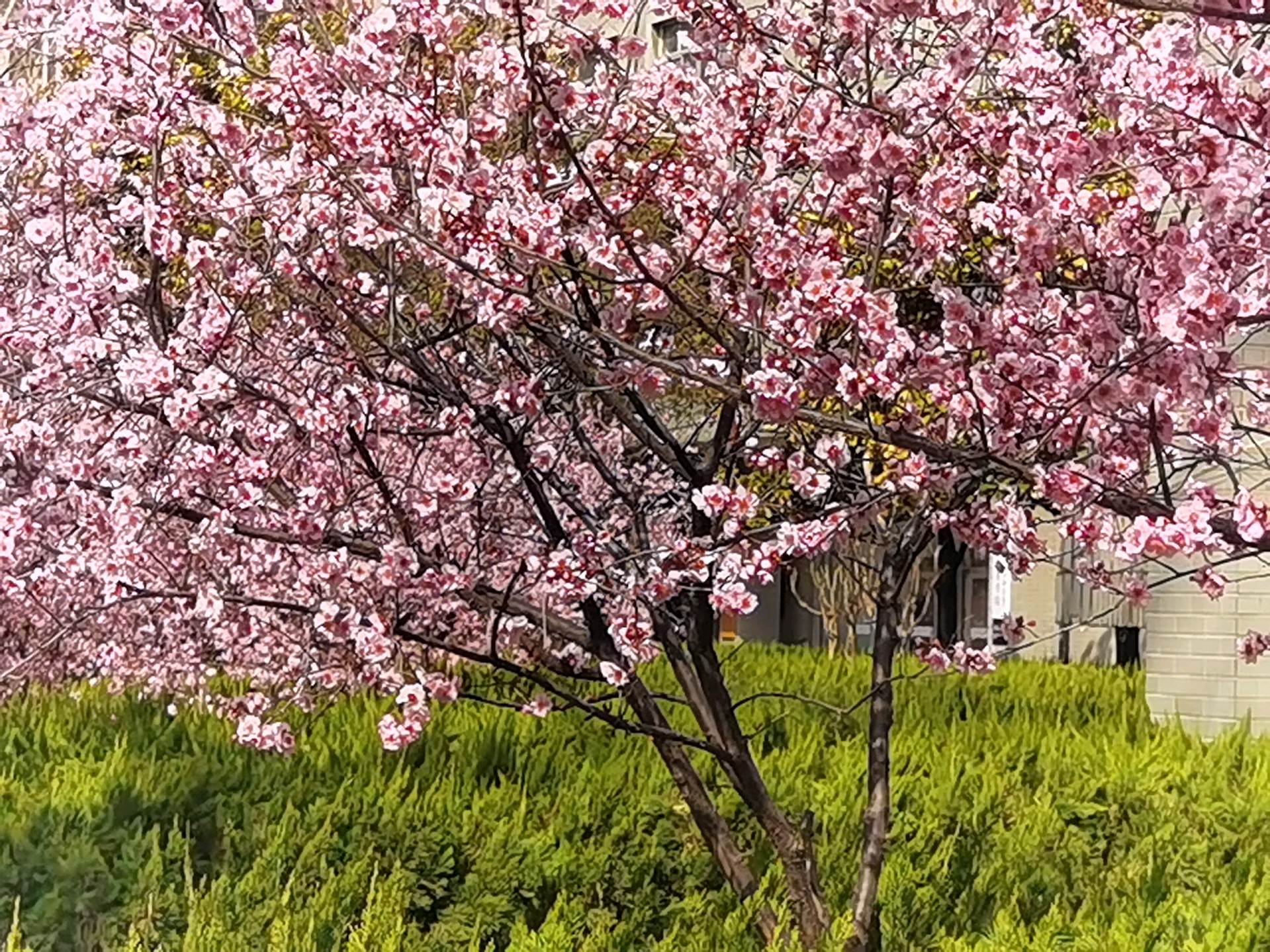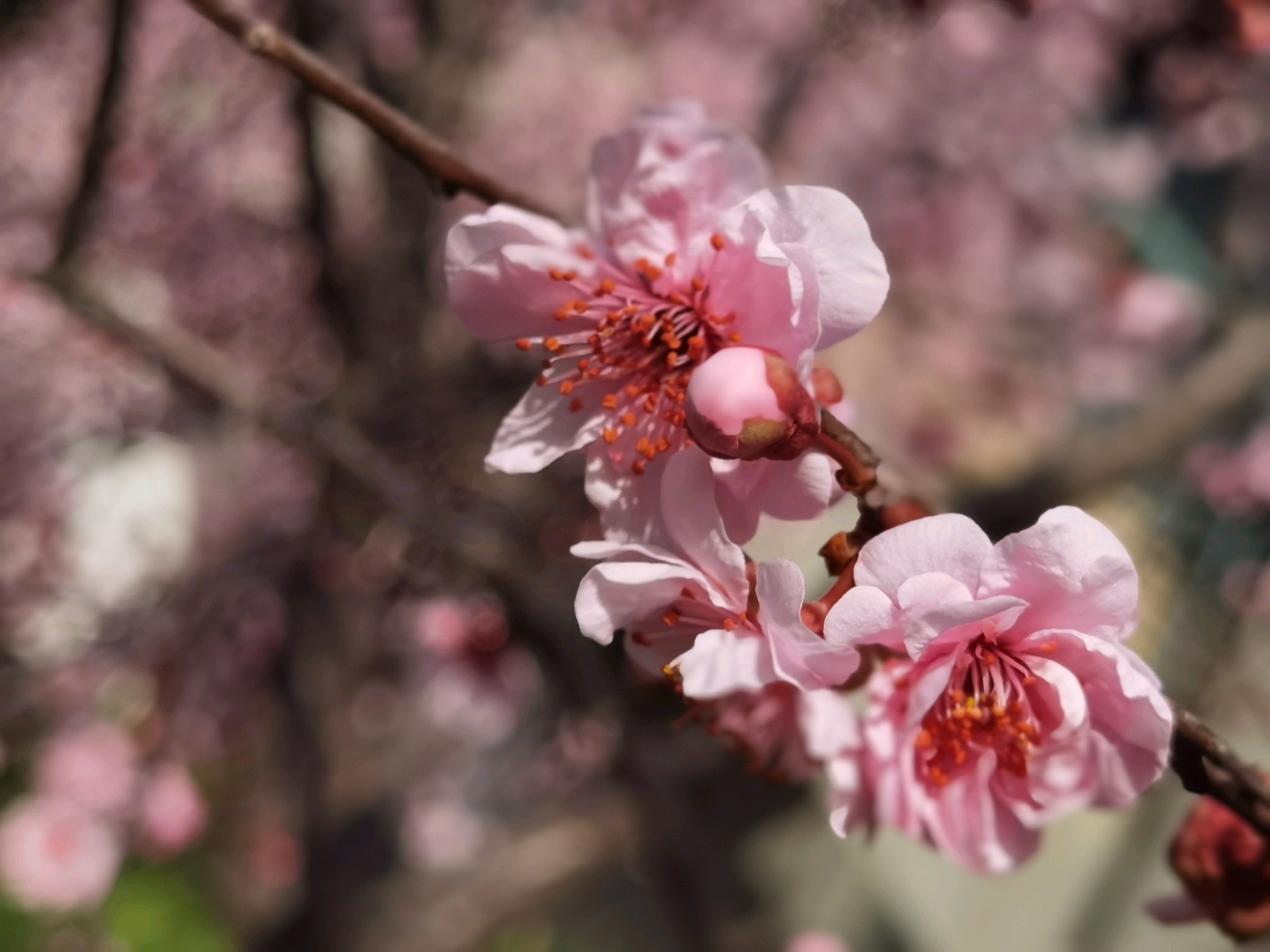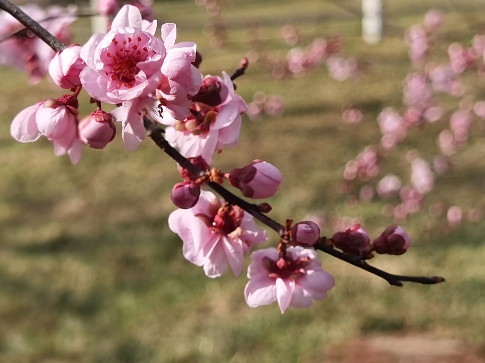 山大校园内粉色美人梅盛开,如诗如画,非常好看,享受这一刻的美好。