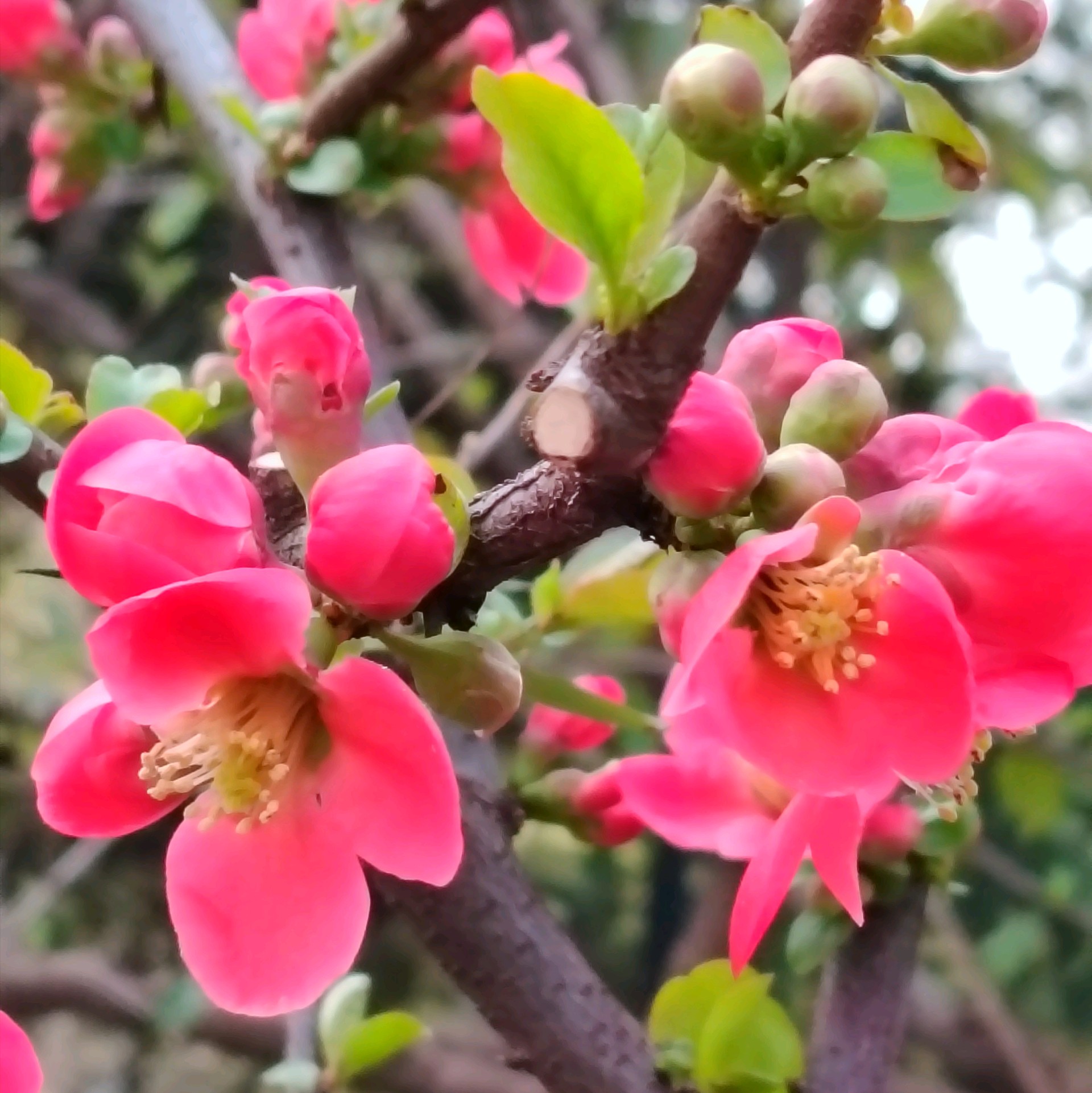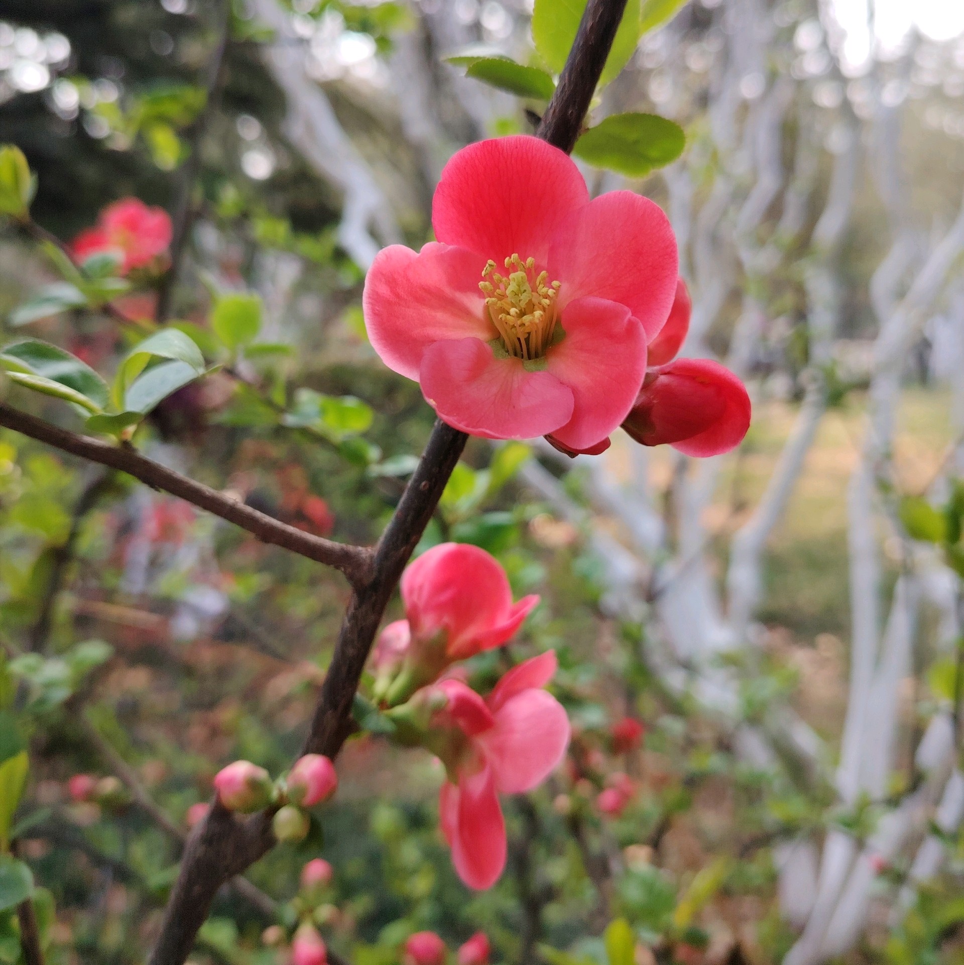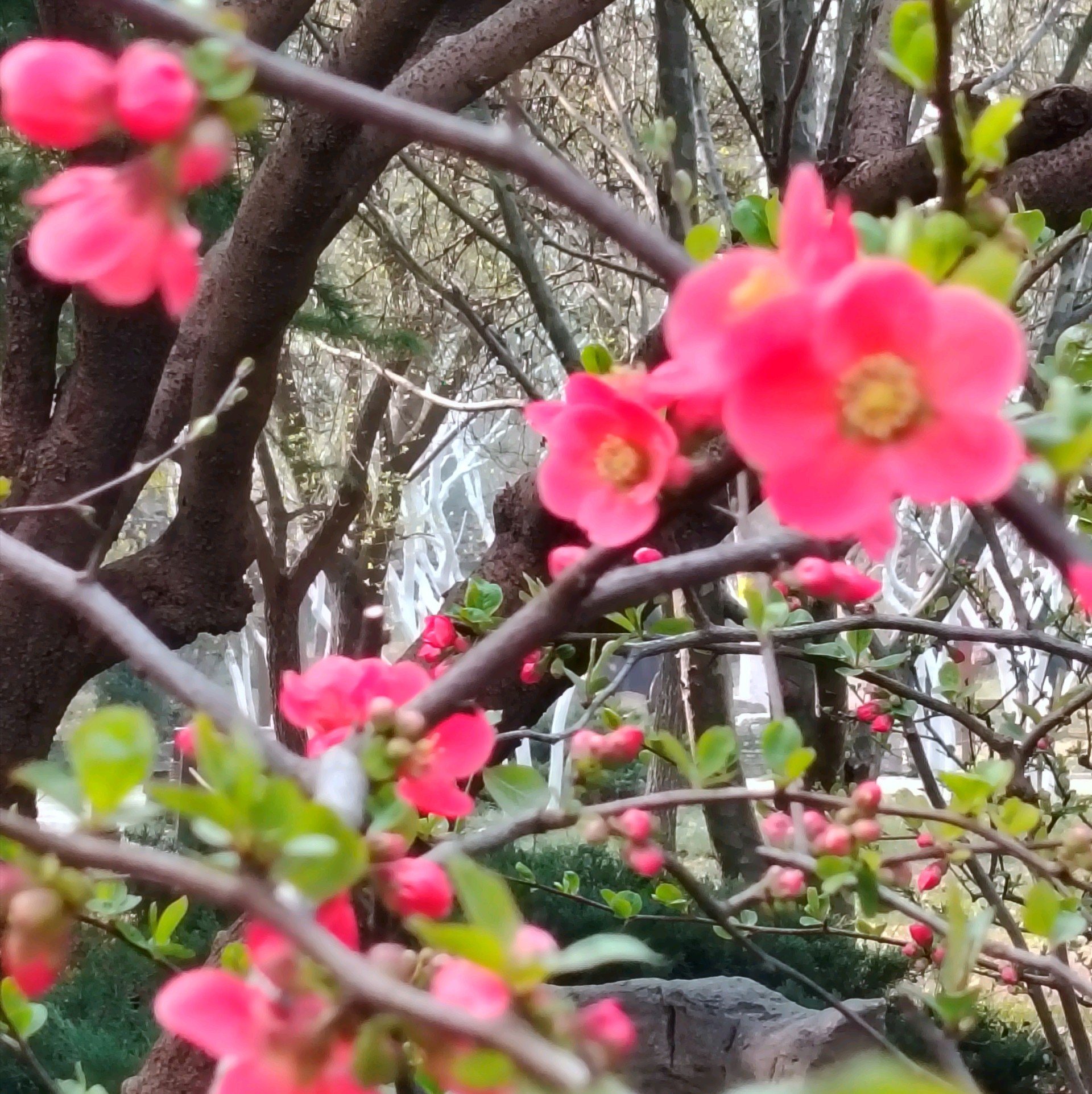 雨后放晴,百花公园里的贴梗海棠花紧紧贴着树枝绽放了,红艳艳的好漂亮!