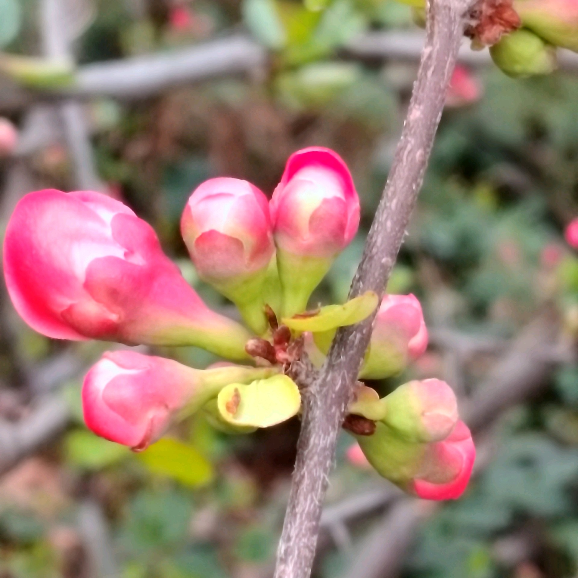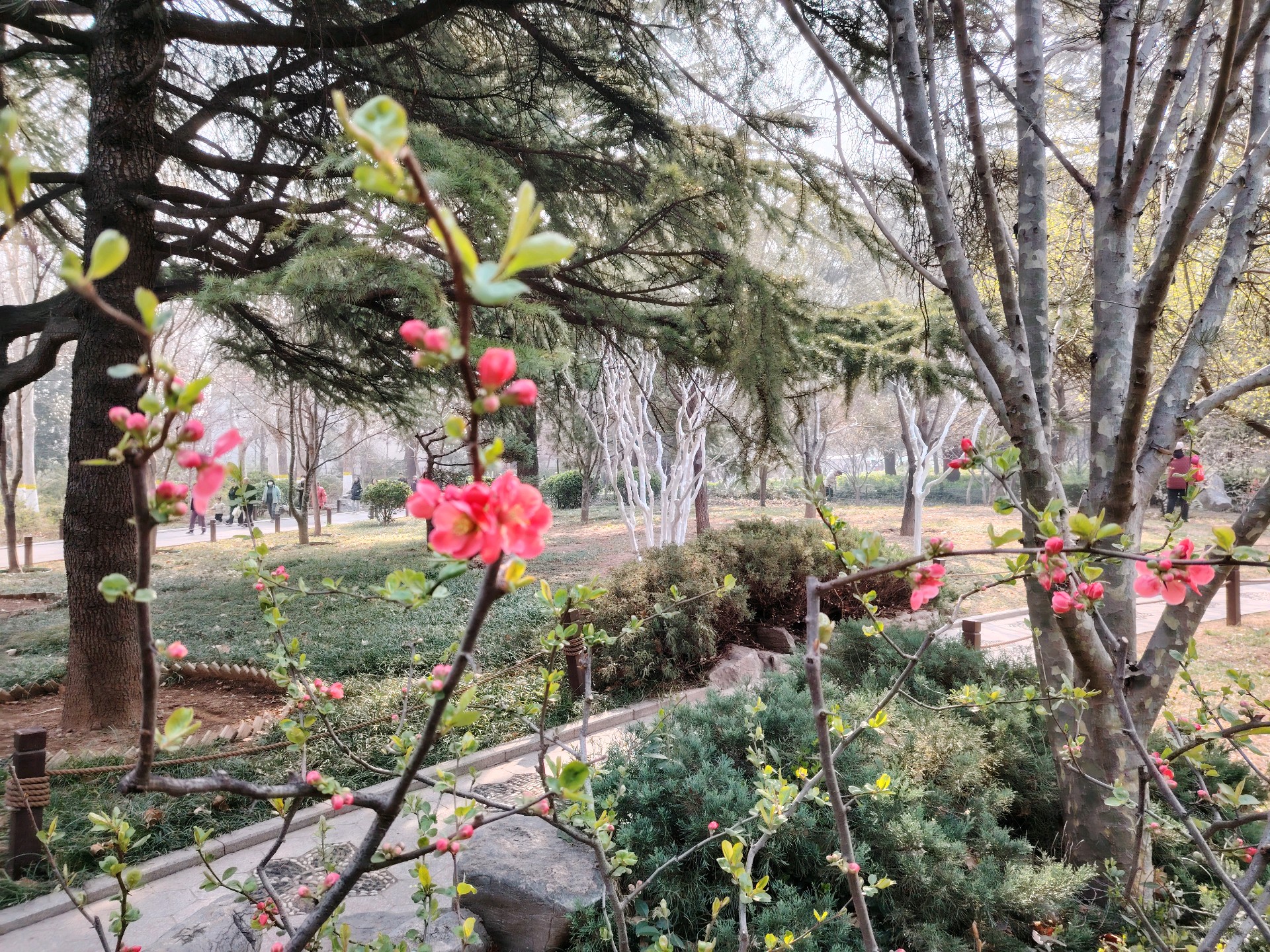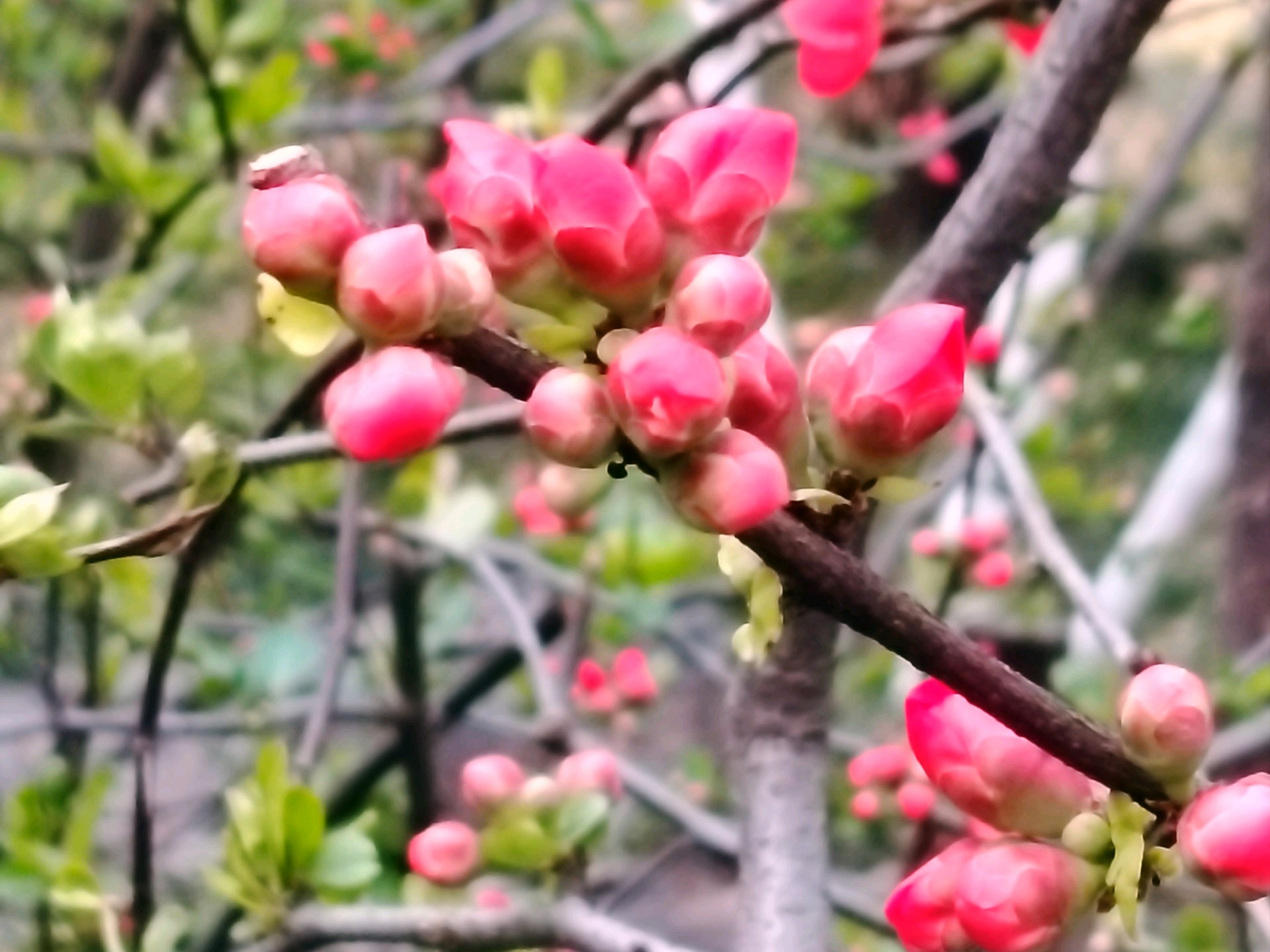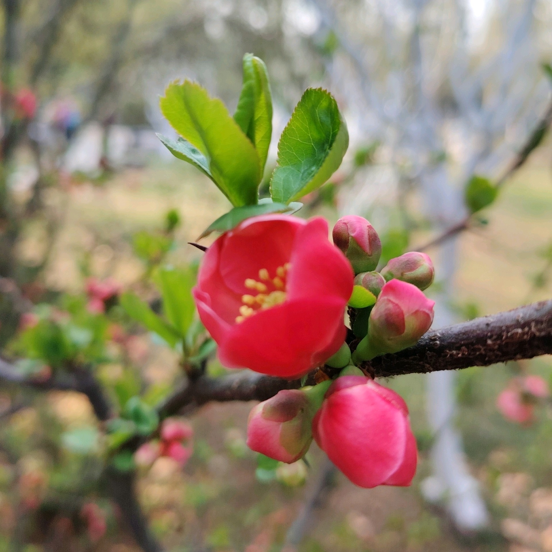 雨后放晴,百花公园里的贴梗海棠花紧紧贴着树枝绽放了,红艳艳的好漂亮!