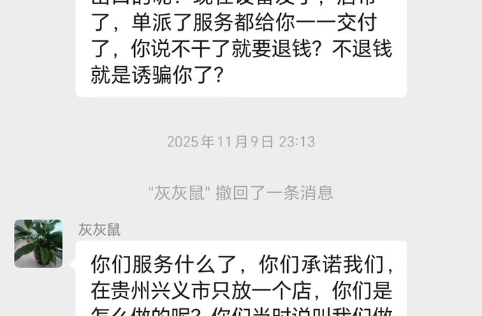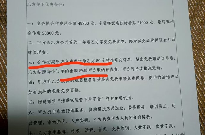 河南周口人被山东航宇家政服务有限公司洁满家骗加盟骗钱!24年7月加盟山东航宇家政服务有限公司洁满家,当时业务员天天给打电话,让去考察,洁满家承诺什么都不用管,只管干好活听话照做就能赚大钱,担心没有订单公司免费送50个订单,免费单送完以后继续派单,洁满家还承诺机器终身免费换新或者维修,但是给配的机器非常垃圾,经常坏,找他们换新他们根本不搭理。他们还承诺说是周口就只让加盟一家,不会再让其他人再加盟,结果2024年9月在周口又骗了一家让人家加盟。跟他们要免费的50单,他们就随便给了几十个电话,不是订单,那些电话根本就不要家政服务,很多电话还打不通,这就算给了50单,他们就是在骗人!因为免费50单的问题还骗我们又多花了好几千一点效果都没有,让退款不退,让他们兑现承诺他们的员工就在服务群开始辱骂!骗了加盟费还要辱骂加盟商!天理难容,请相关部门尽快去查查山东航宇家政洁满家这种骗子公司,他们这种垃圾公司怎么会被相关部门允许招商加盟拿到招商加盟资质的!