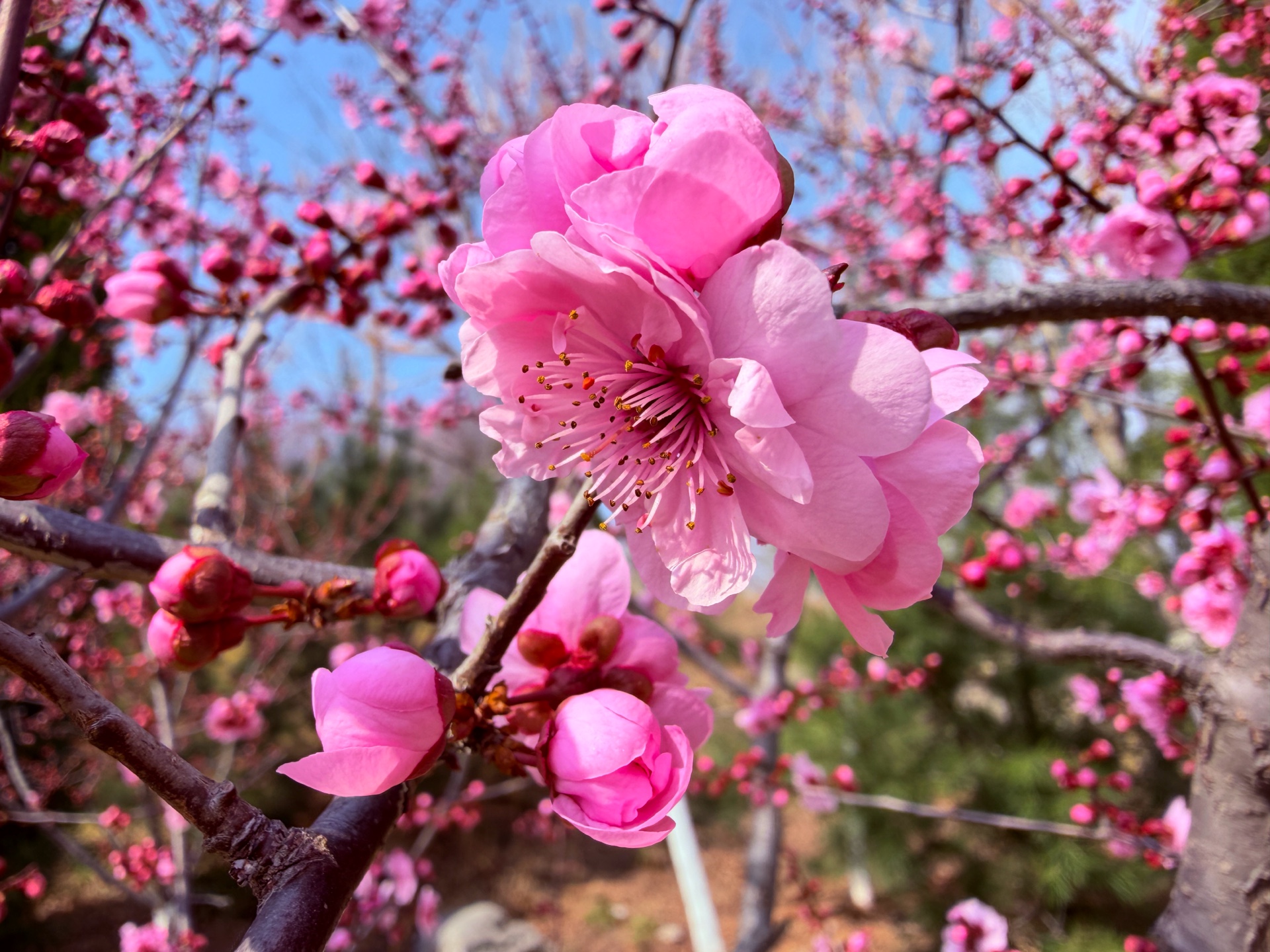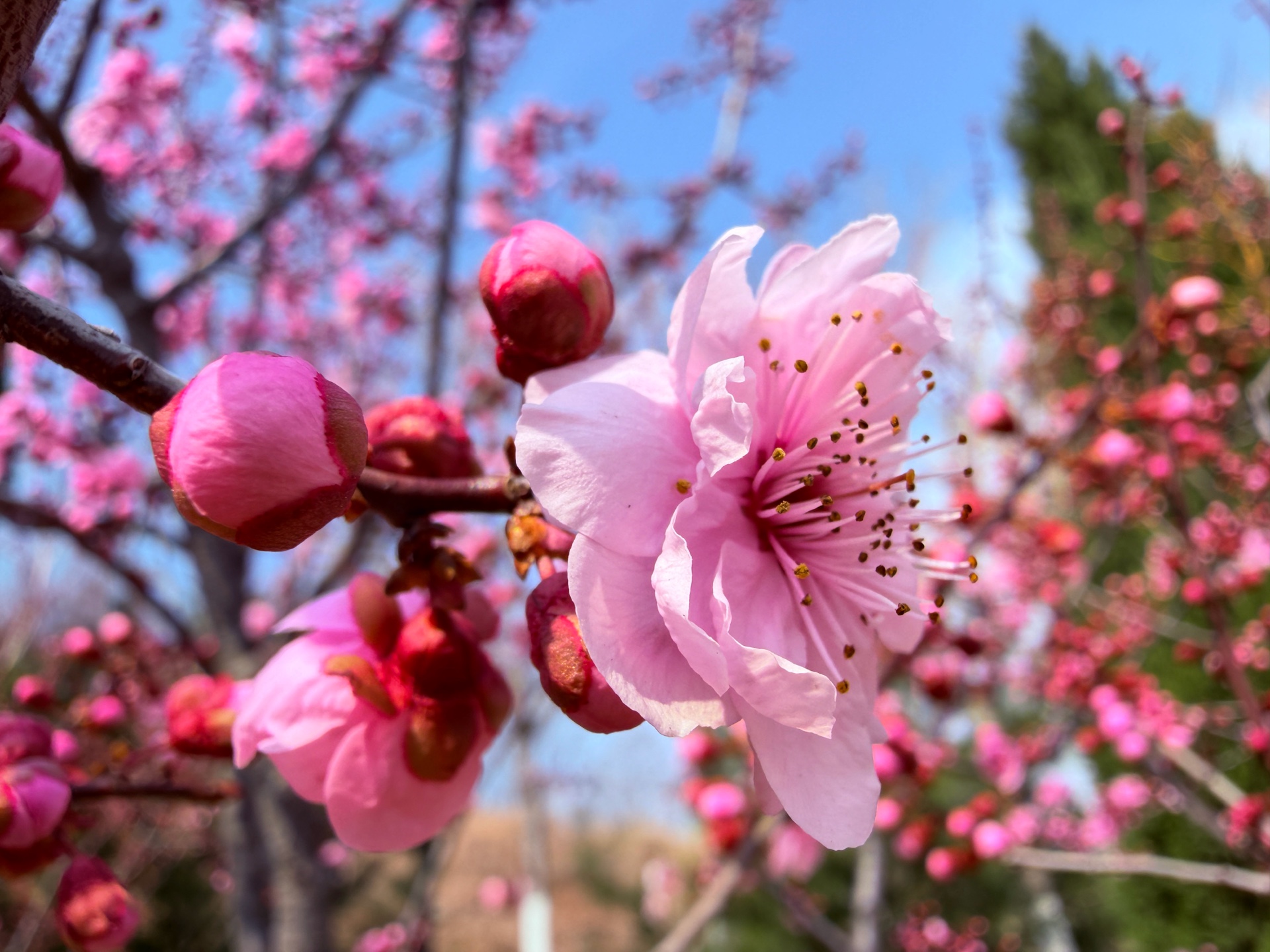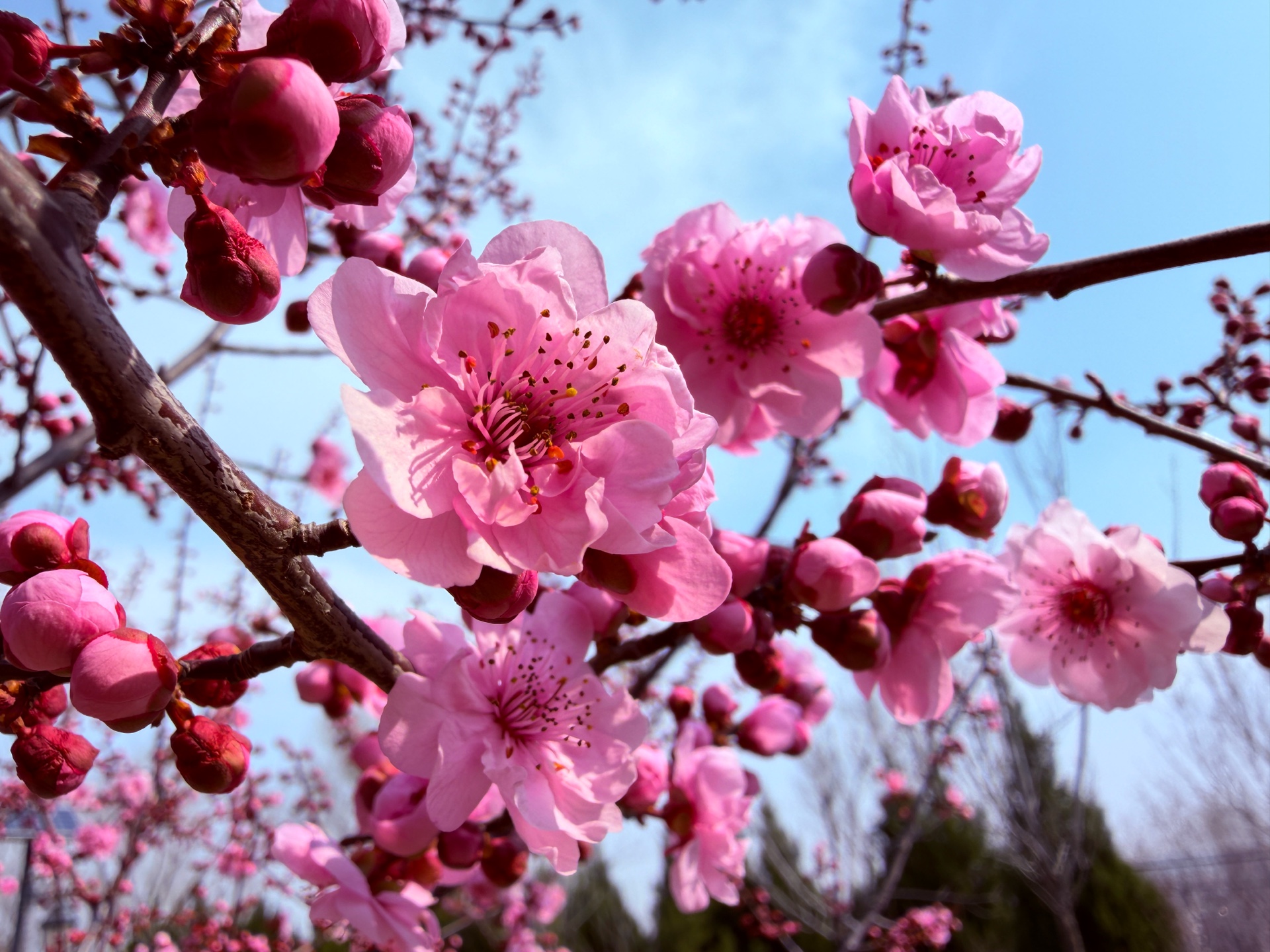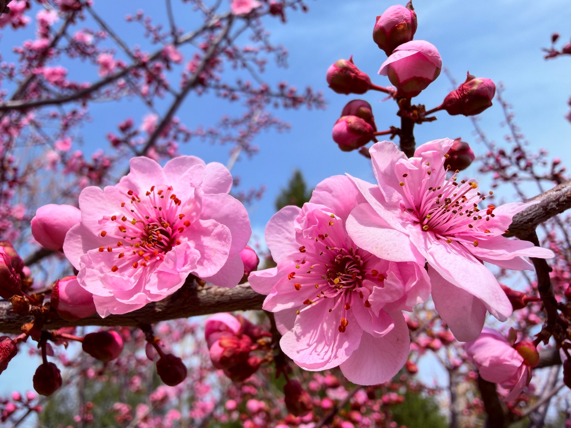 粉色的美人梅鲜艳动人,在蓝天下绽放着春天的气息。每一朵碧桃都充满了生机与活力,让人感受到大自然的美丽与神奇。