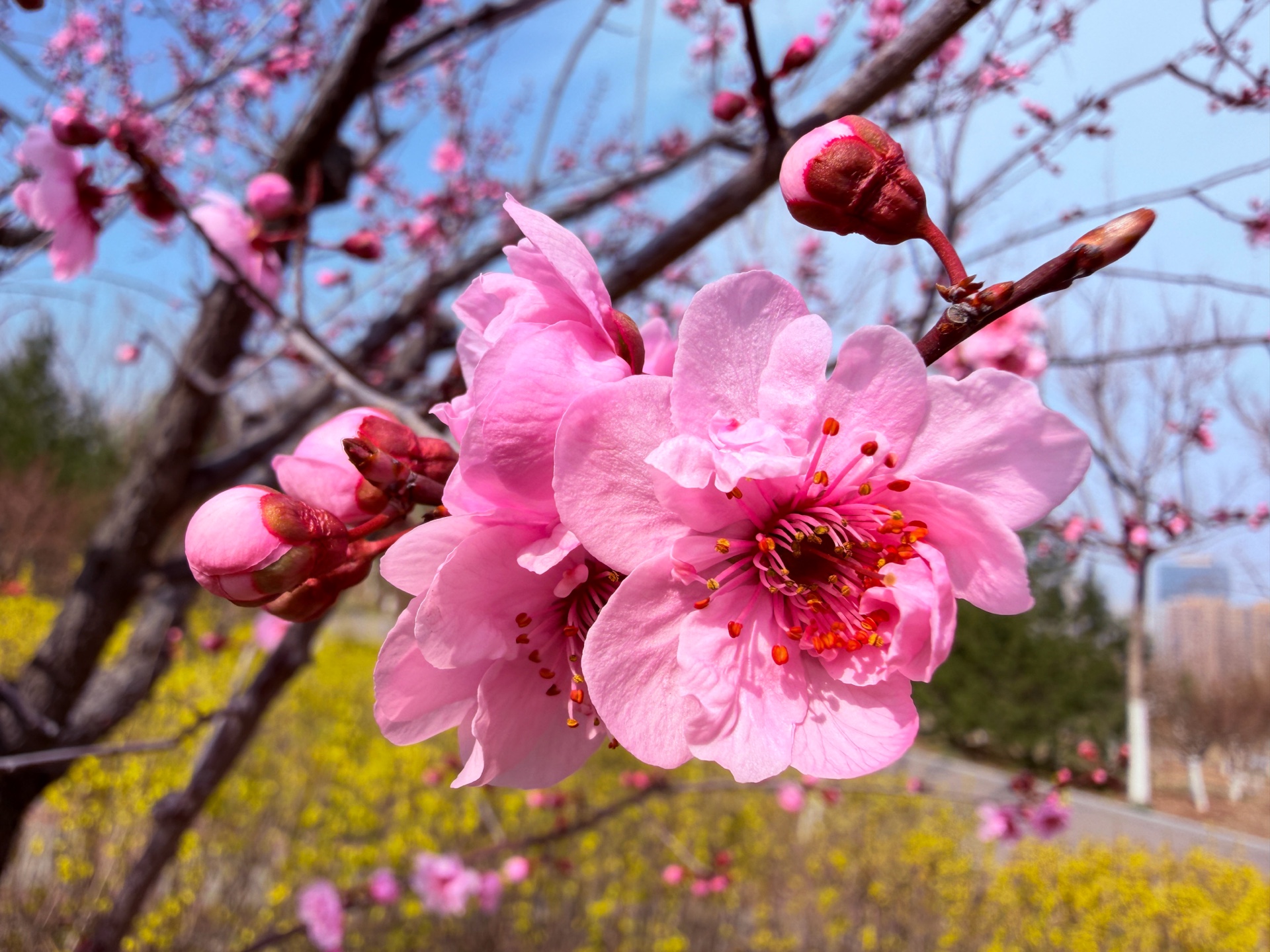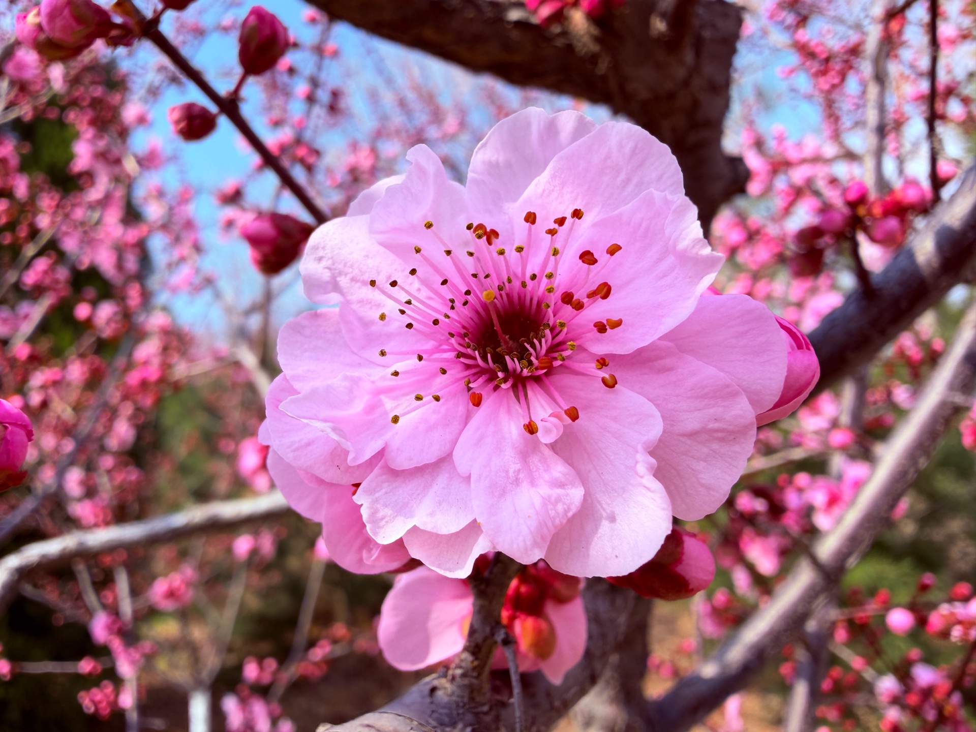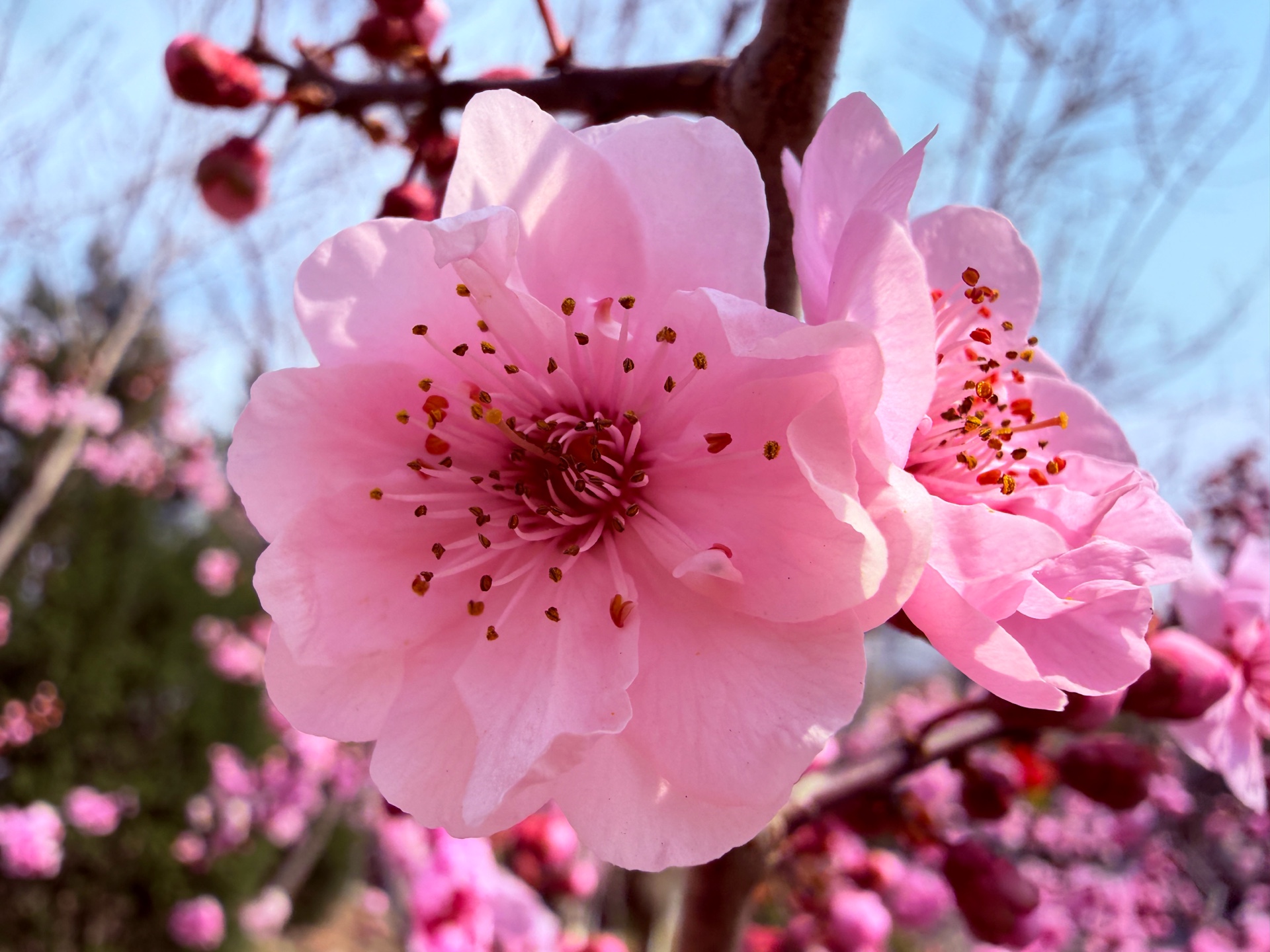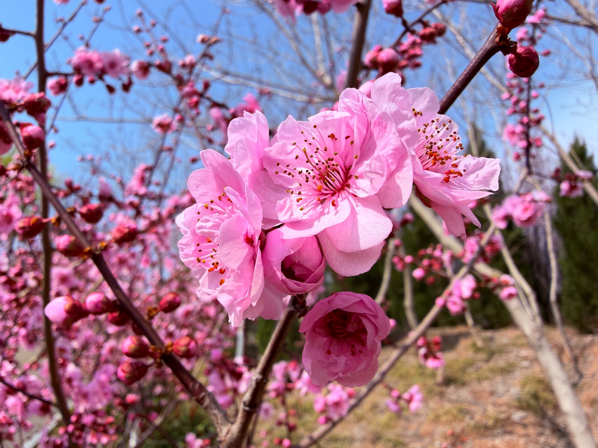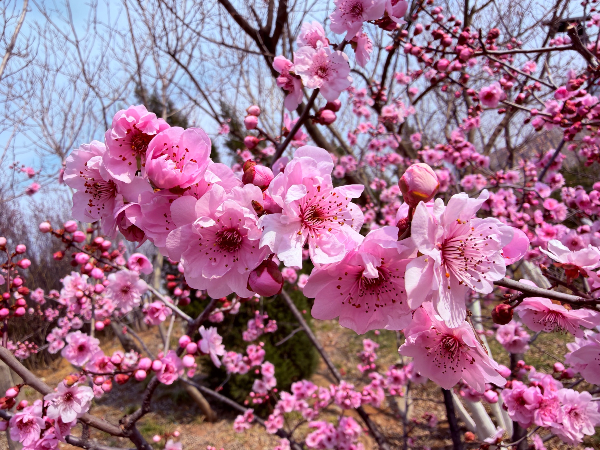 粉色的美人梅鲜艳动人,在蓝天下绽放着春天的气息。每一朵碧桃都充满了生机与活力,让人感受到大自然的美丽与神奇。