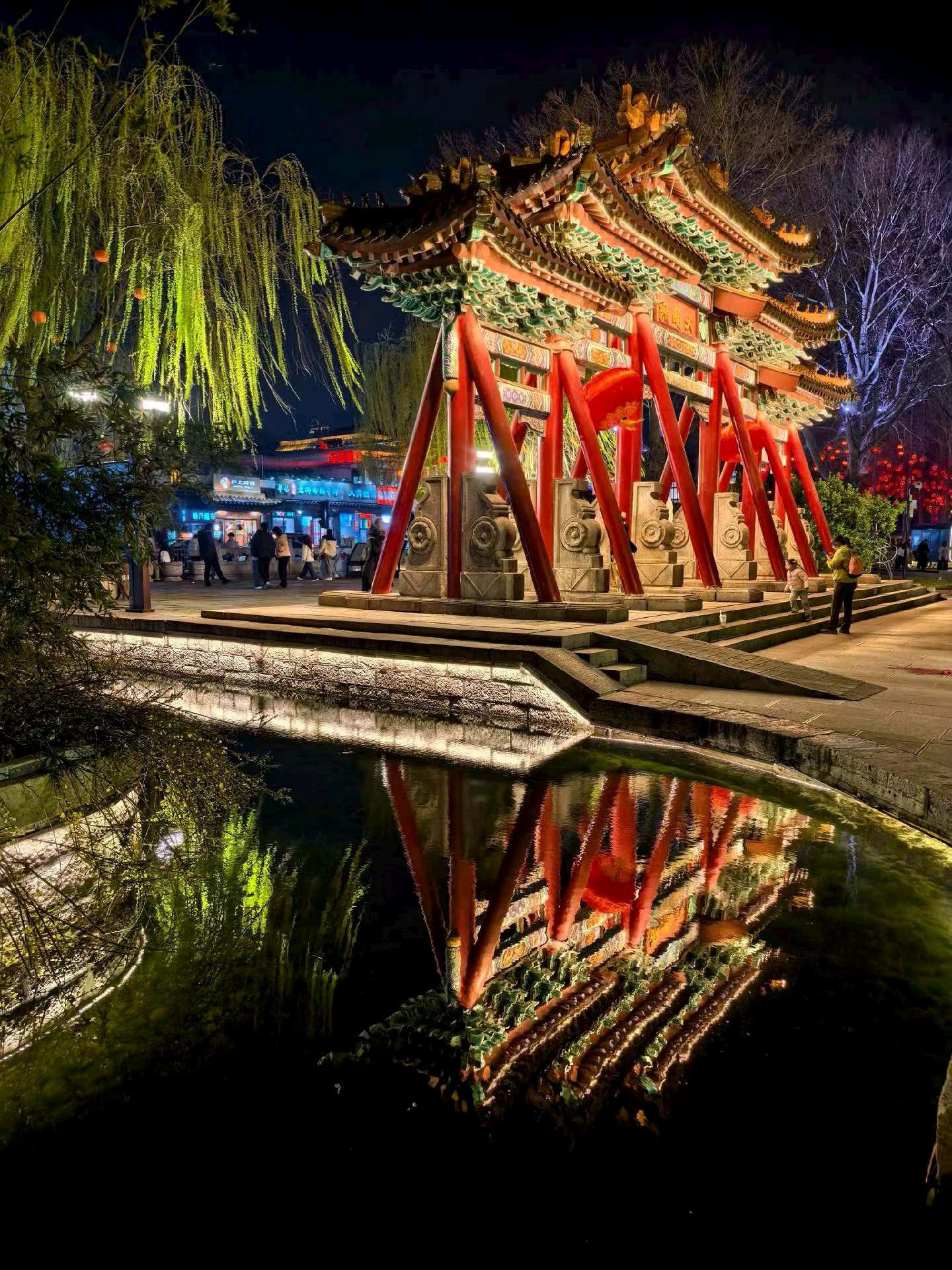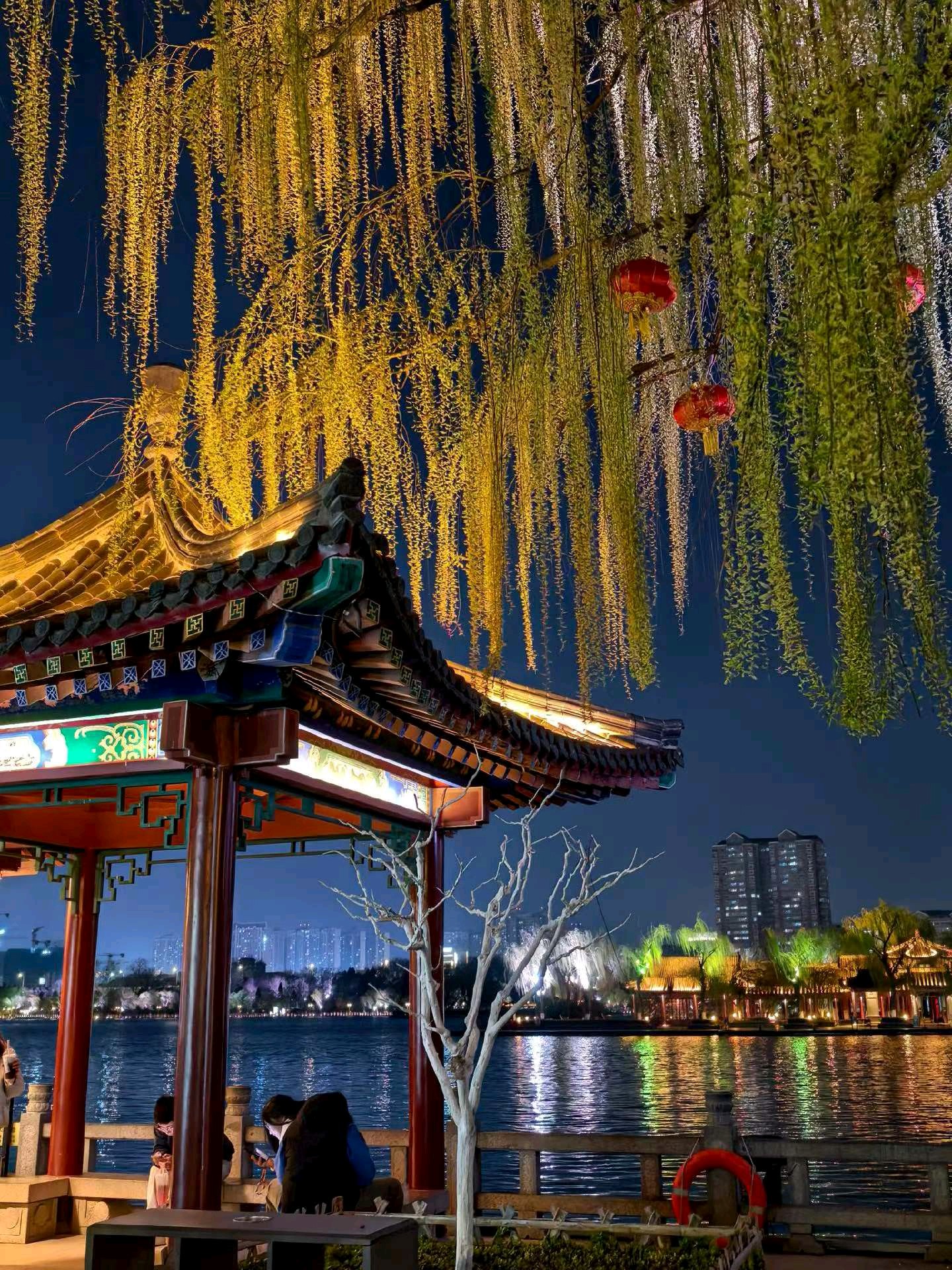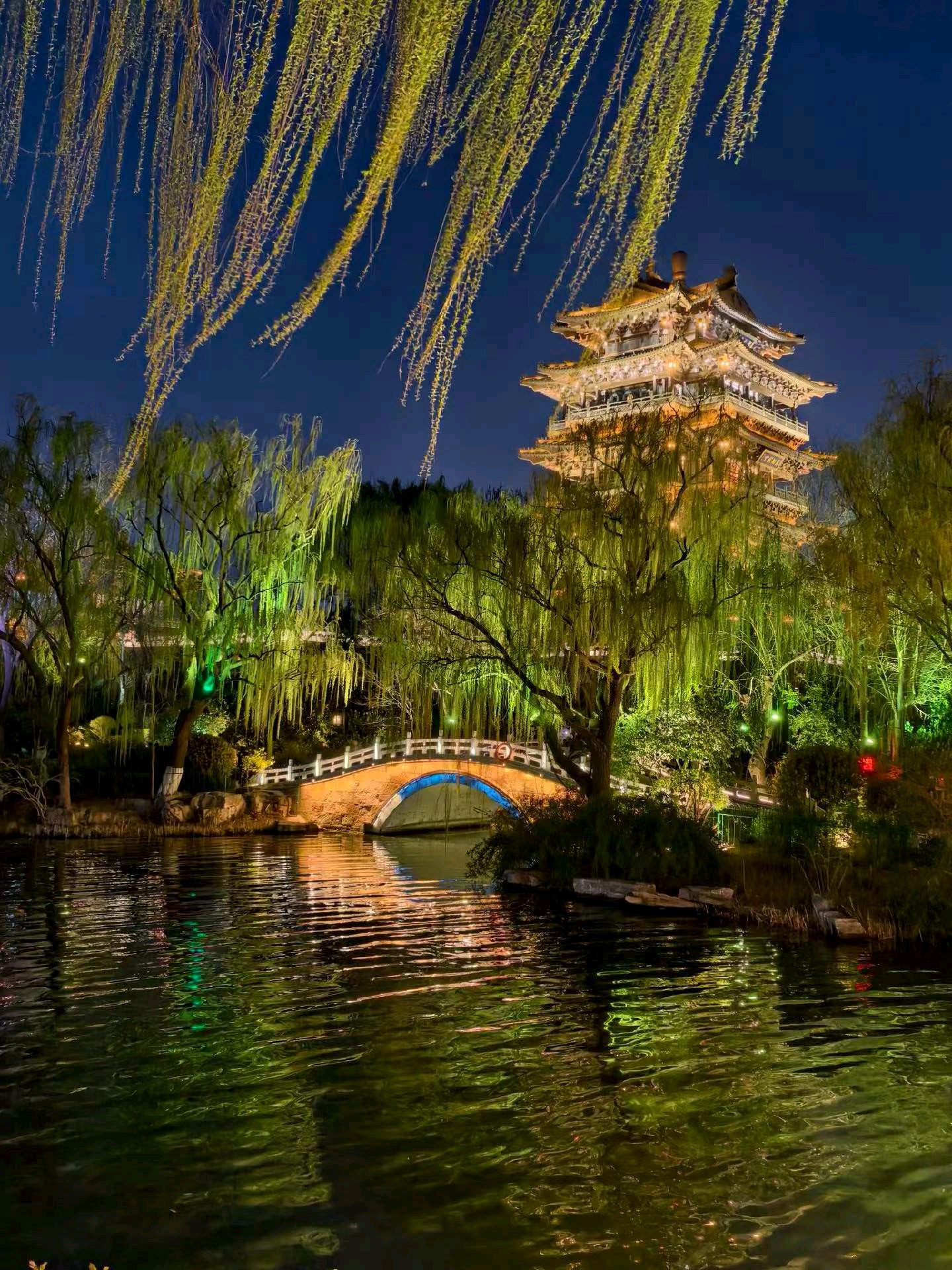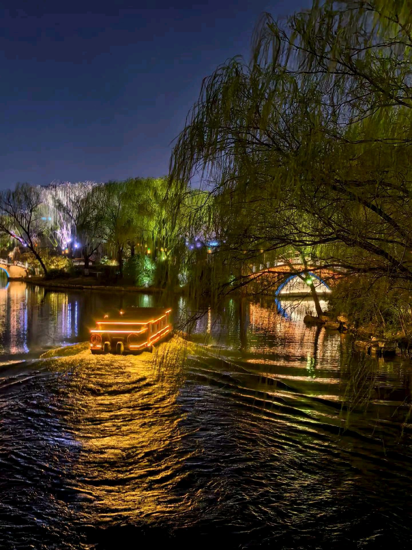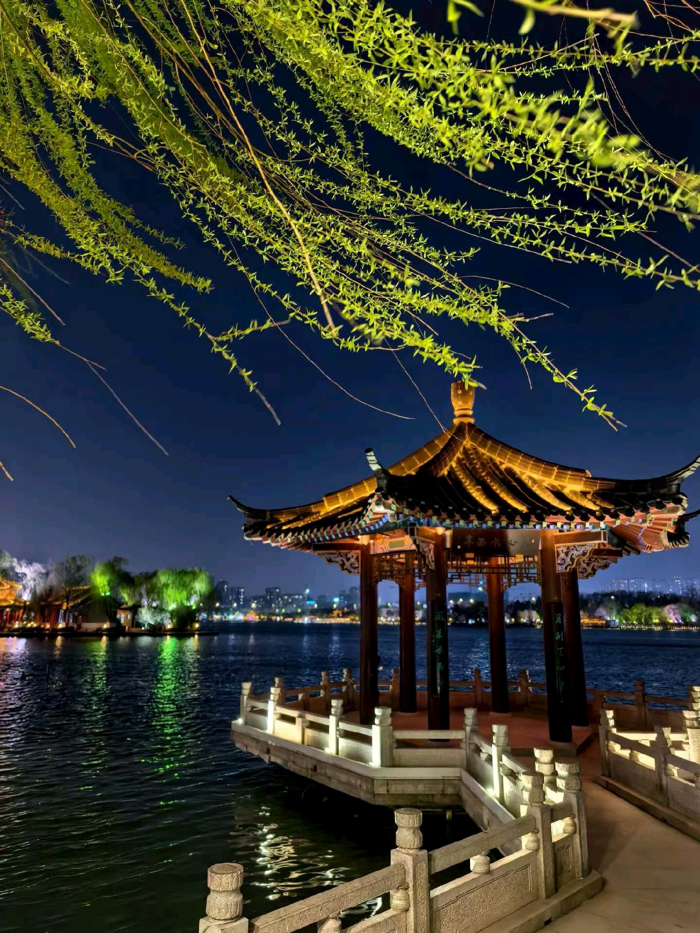春夜的大明湖,柳丝初绽鹅黄,在晚风里轻摇。超然楼的灯火倒映在墨色湖面,揉碎成一池流动的金光,那是春天在夜色中偷偷生长的气息。