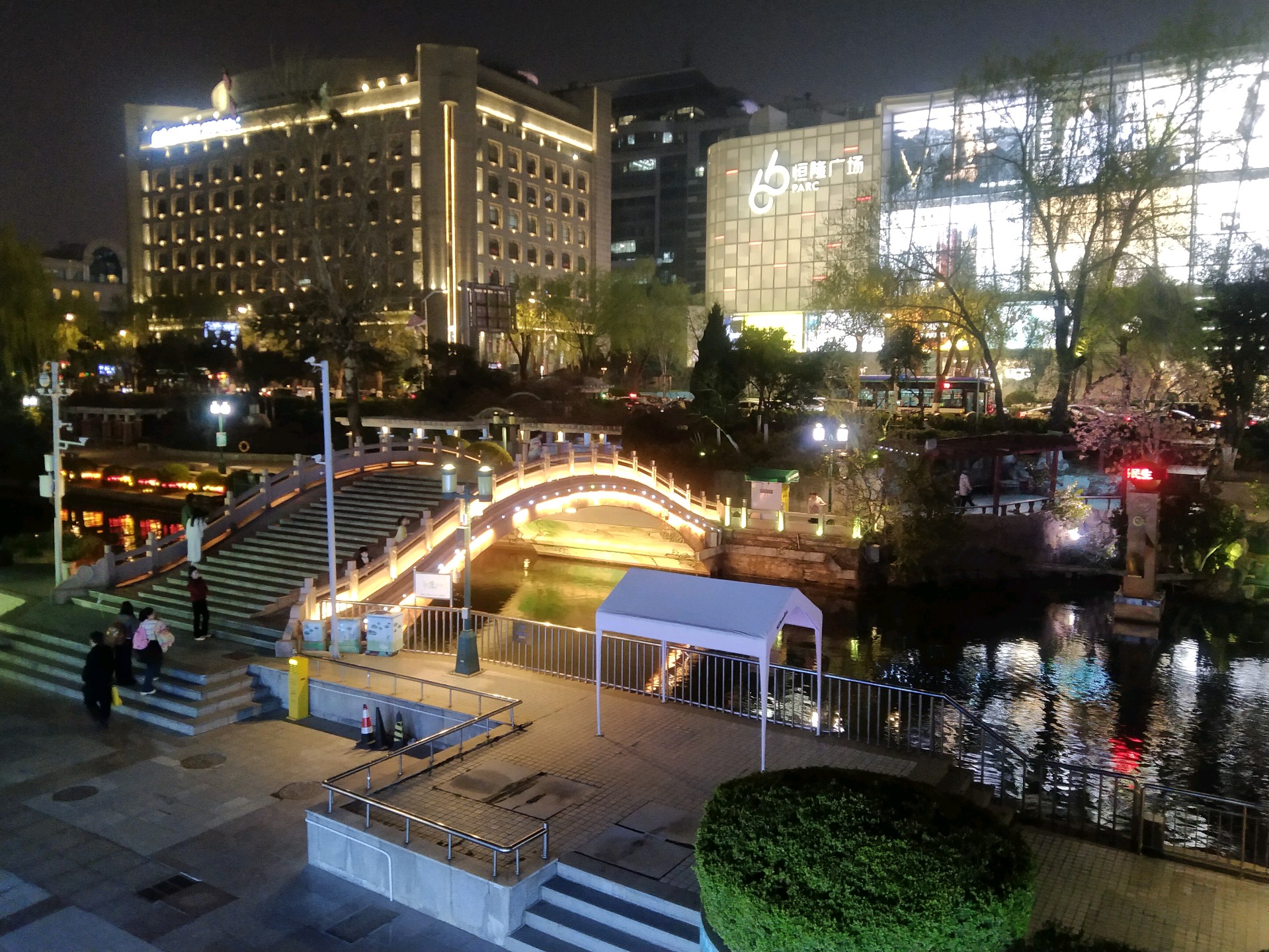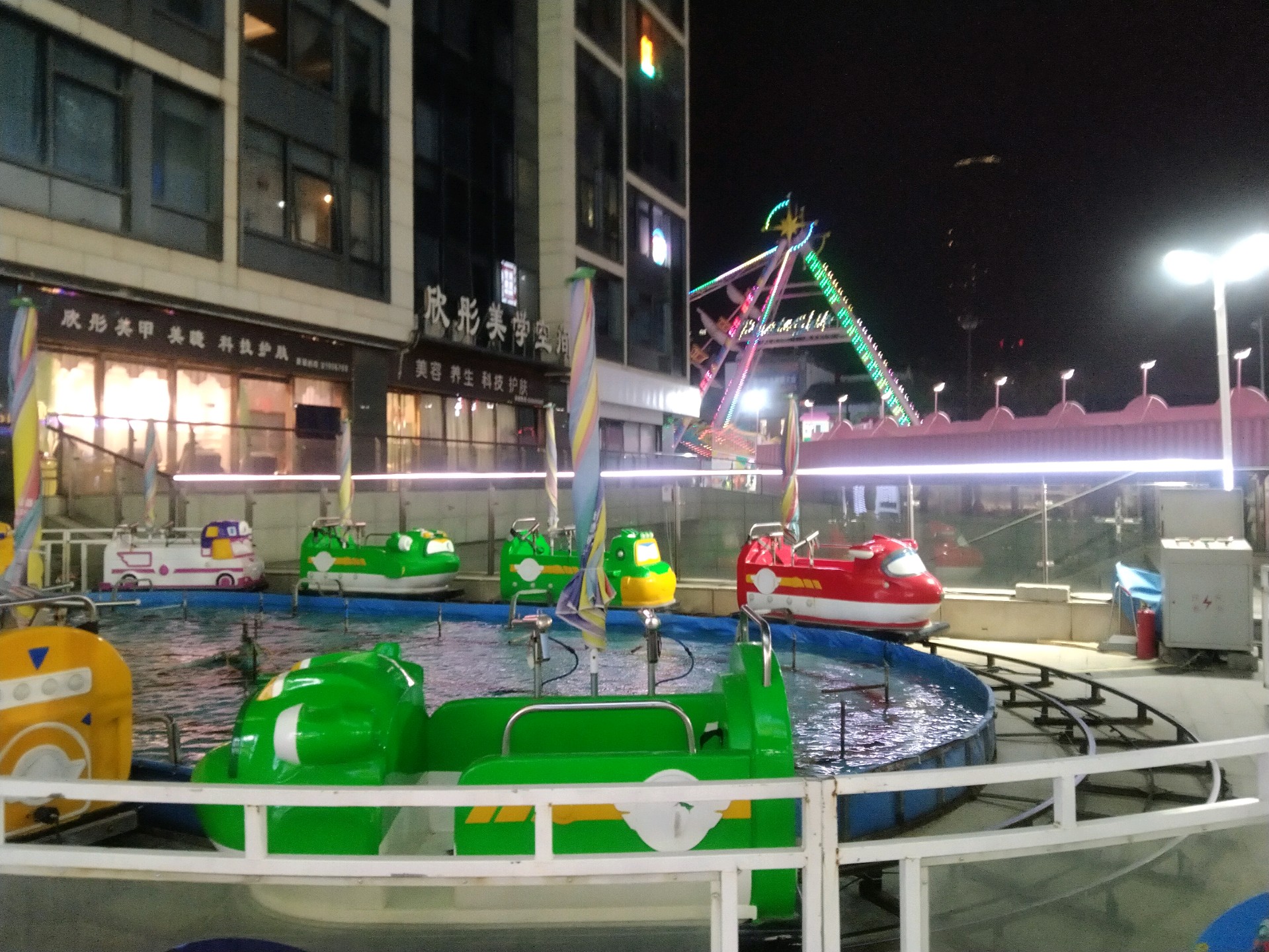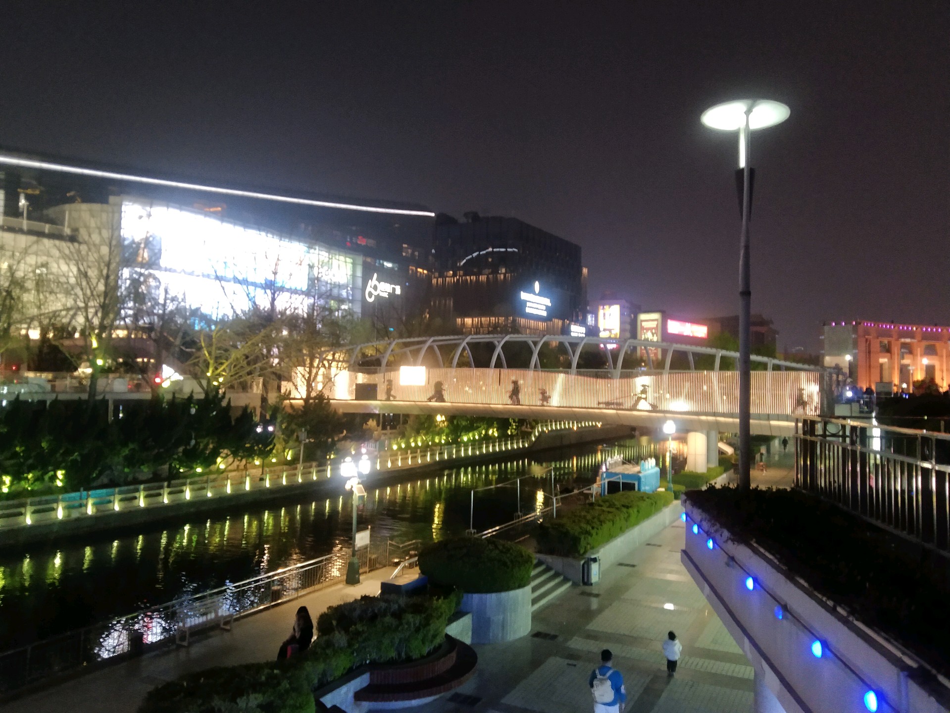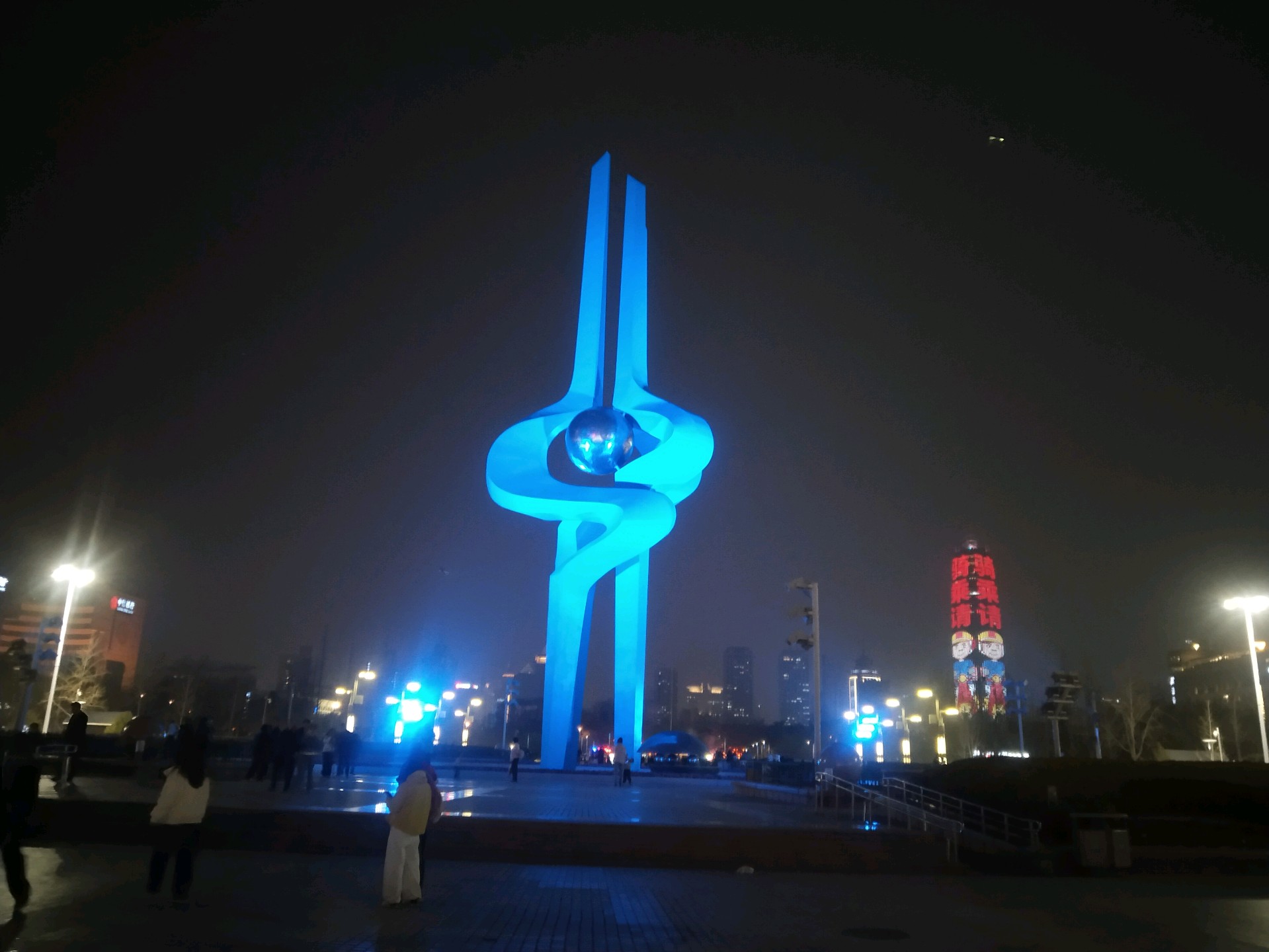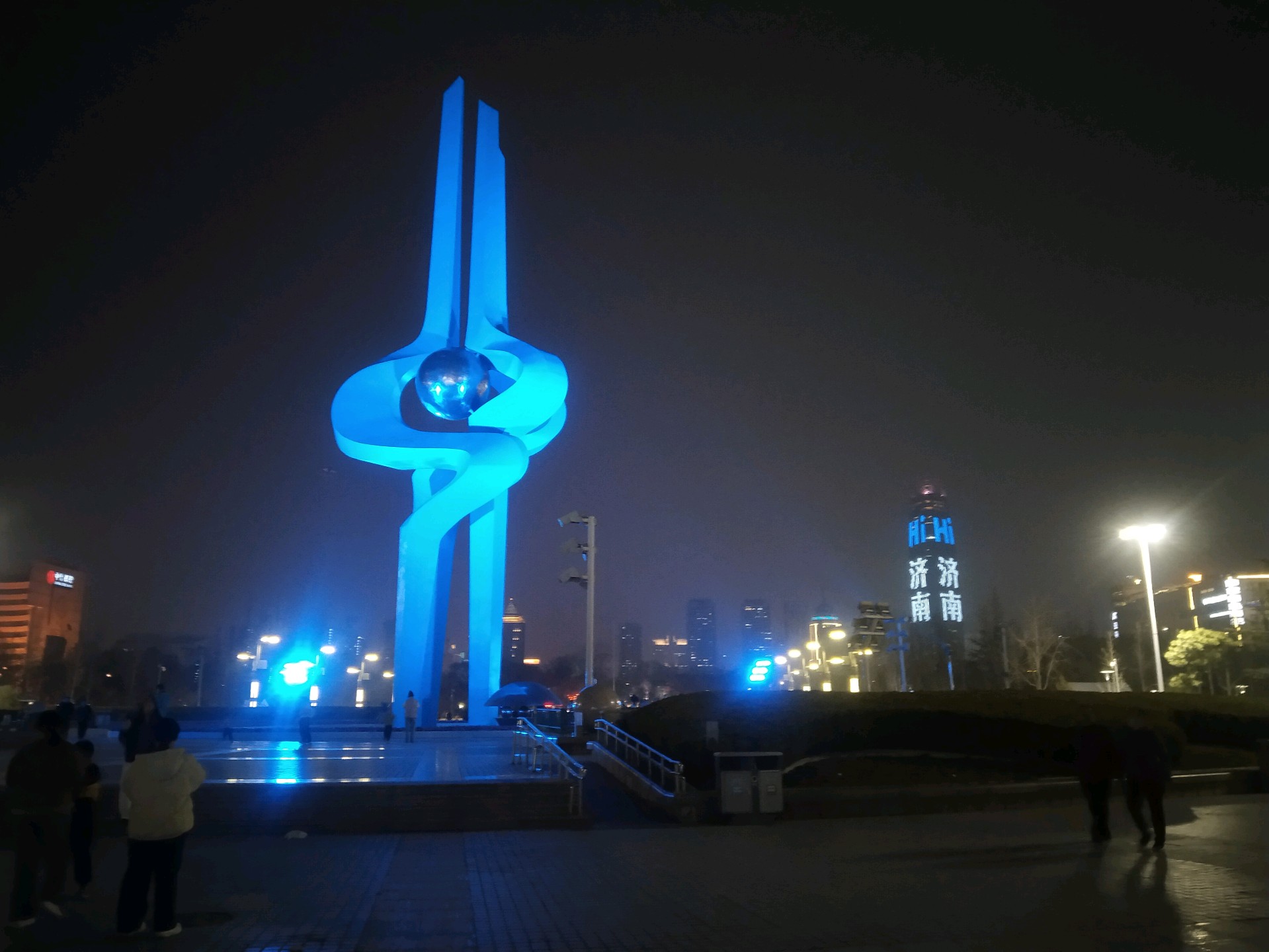 夜晚的城市广场,水蓝色的泉标高耸入云,周围灯光璀璨。人们在这里散步、拍照,享受着宁静的夜晚。