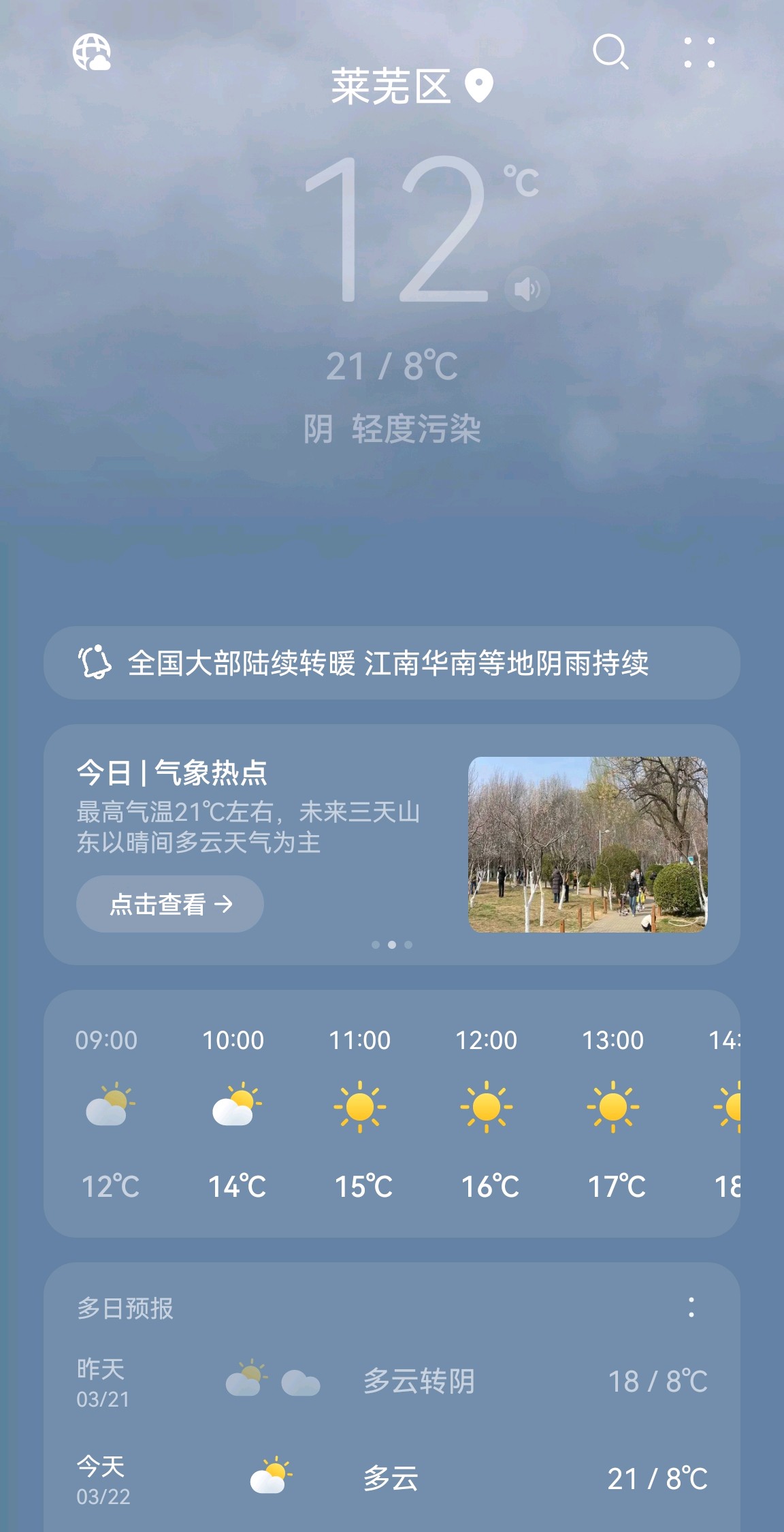 今晨莱芜区上空云层密布,暖阳暂隐,晨间气温为12℃。据气象预报,上午11时前后云层渐散、天气转晴,全天气温区间在8℃至21℃,昼夜温差较为明显,出行可灵活增减衣物。